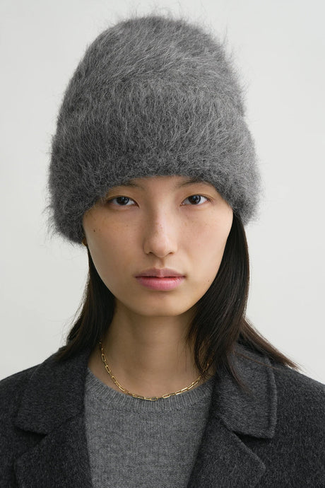 TOTEME-lue i en myk alpakkablanding med melange-effekt, designet som en del av et varmende vinterskjerf-sett. Luen kan brukes med oppbrettet kant eller i full lengde for en mer avslappet stil.