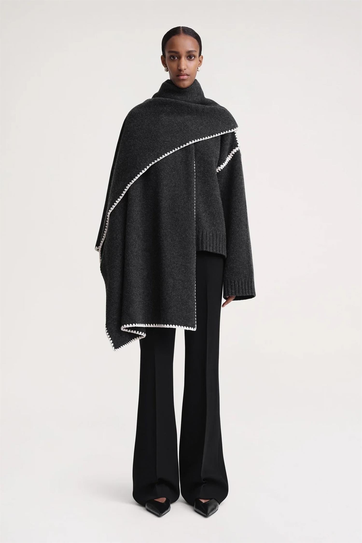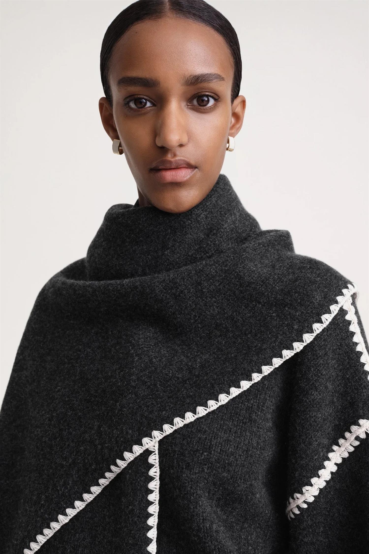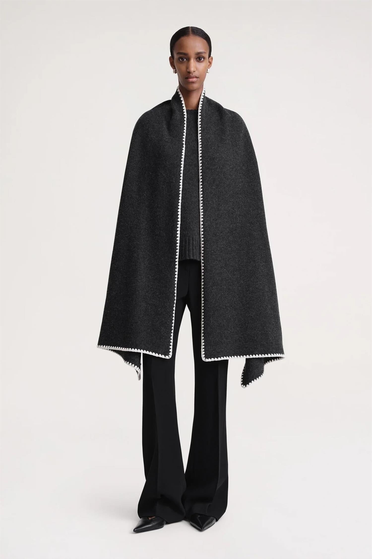 Stort og varmt skjerf fra Toteme som er inspirert av deres signatur-kåpe Embroidered Scarf Jacket. Drapér dette skjerfet over skuldrene i overgangssesongene og bruk det i vintermånedene til kåper.