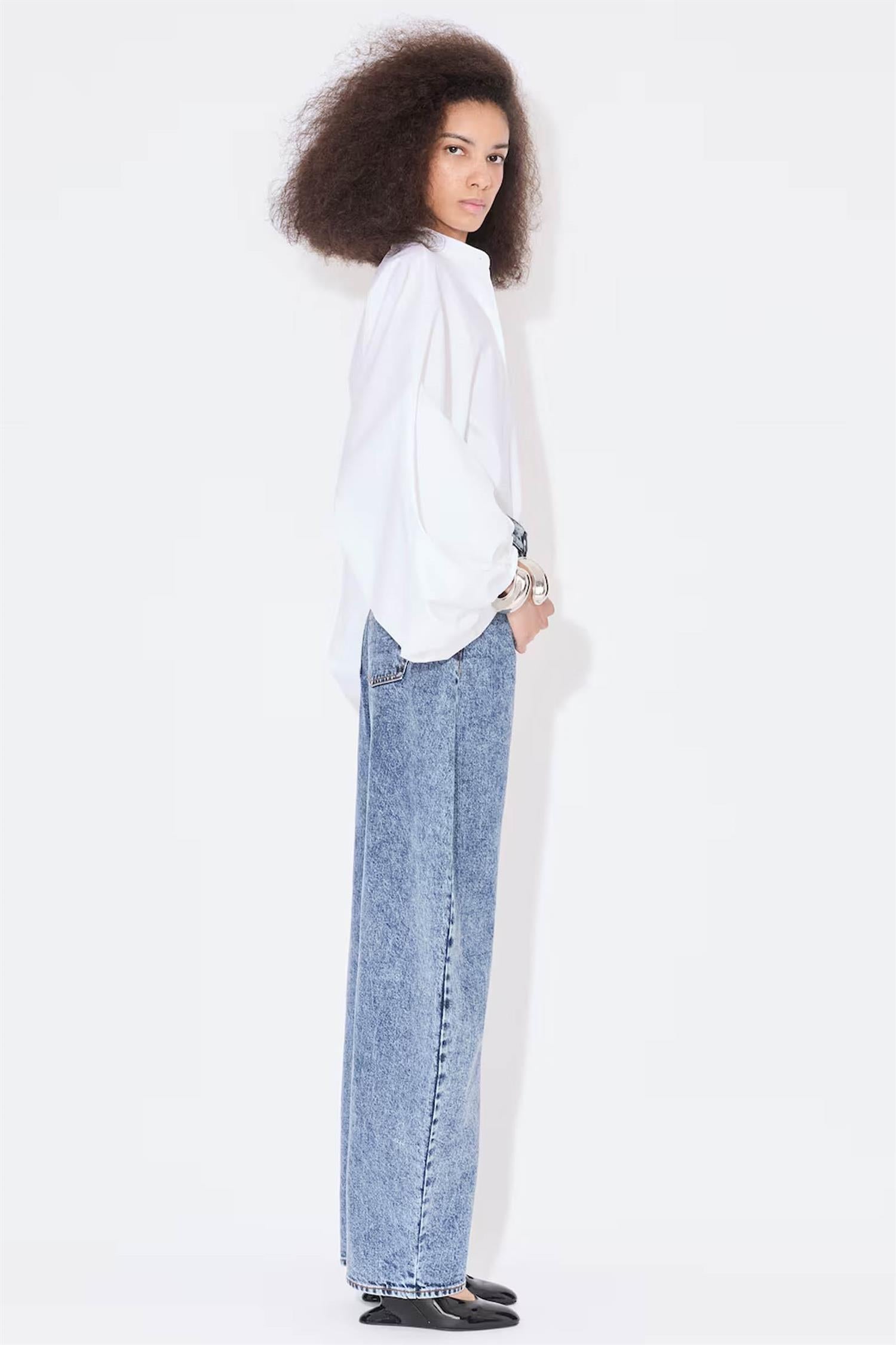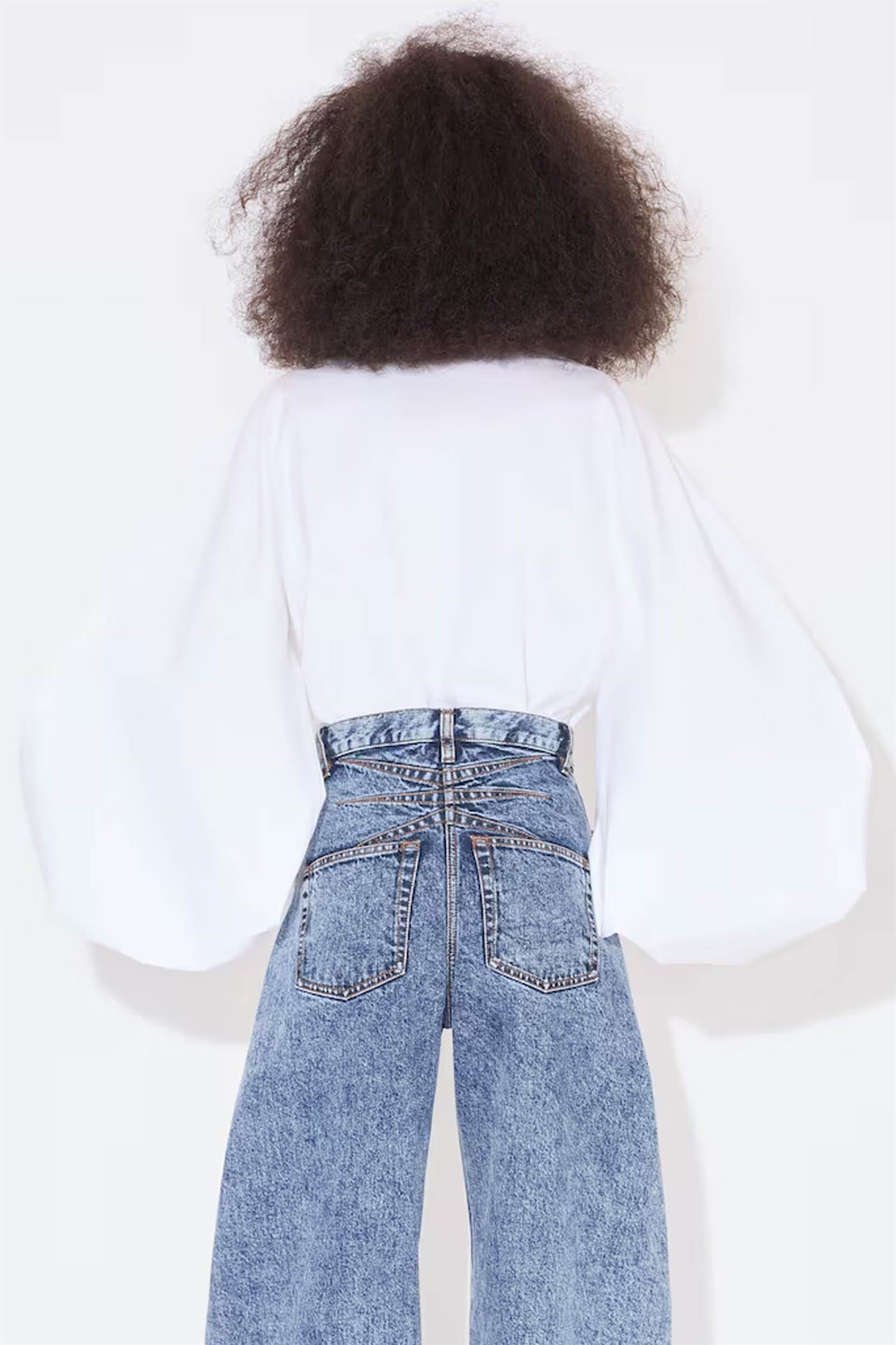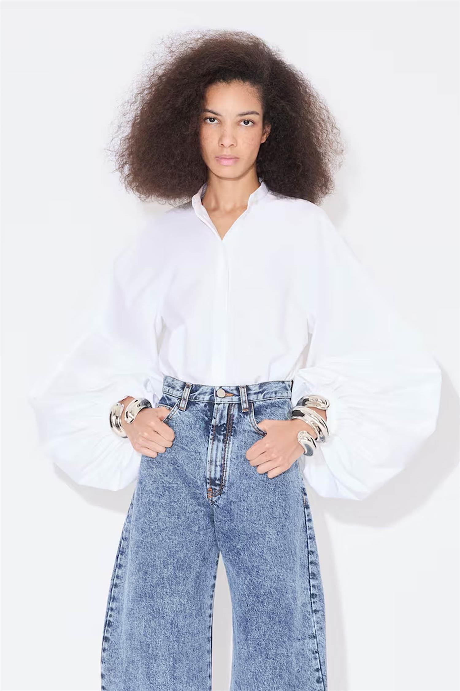 Denne skjorten i bomullspoplin kombinerer tidløs stil med en moderne vri. De voluminøse ballongermene, samlet ved håndleddene, gir en dramatisk og feminin silhuett, mens den enkle bandkragen tilfører et subtilt, sofistikert preg.