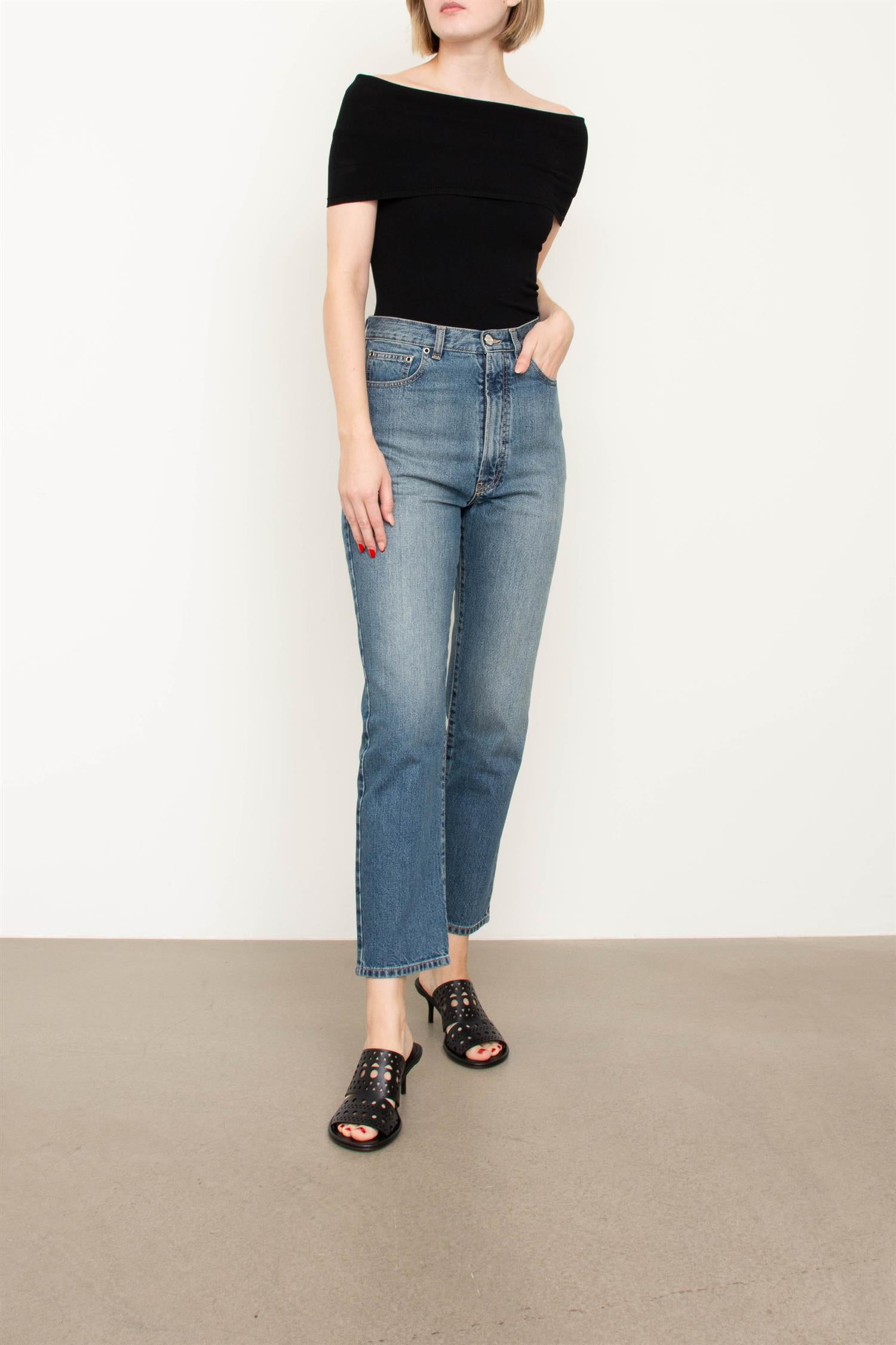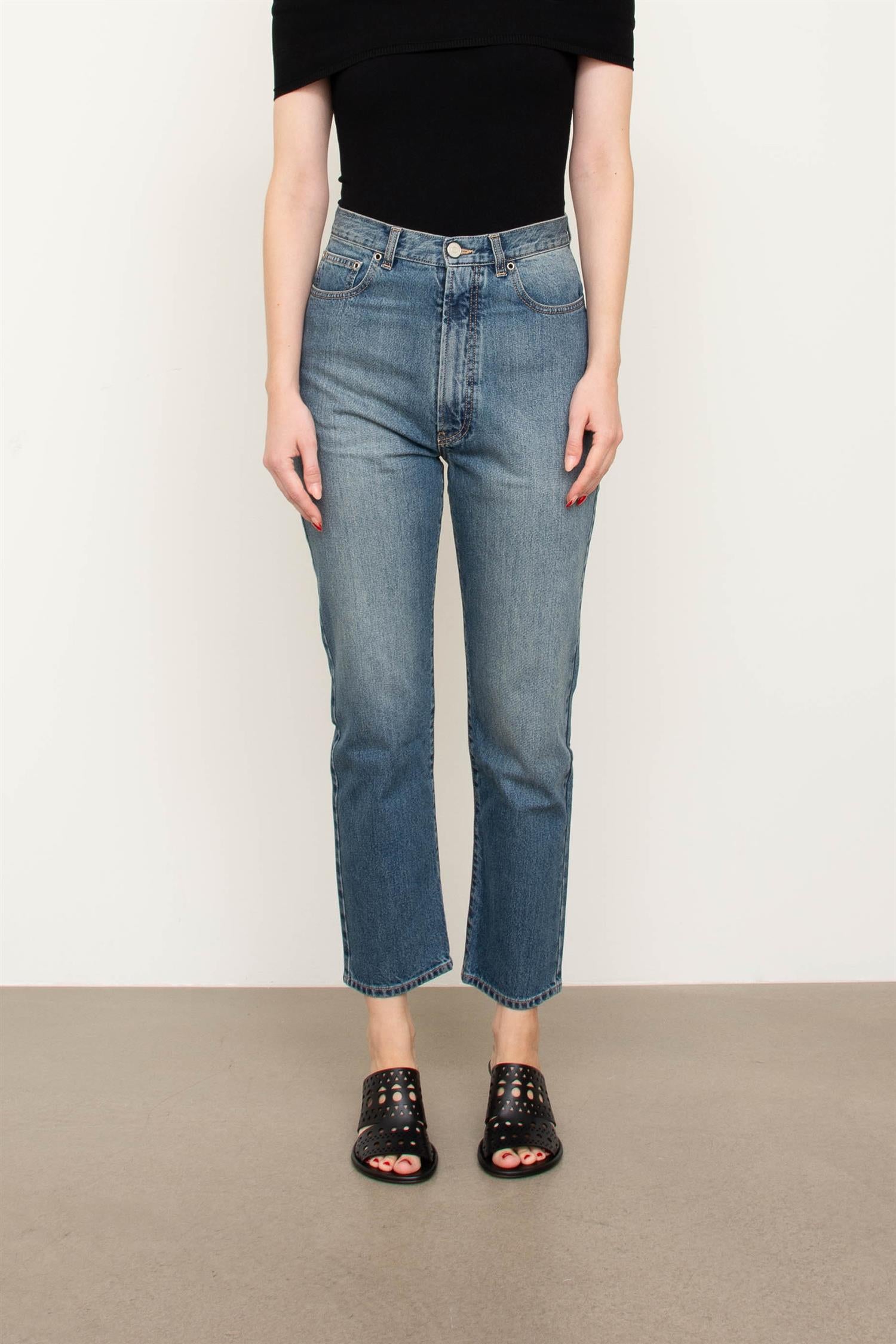 Klassiske jeans fra Alaïa med høyt liv og rette, smale ben. Som alle plaggene fra merket er designet nøye planlagt - legg merke til sømmene bak som gir en flatterende effekt. Den klassiske blå fargen passer med alt i skapet.