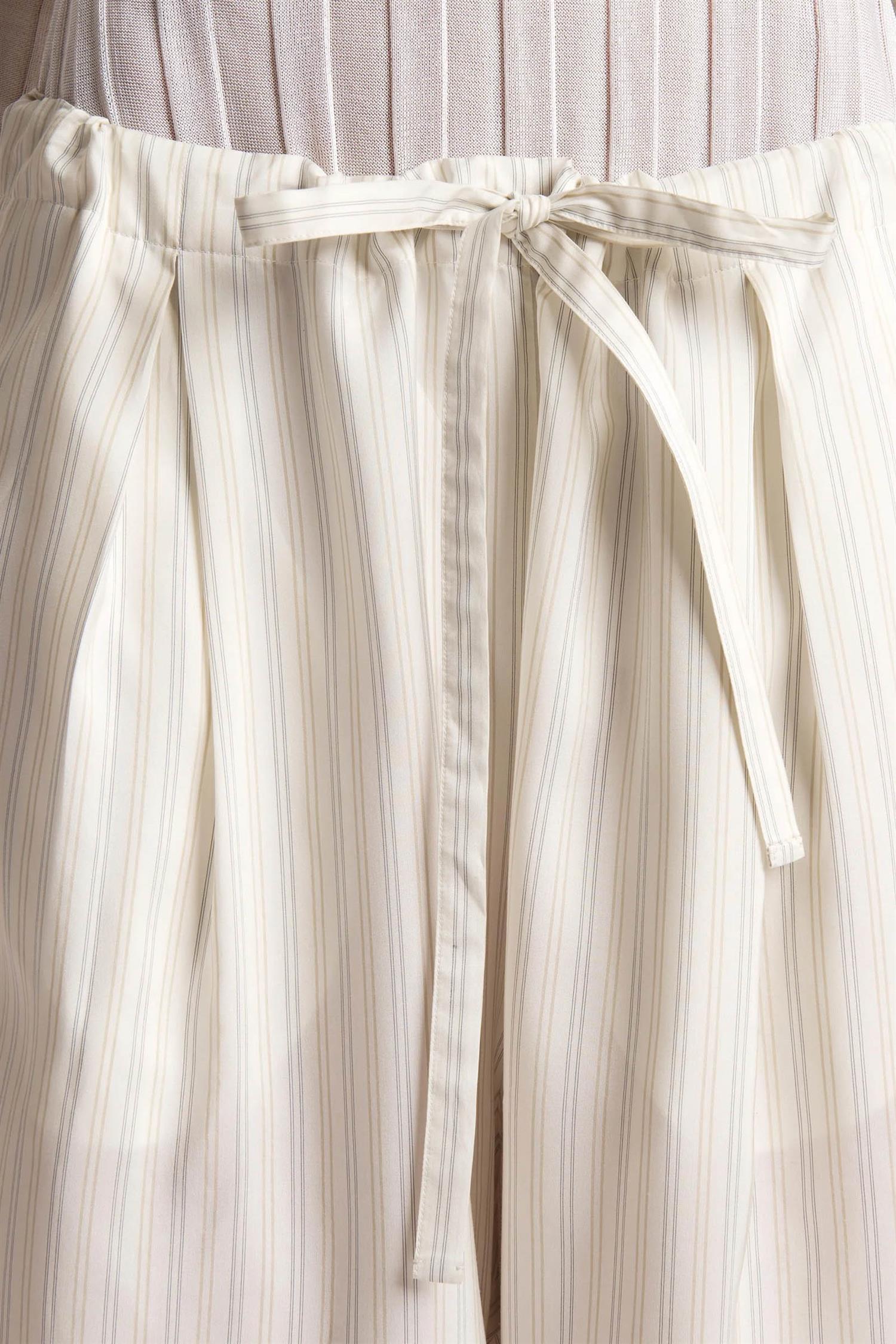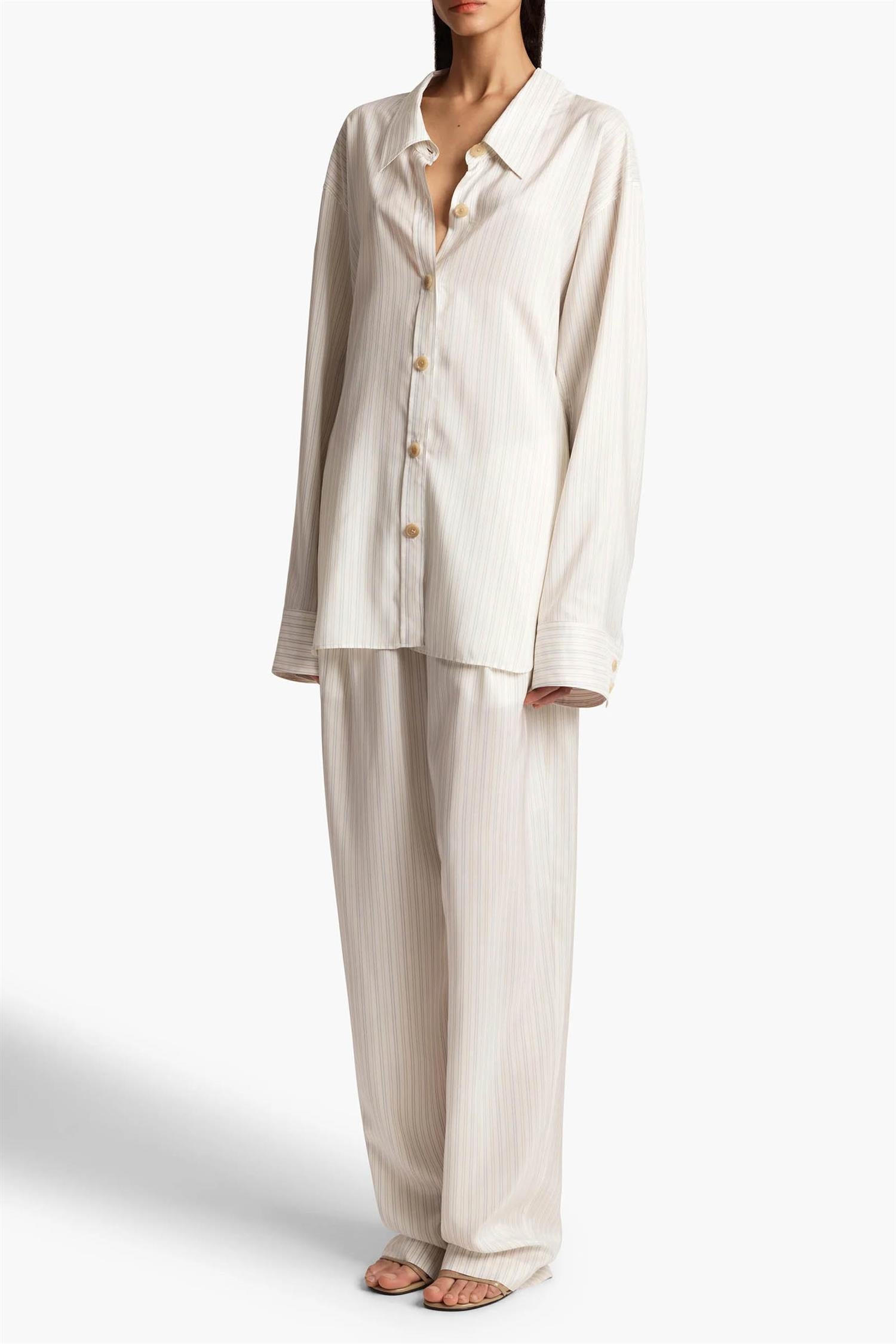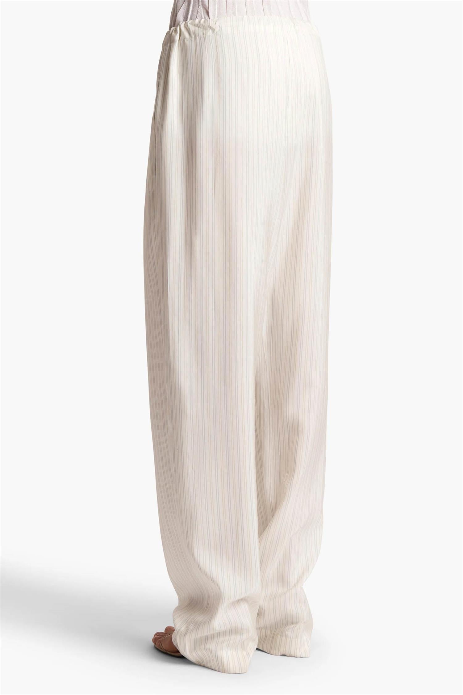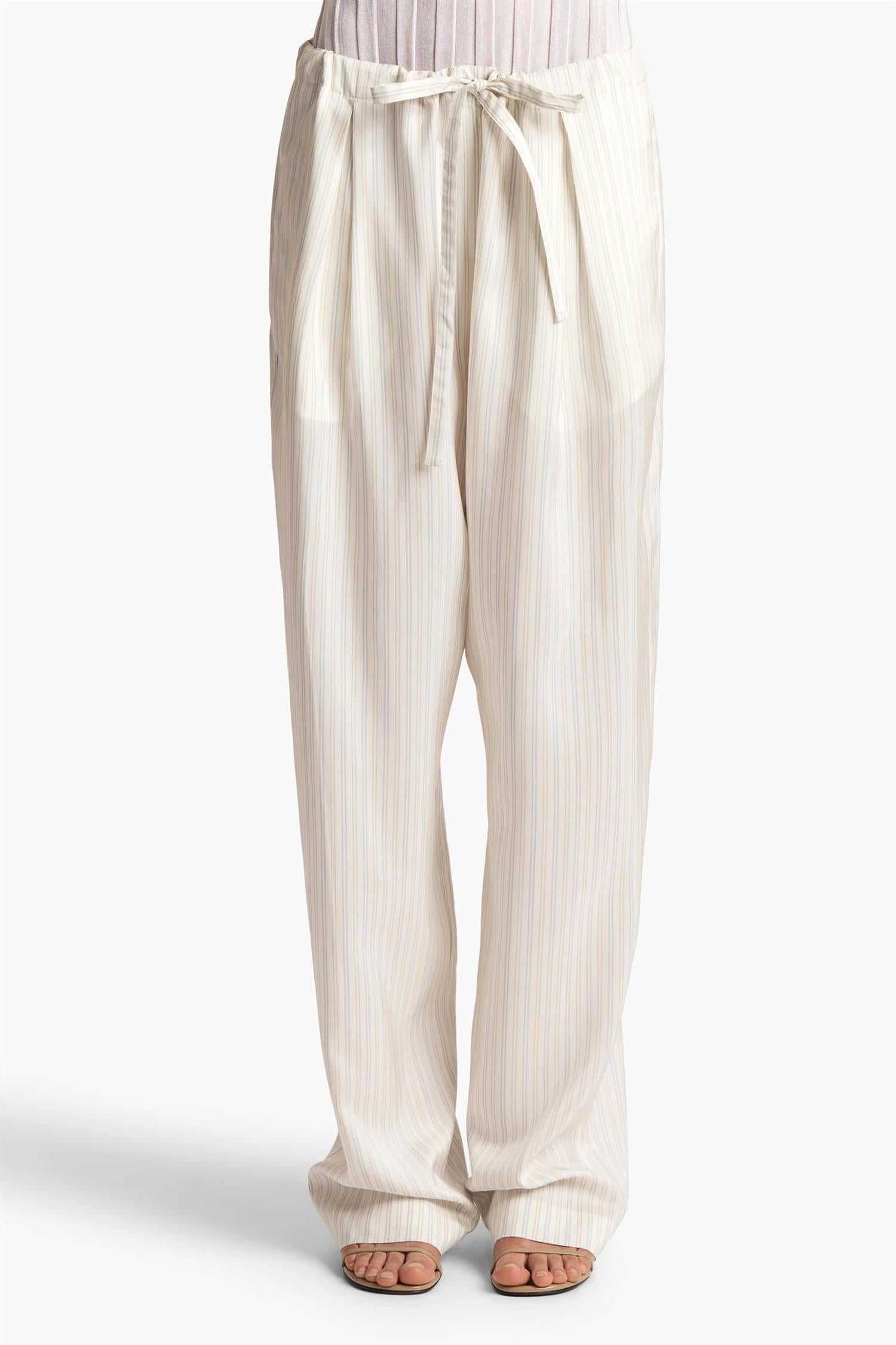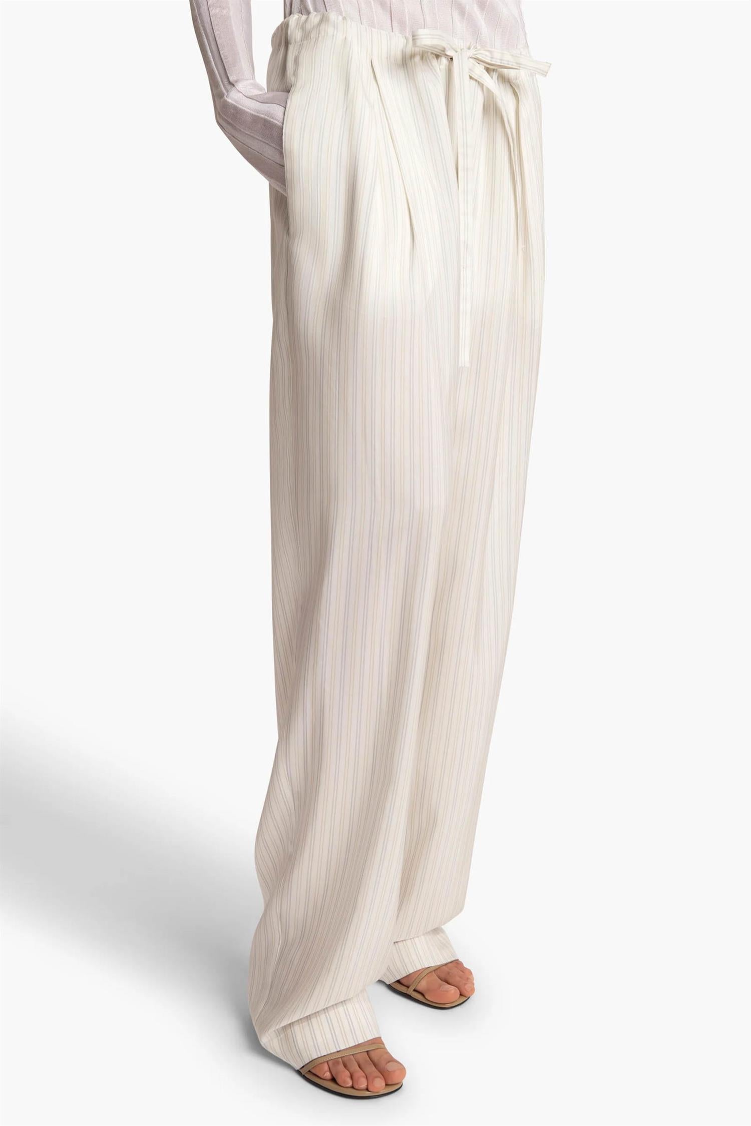 Avslappede bukser i stripet silkeshirting fra Khaite, med legg foran og en myk, flytende silhuett. Designet i nøytrale toner med raffinert glans, og en komfortabel midje med maljer og snøring. Fullført med diskrete stikklommer i sidene.