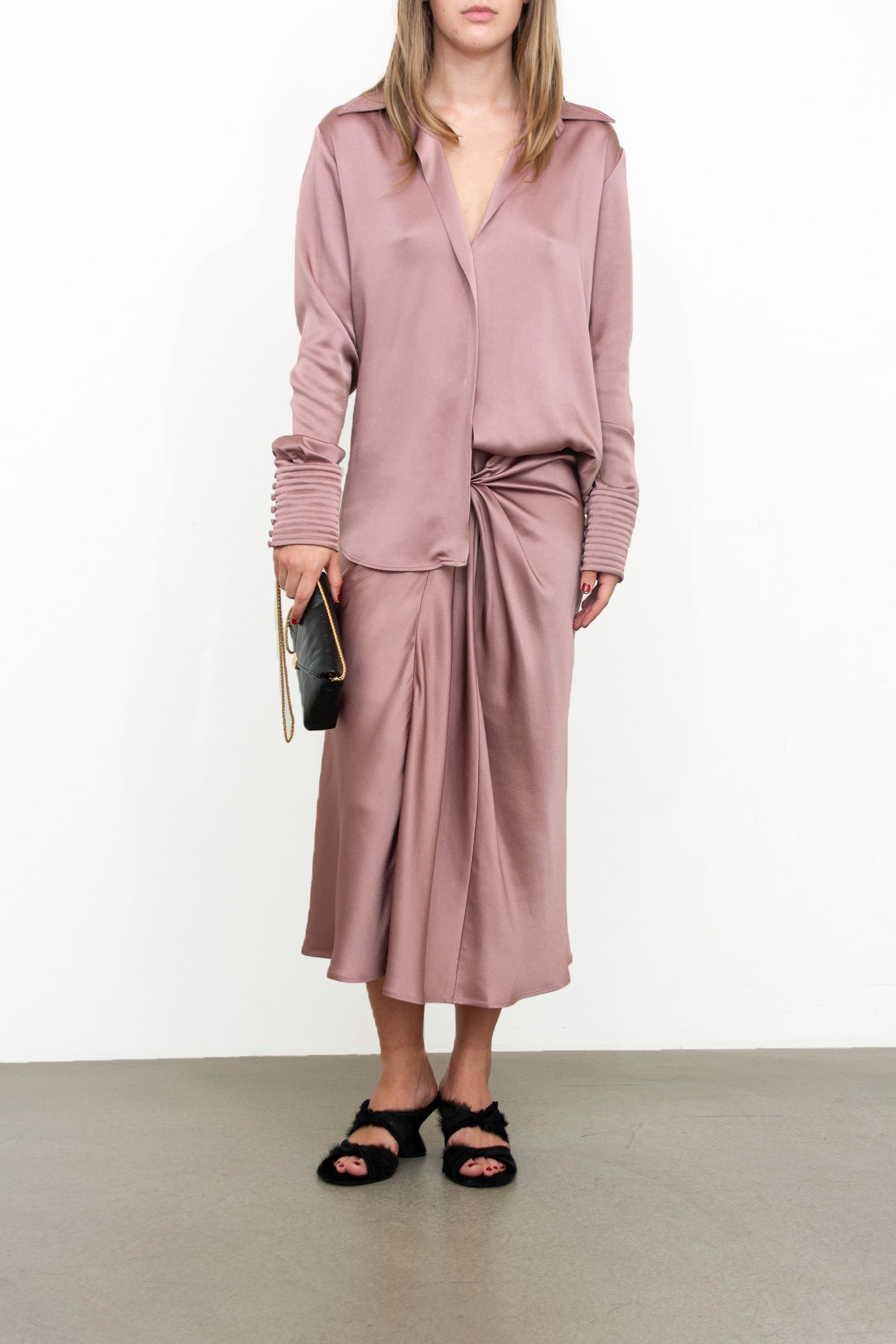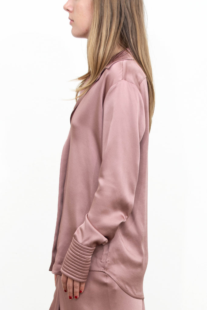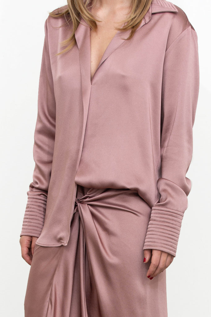 Fluid satin shirt fra Dries Van Noten. Denne skjorten har en delvis åpen knappestolpe som elegant fremhever utringningen. Den har dekorative, geometriske sømmer på krage og mansjetter. Den løse passformen gir et avslappet, men sofistikert uttrykk.