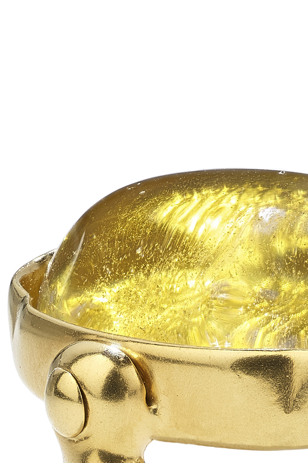Gullbelagt ring utsmykket med en bergkrystall. Krystallen er farget for hånd og har derfor sitt unike preg. Denne vakre ringen er et blikkfang og har et moderne preg samtidig med antikke detaljer.