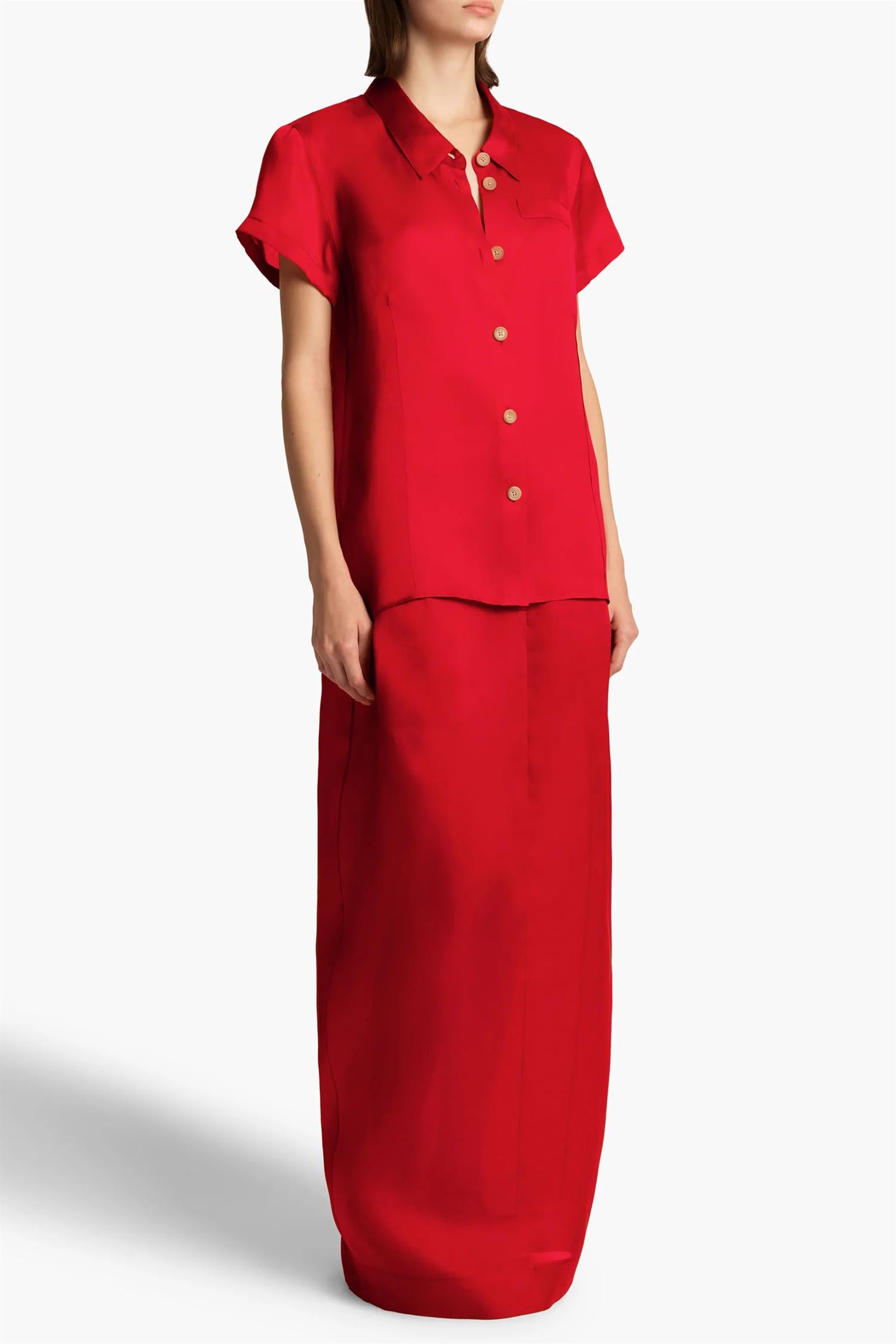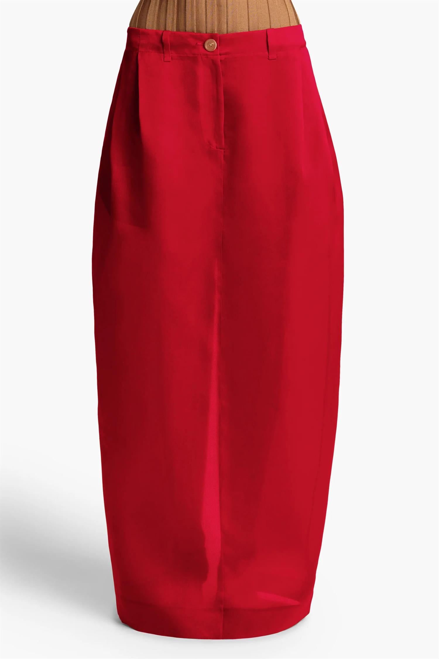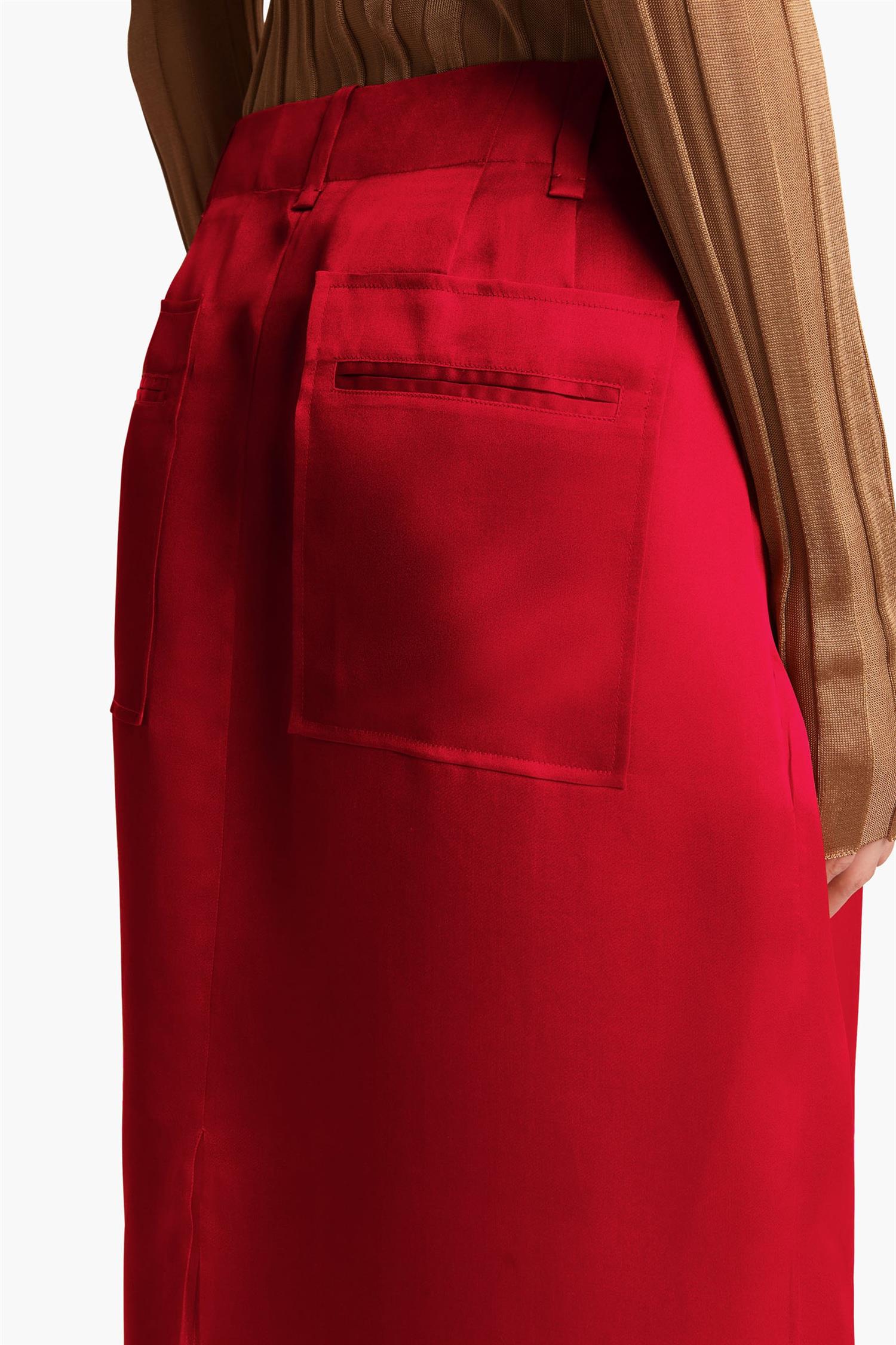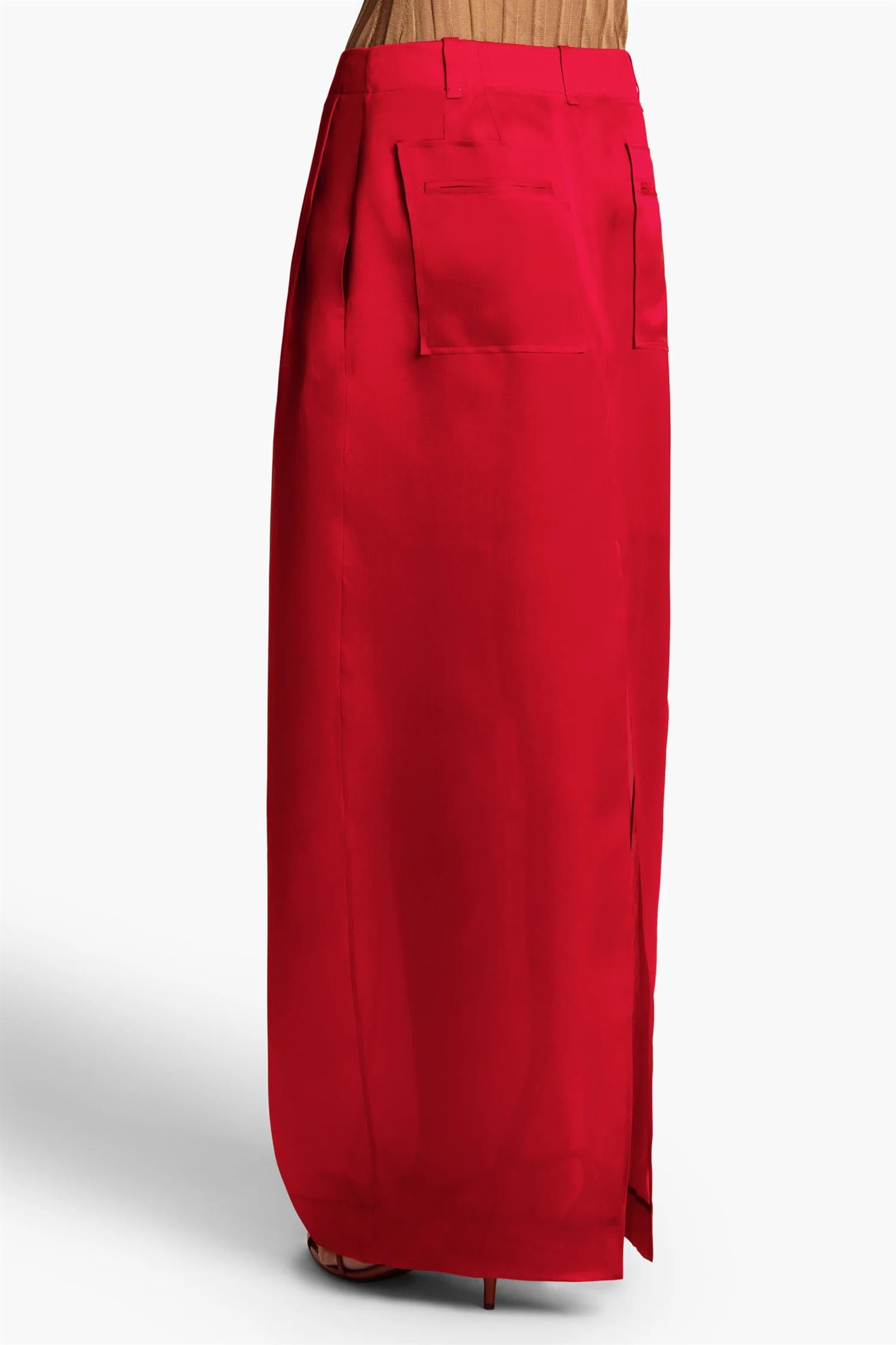 En lang, plissert skjørt i skarp silk organza. Buksesnitt i linningen med glidelås og knapp. Sidelommer i sømmen, passepoilerte påsydde lommer og splitt bak.