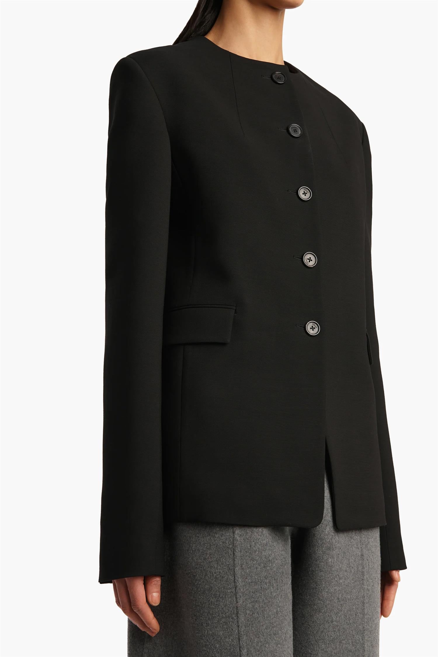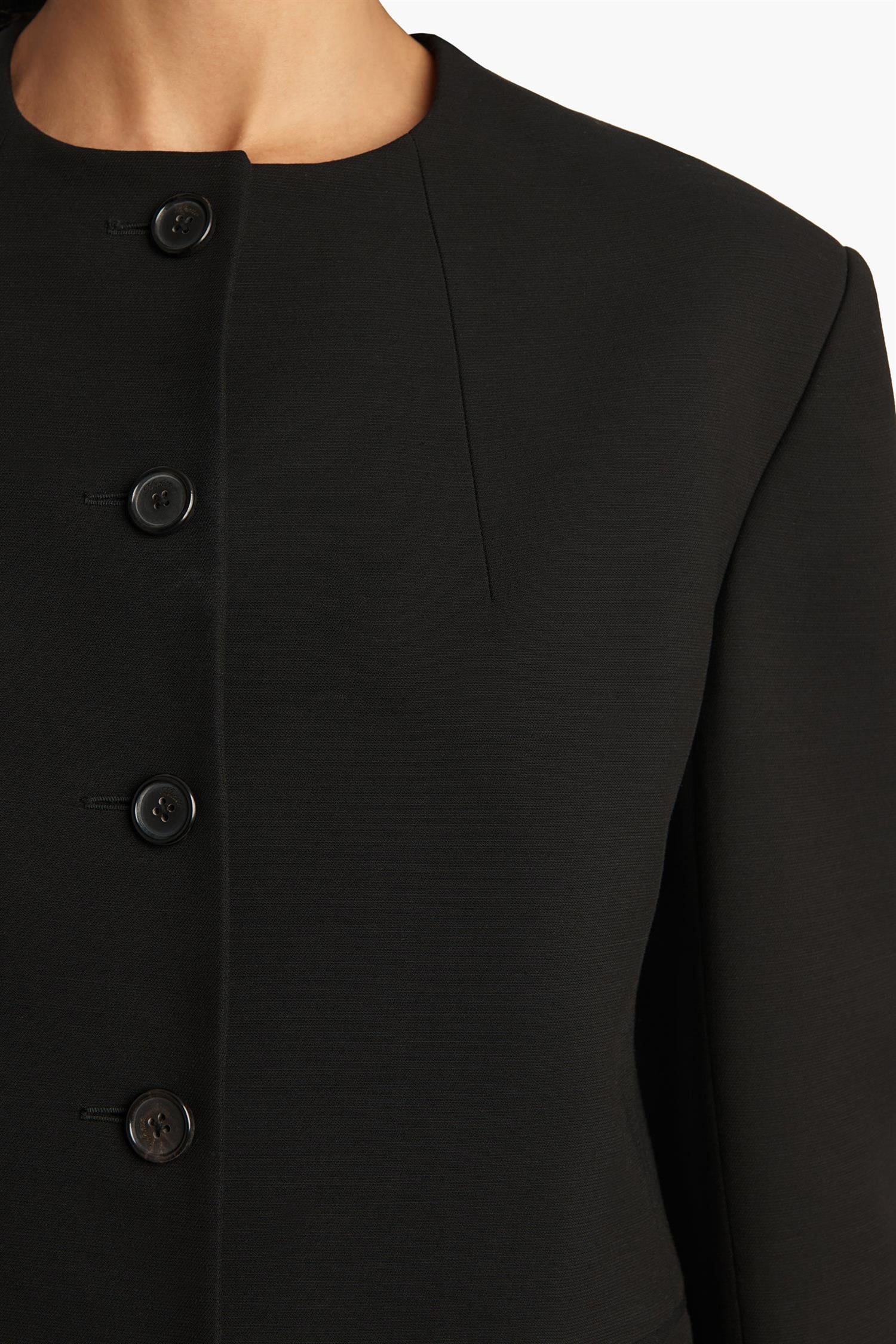 Skeddersydd jakke fra Khaite i en ull- og viscose- blanding. Jakken er krageløs i ren siluett med raffinerte detaljer. Diagonale skuldersømmer, subtile skulderputer og polstrede lommer. Jakken er foret med en myk cupro twill.