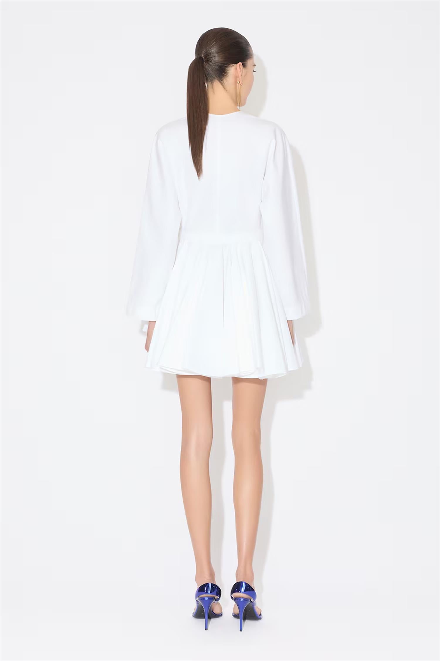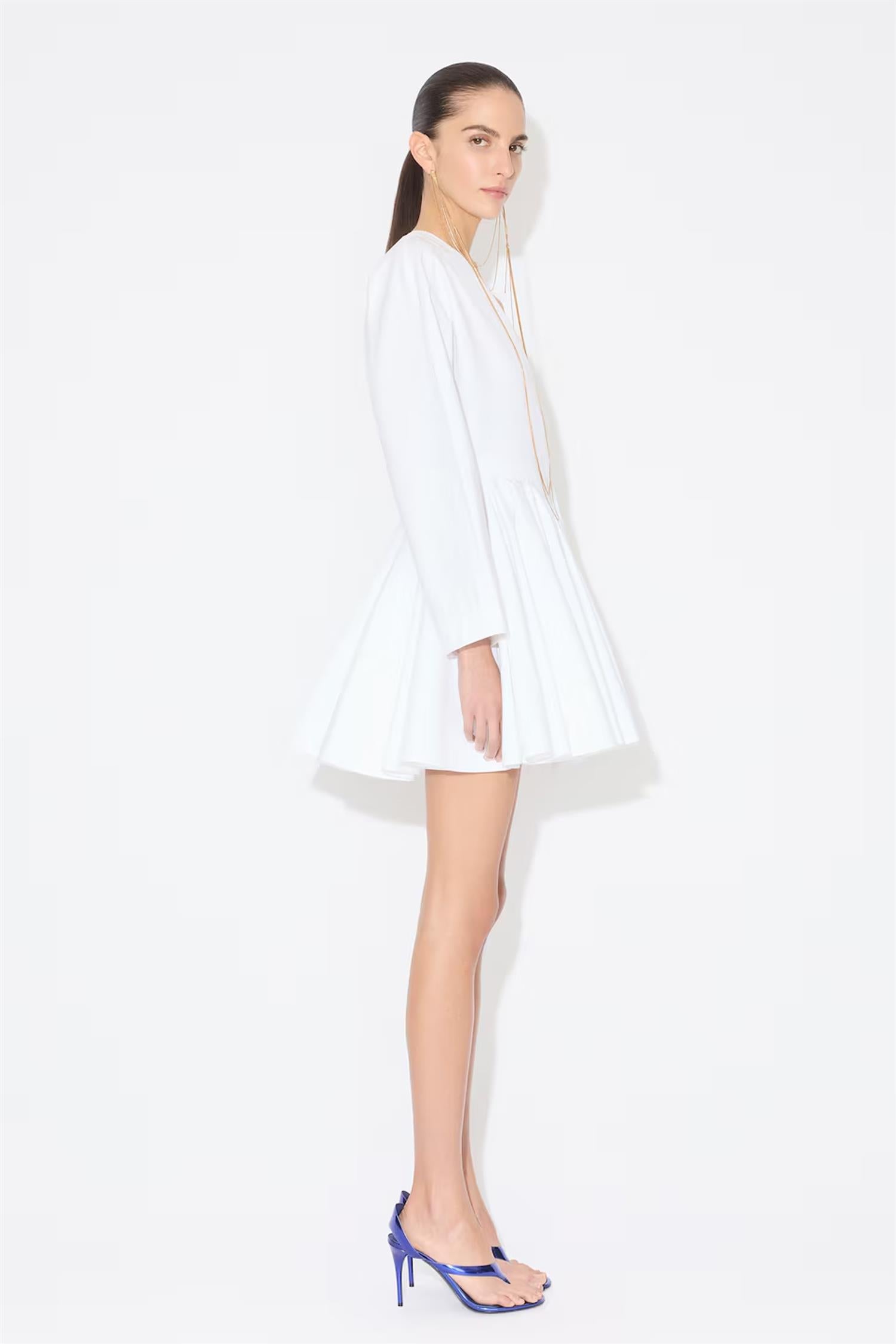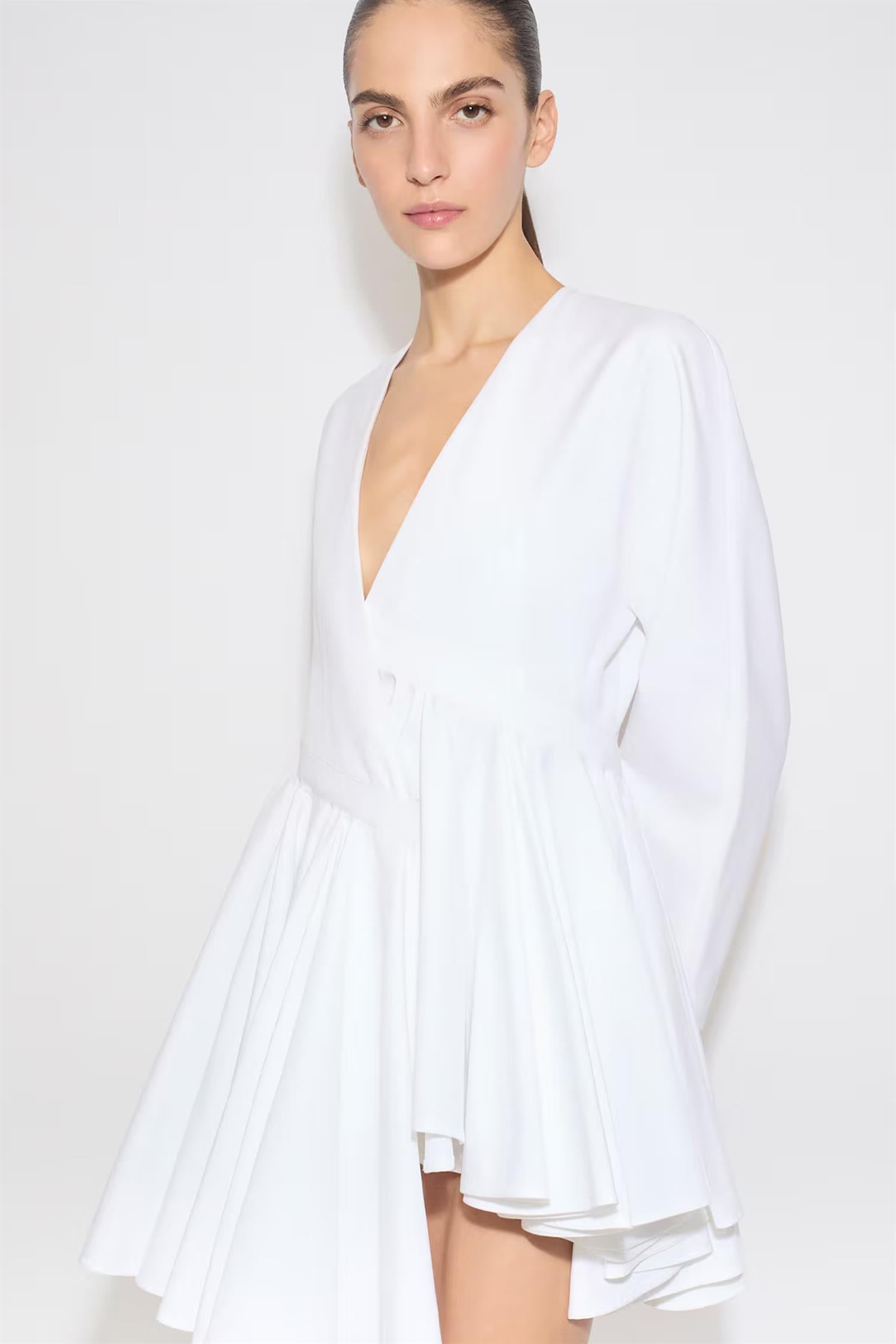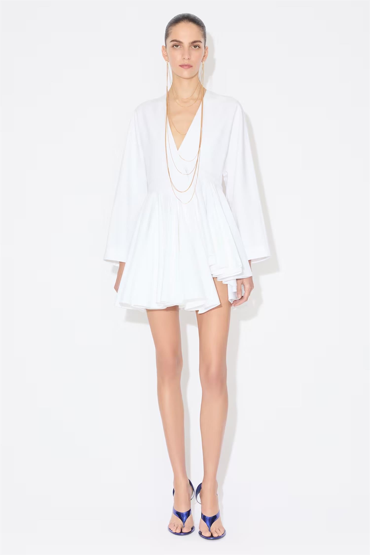 En skulpturell og uttrykksfull kjole fra Alaïa med asymmetrisk snitt, dyp utringning og markert midje. Laget i crisp bomullspoplin, med lange ermer og en integrert spiralformet metallbelte som fremhever silhuetten. Kjolen har en trapesformet fasong og faller til midt på kneet – en balanse mellom struktur og bevegelse.