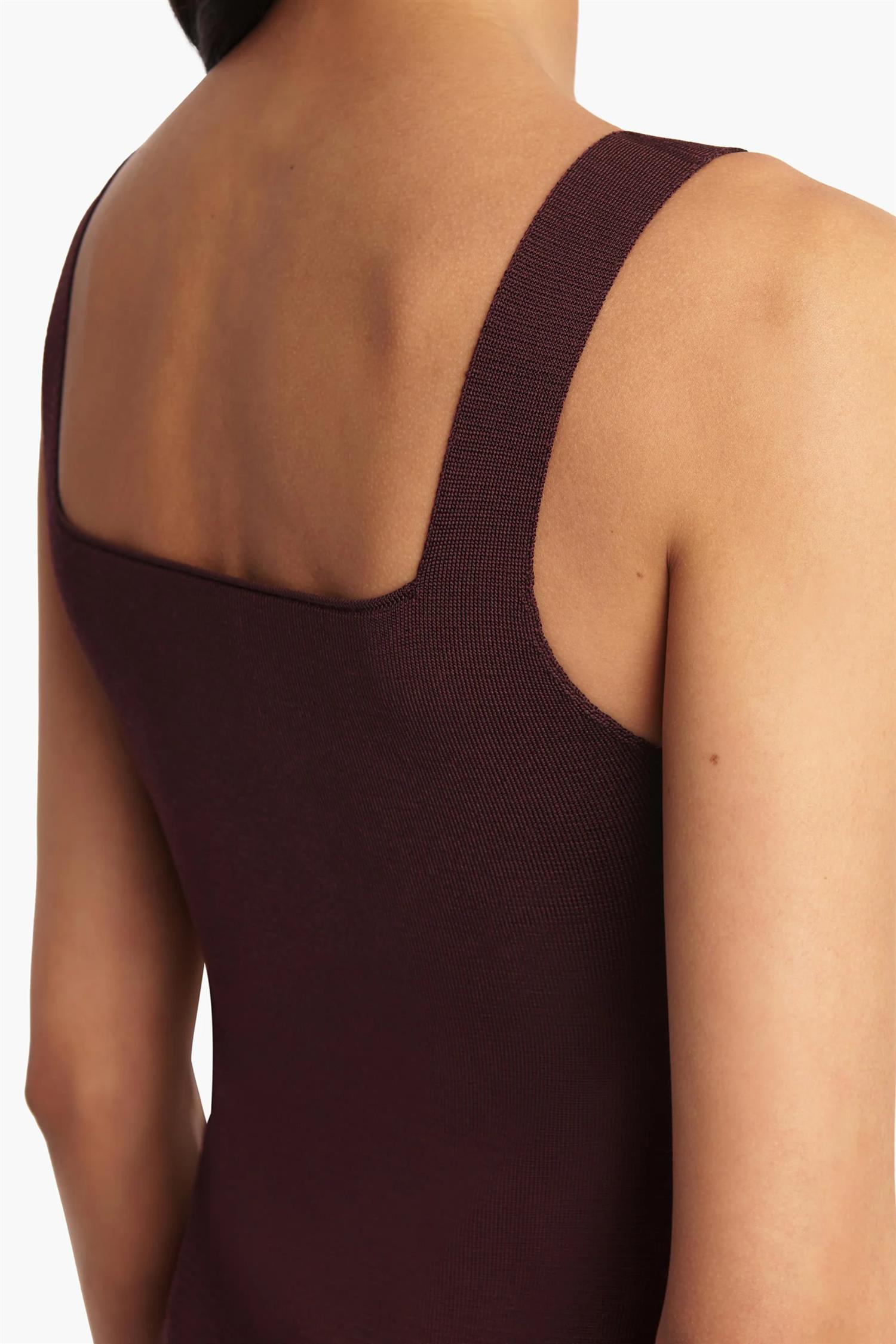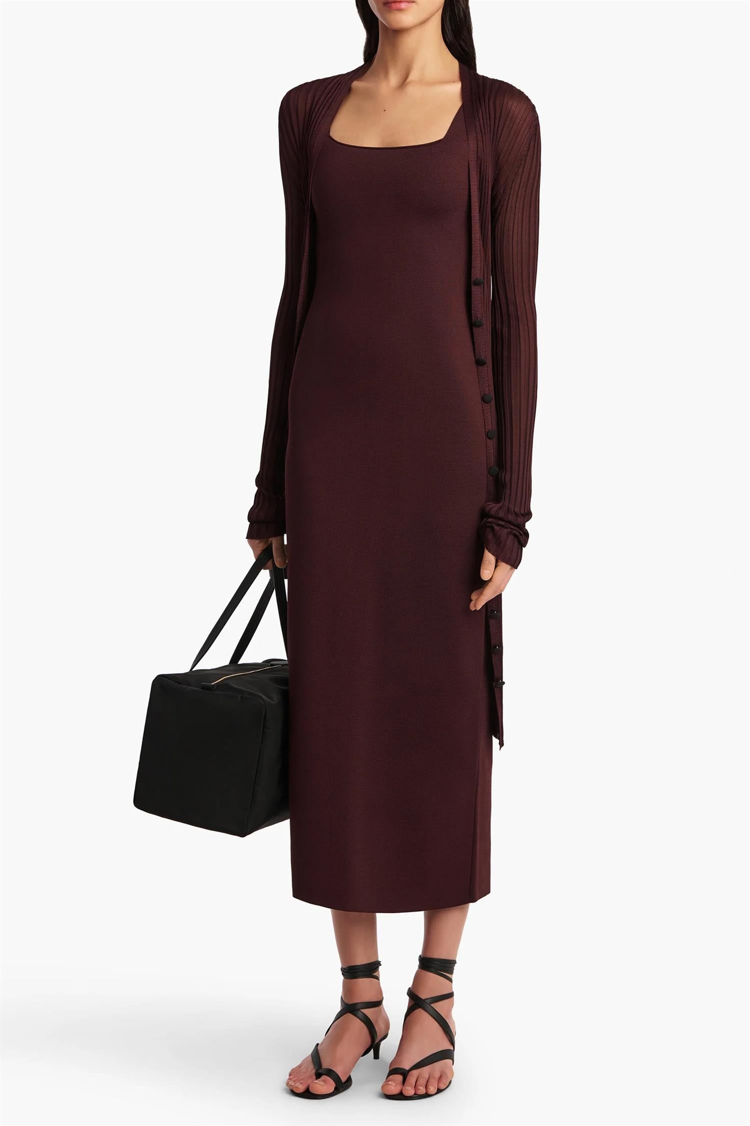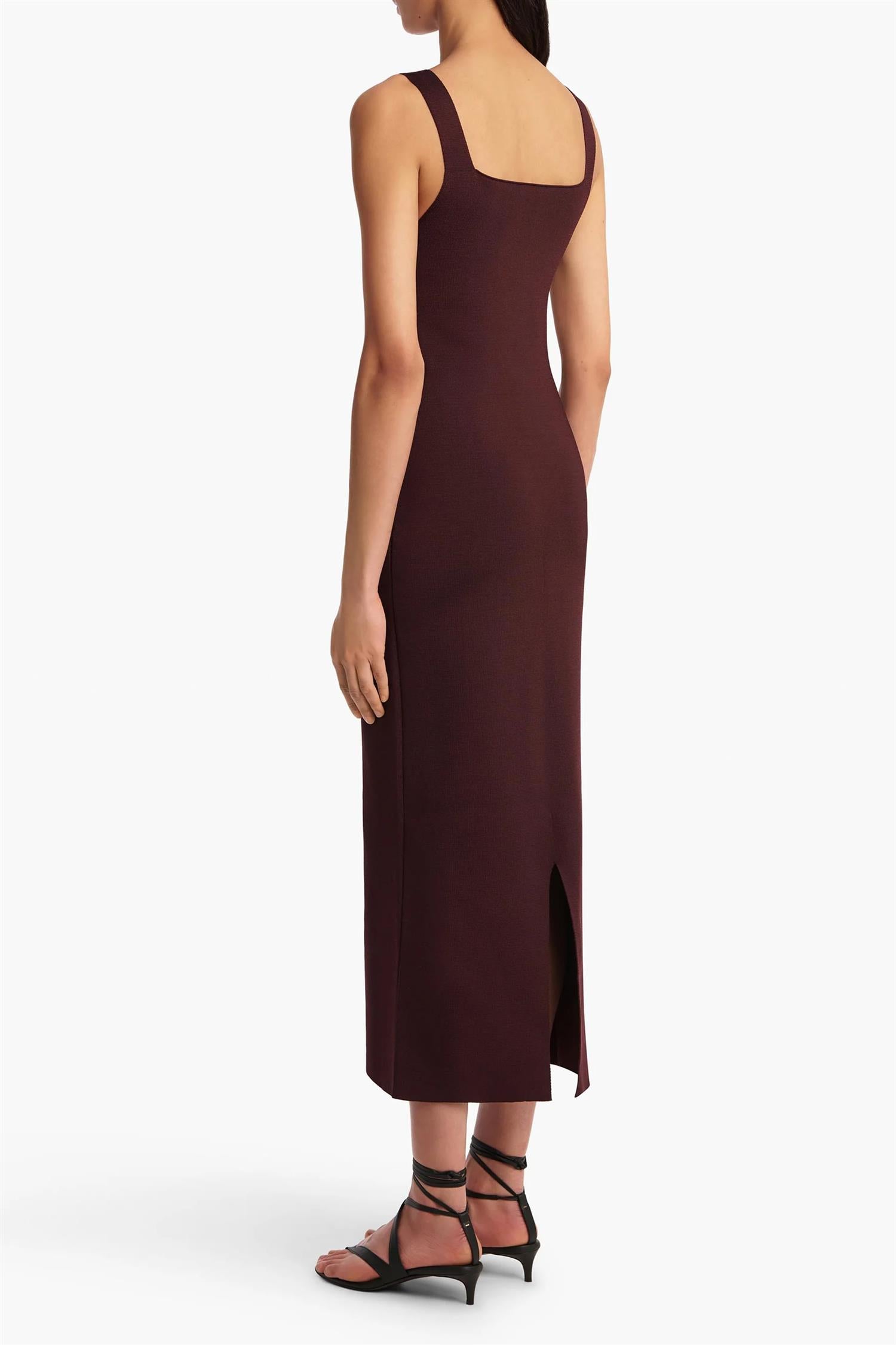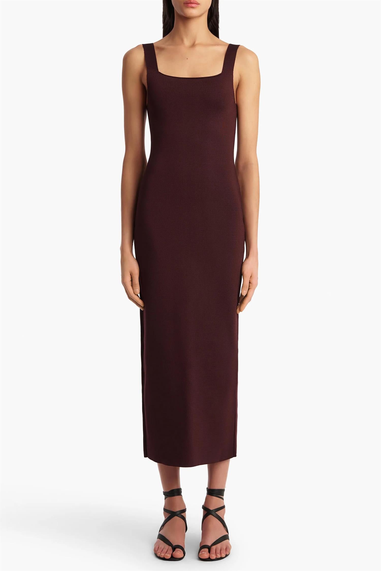 Ermløs kjole fra Khaite med firkantet utringning. Kjolen gir et feminint uttrykk med en split bak og ettersittende passform.