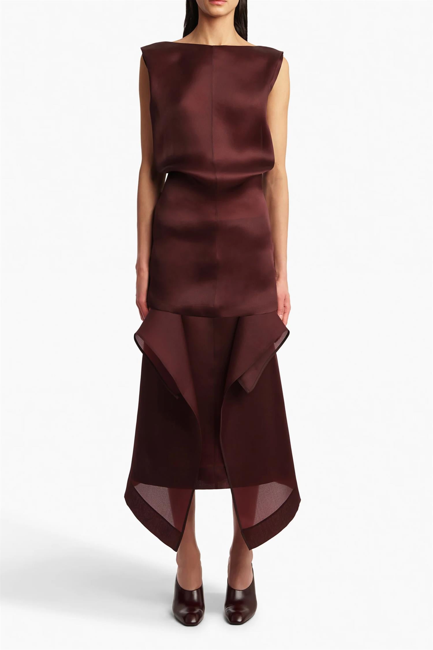 Toma dress fra Khaite er en kort skulpturell minikjole i silke med en bølgete overdel og tettsittende skjørt som gir et raffinert utseende. Den har en skjult glidelås bak. Første bildet er stylet med Nina Skirt.