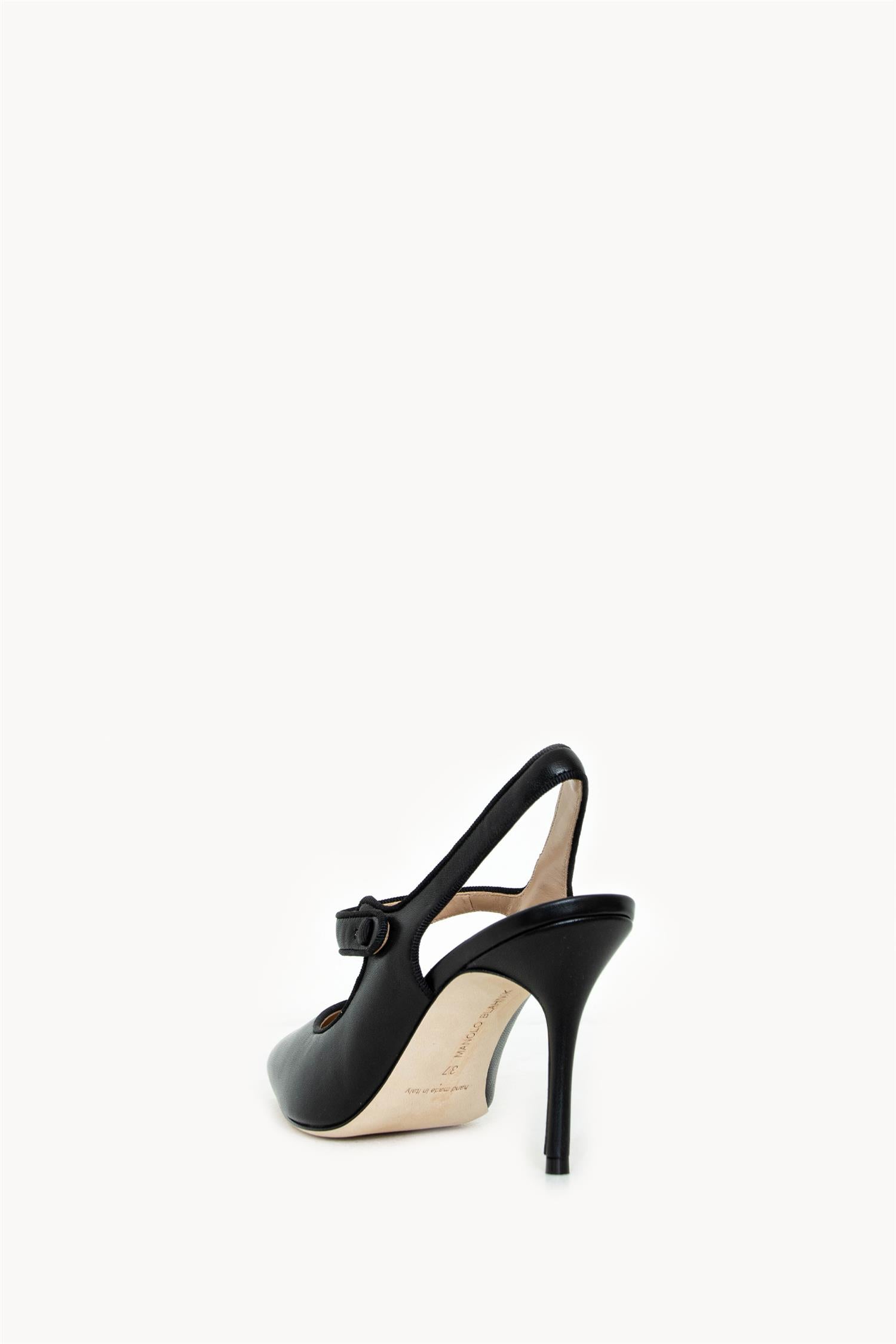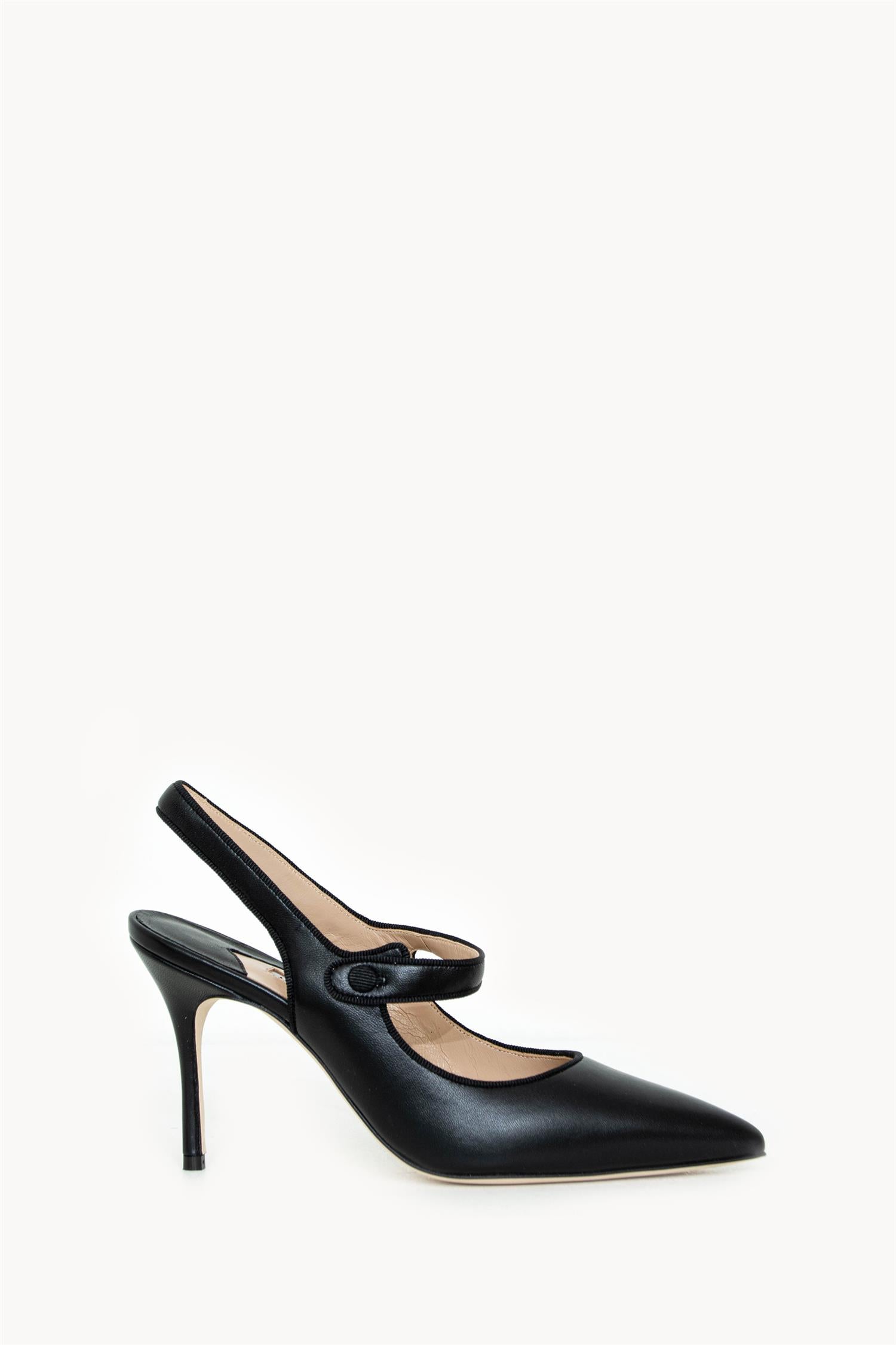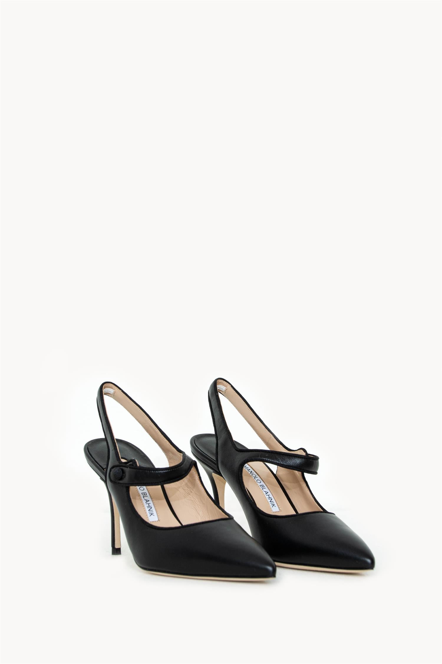 Oppdag tidløs eleganse med "Camparisli" pumps fra Manolo Blahnik. Disse elegante skoene er laget i førsteklasses skinn og pyntet med en subtil grosgrain-kant som fremhever den elegante silhuetten. Med en stiletthæl på 9cm gir de et løft som er både feminint og raffinert. Den spisse tåen og den karakteristiske Mary Jane-stroppen med knapp gir skoene en moderne vri på en klassisk stil, mens slingback-stroppen bak sørger for ekstra støtte.