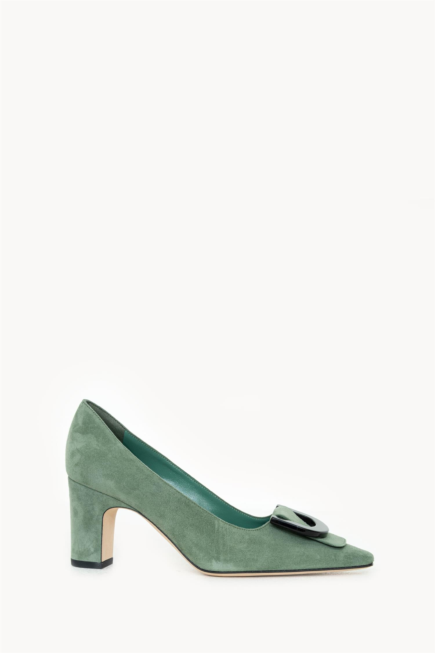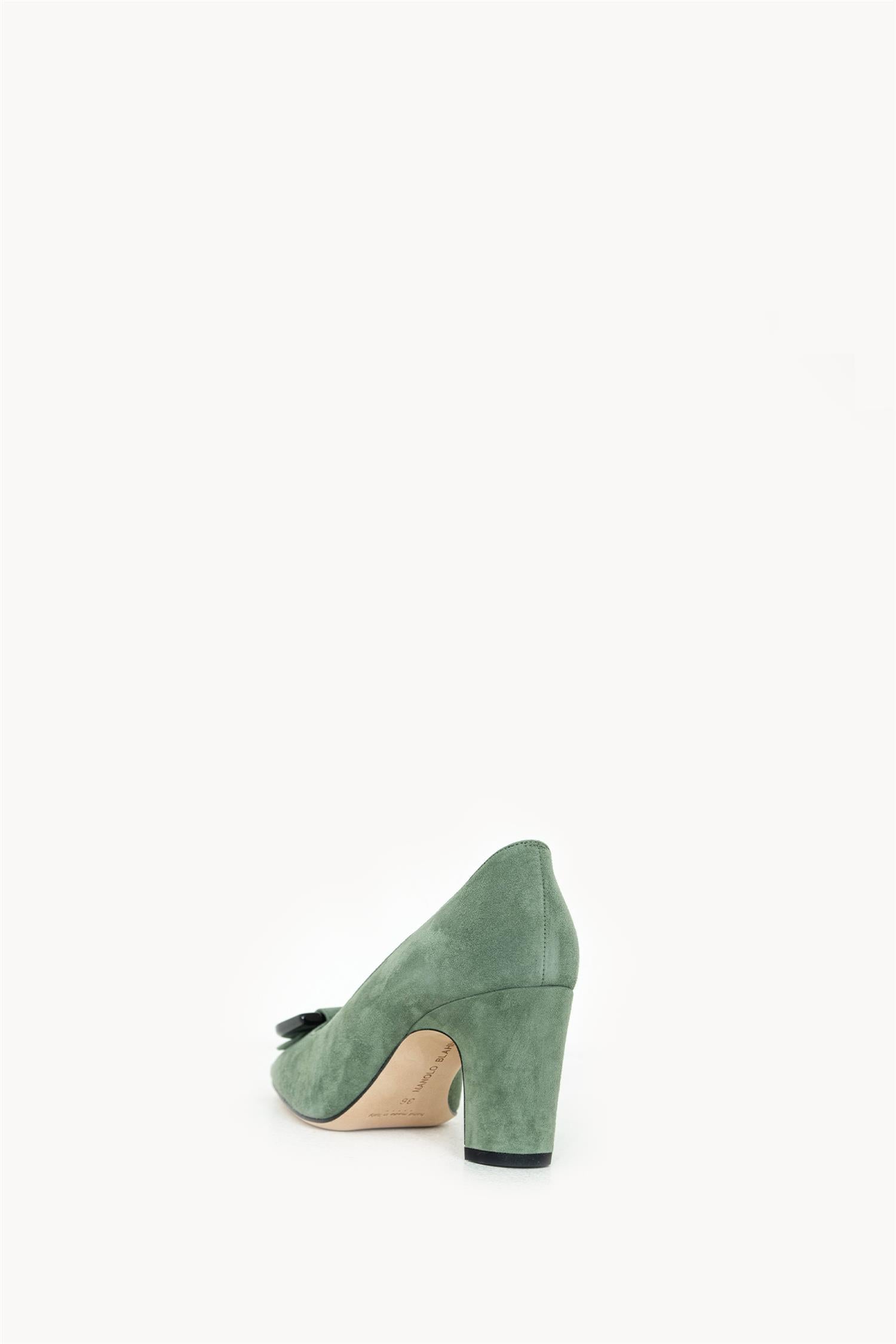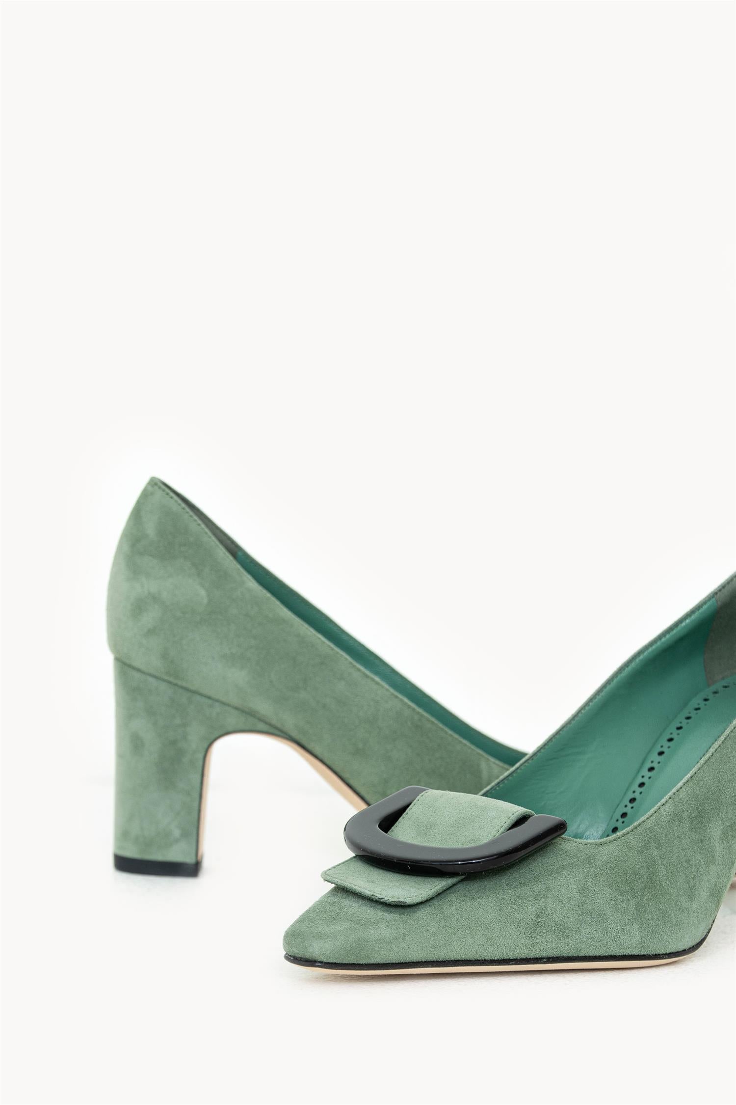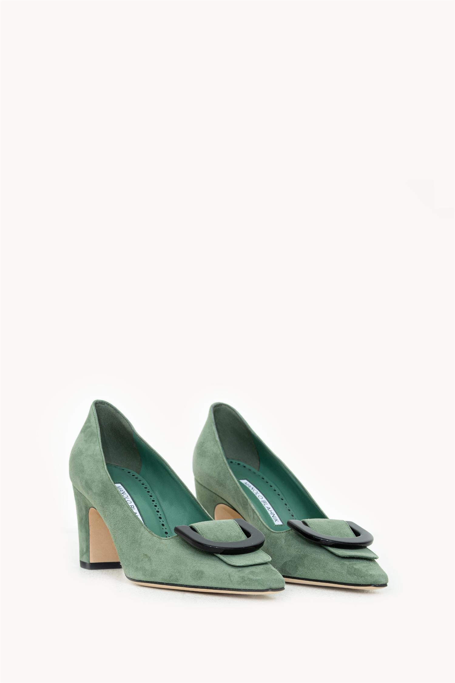 Beti-pumps i grønt semsket skinn fra Manolo Blahnik. Modellen har spiss tå og en stabil blokkhæl på 70 mm. Overdelen er i semsket skinn, med skinnfôr og skinninnersåle, samt yttersåle i skinn.