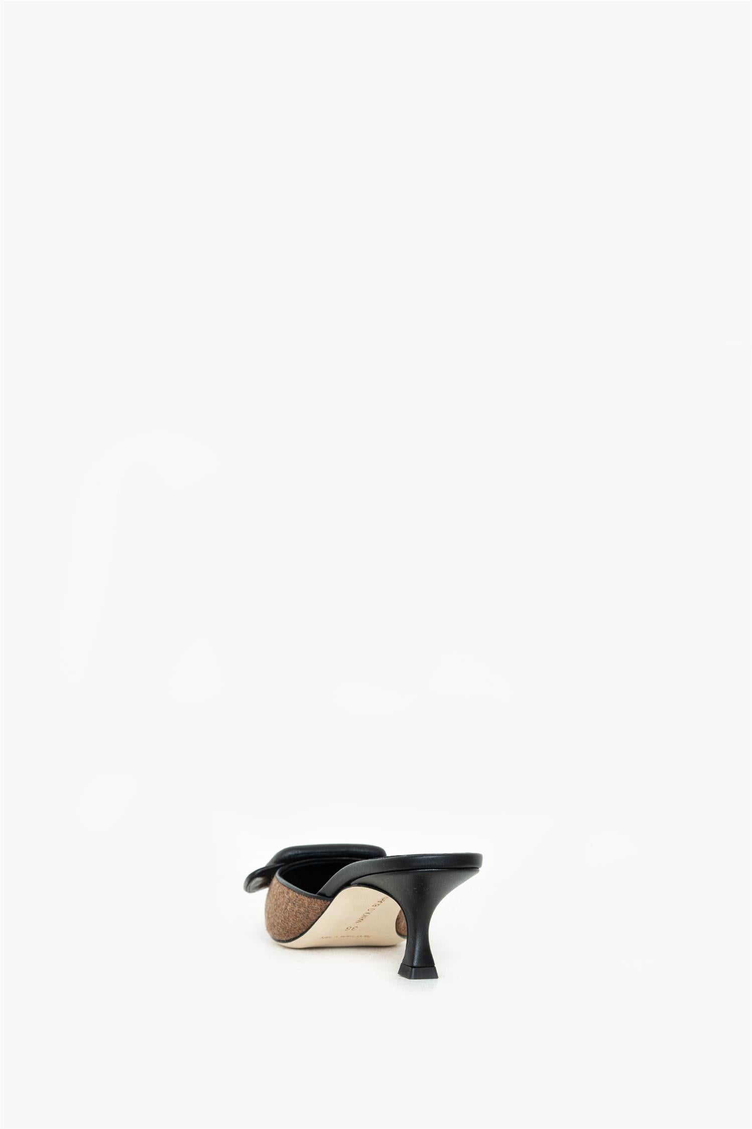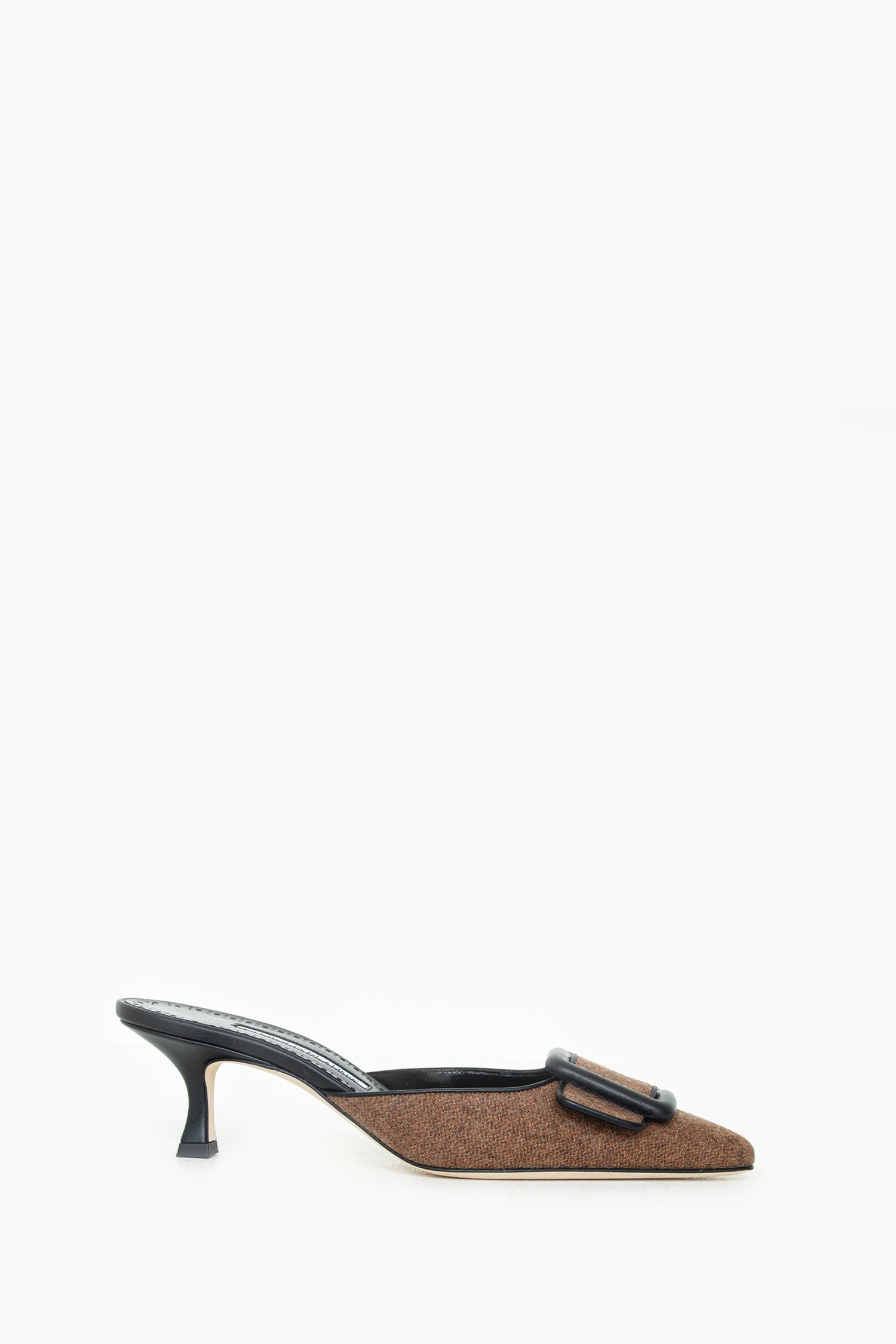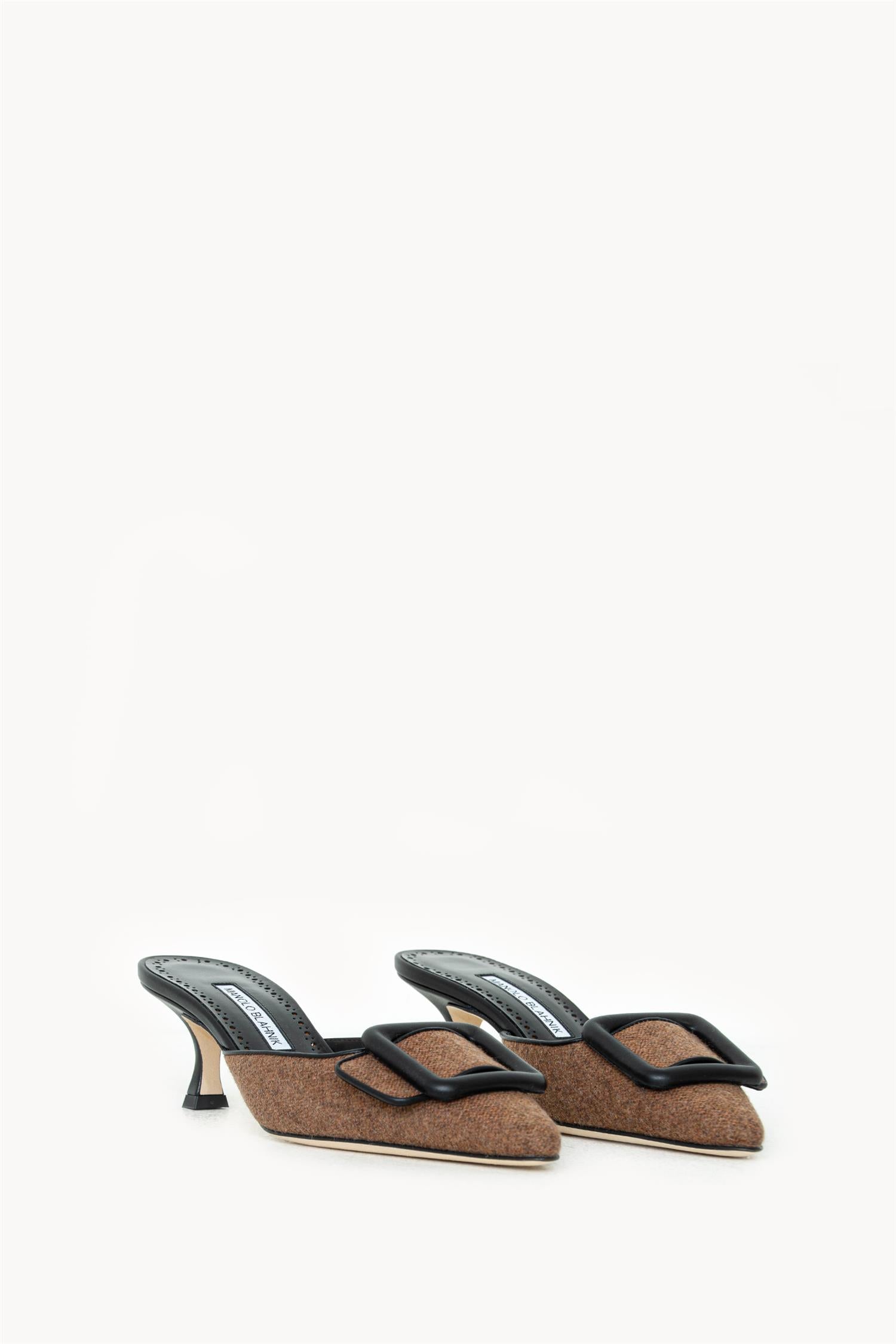 Maysalebi-mules i kalveskinn fra Manolo Blahnik. Modellen har spiss tå, dekorativ spenne over vristen, kitten-hæl på 50 mm og åpen hæl. Overdelen kombinerer kalveskinn og ull, fôret er i kalveskinn, og yttersålen er i semsket kalveskinn.