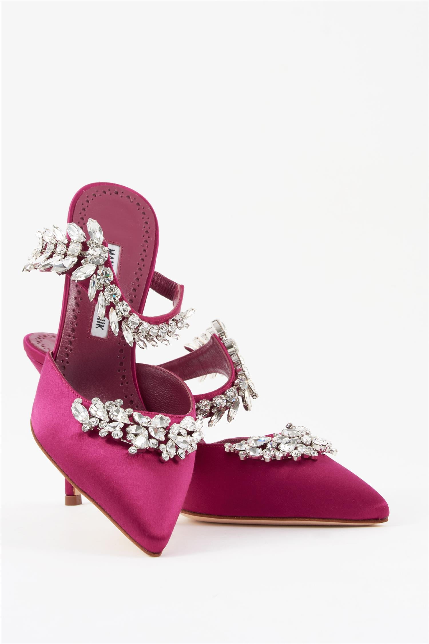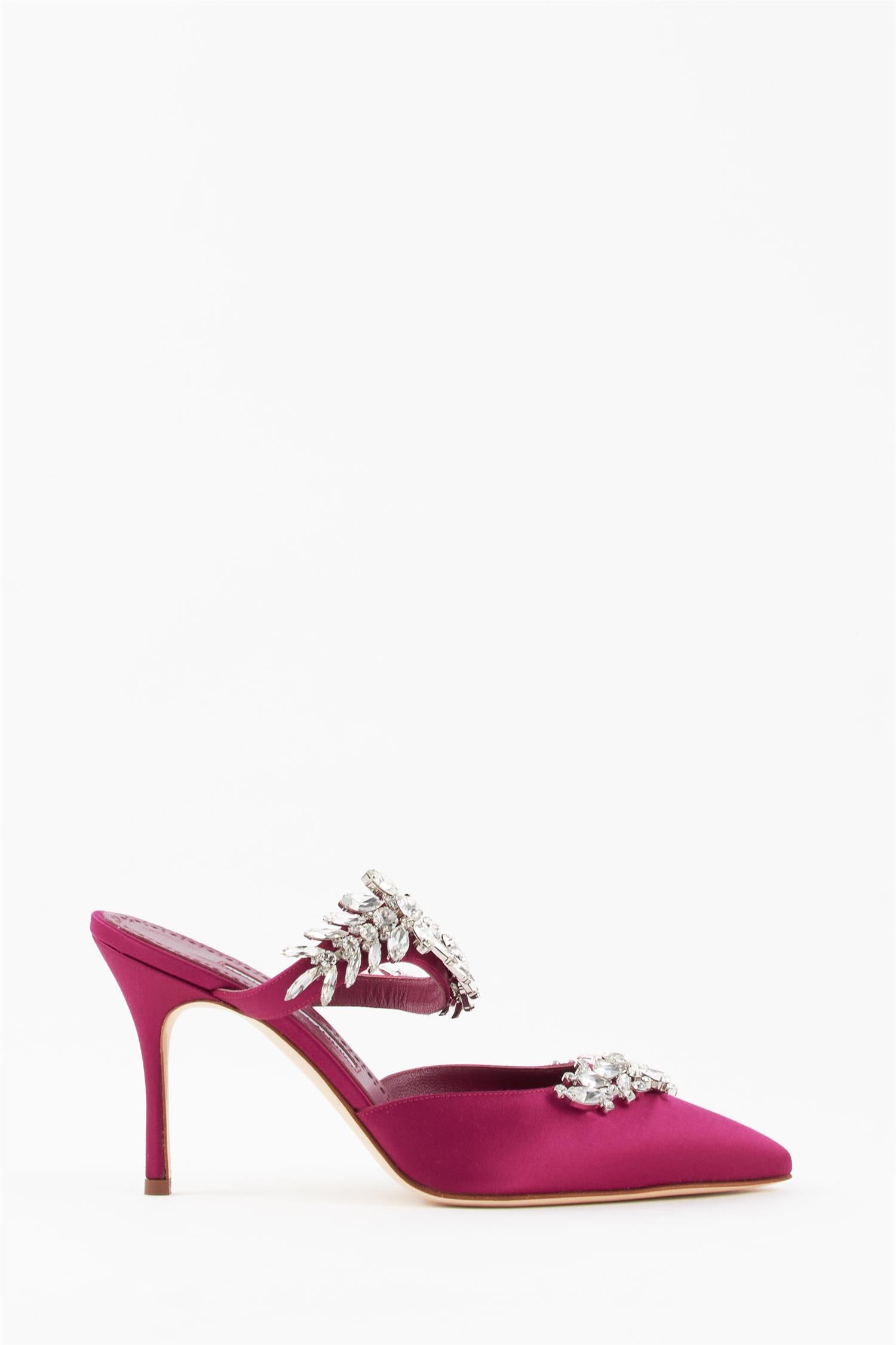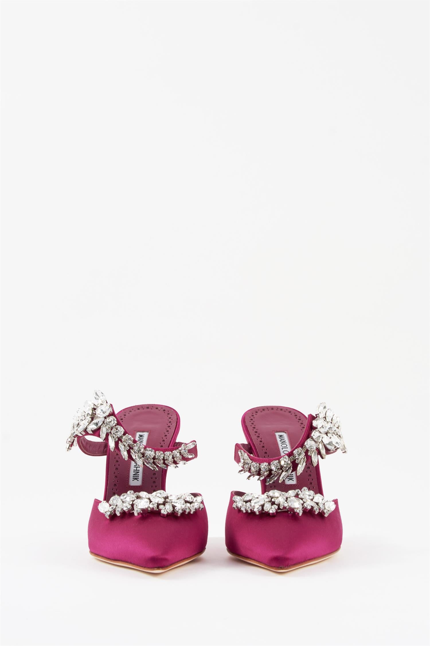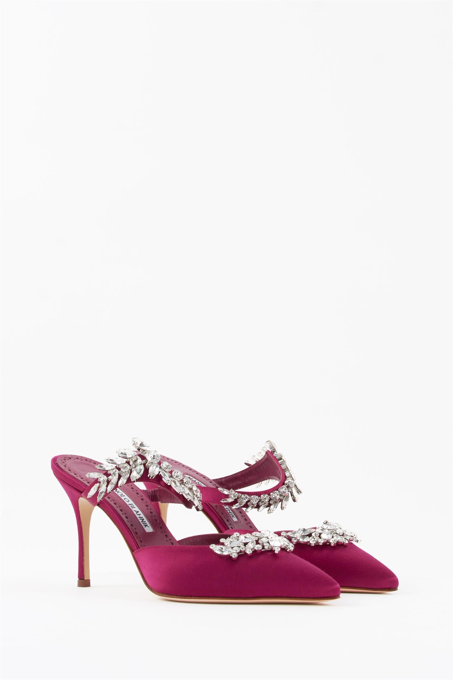 Skoene fra Manolo Blahnik er laget med en lys, myk skinnsåle. Hold deg unna væske, våte overflater, gress og liknende.