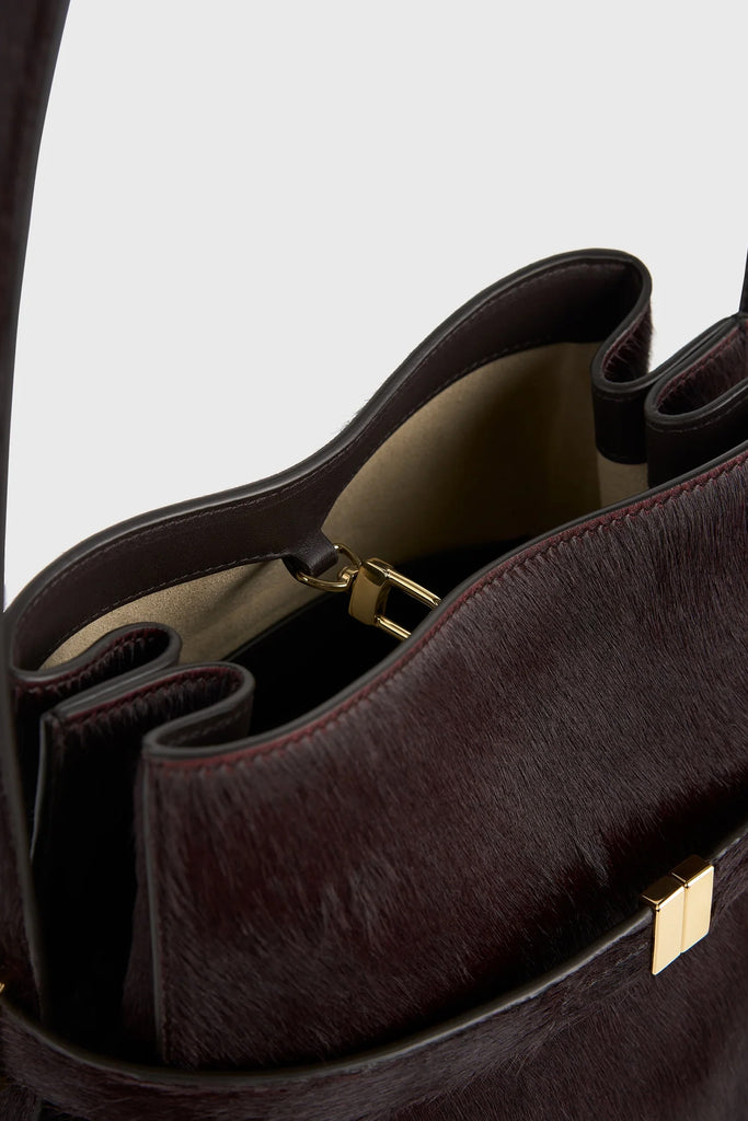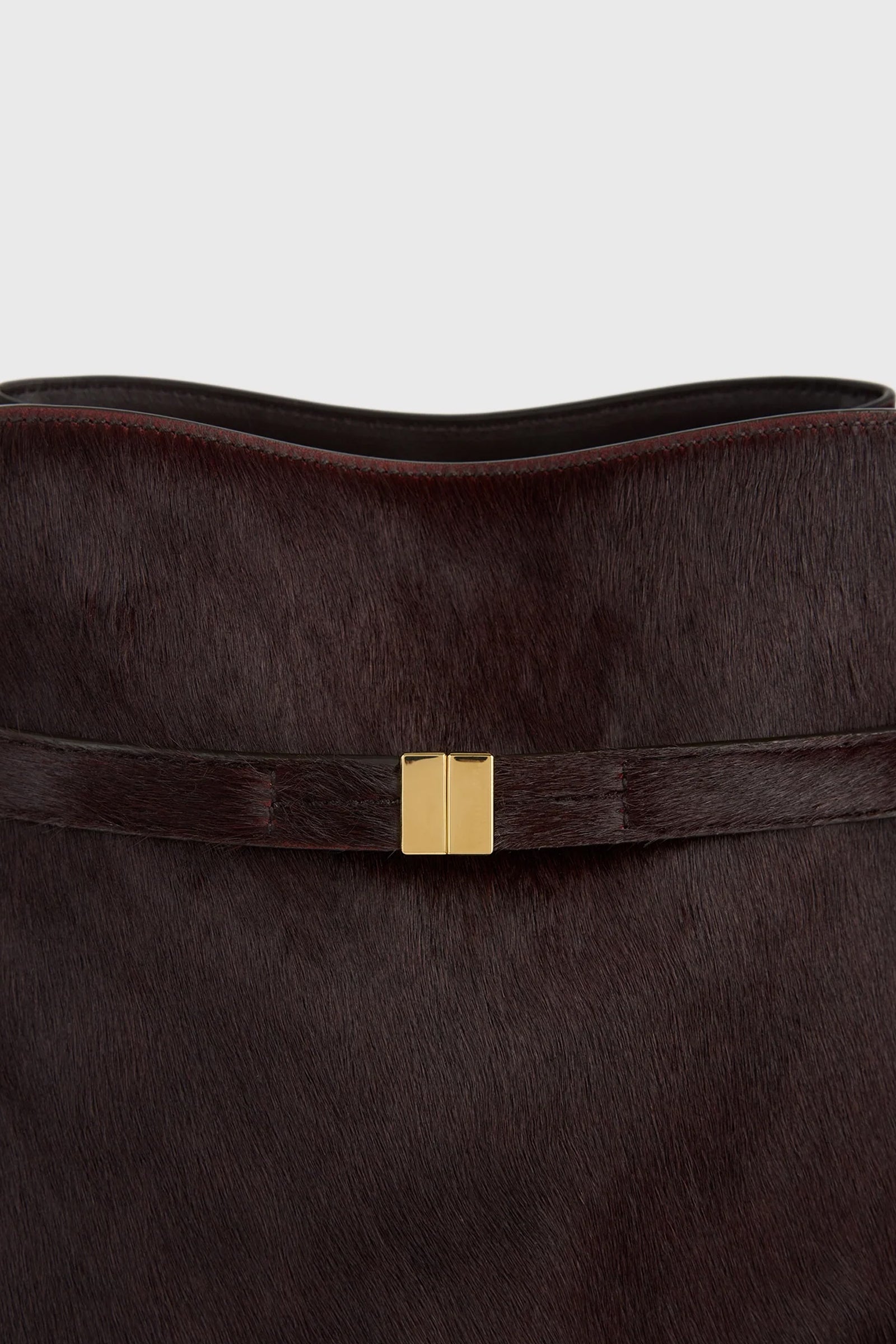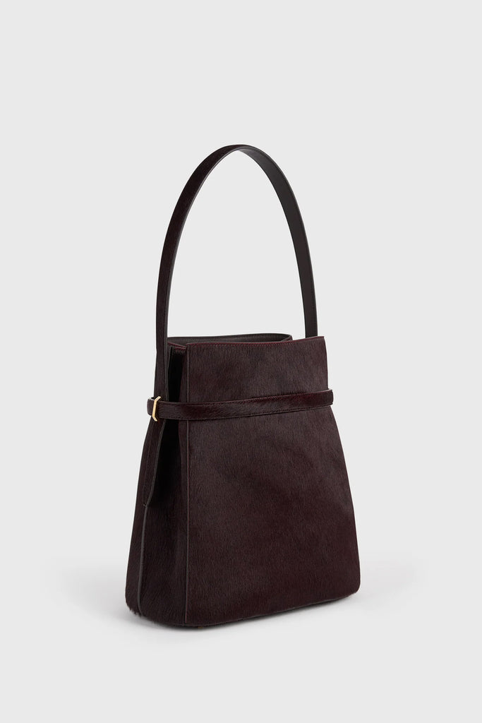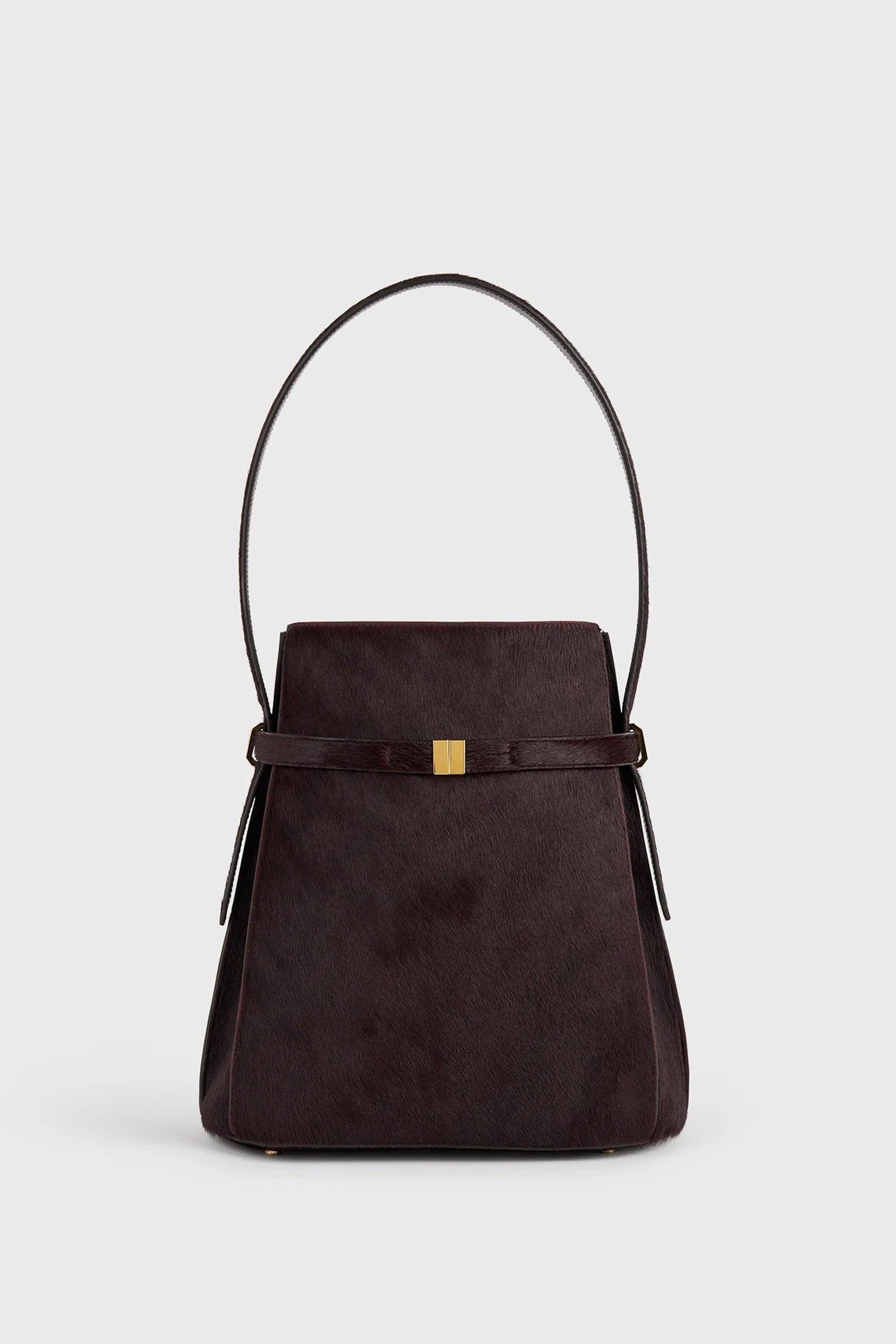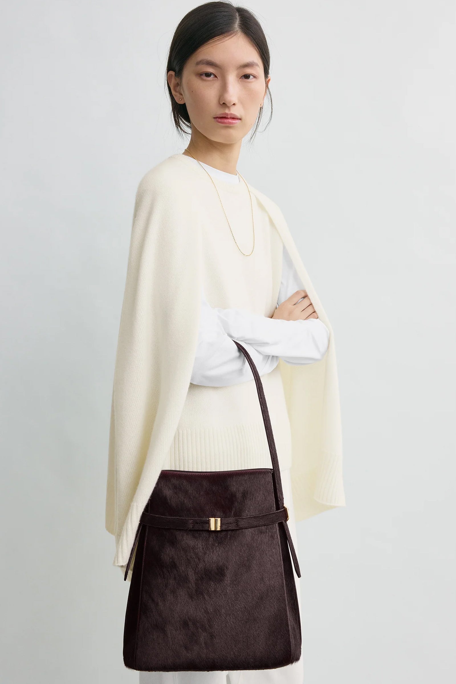 Belted Buckle Bag ble introdusert på TOTEMEs høst/vinter 2024-visning i anledning merkets tiårsjubileum. Vesken er laget i Italia av skinn med ponyeffekt og har detaljer i gullfarget metall. Den karakteristiske silhuetten kan formes med det belteinspirerte båndet for en mer strukturert fasong, eller bæres åpen for ekstra plass. Innsiden er foret med myk mikrosuede og har to stikklommer for enkel organisering. Bruk den over skulderen for en uanstrengt, moderne look.