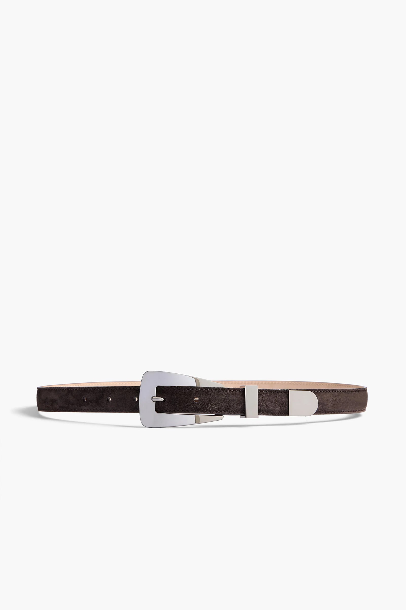 Et raffinert belte i semsket kalveskinn fra Khaite, utformet med en avlang, trapesformet spenne som tilfører et skarpt og moderne preg. De polerte metalldetaljene er laget av palladiumbelagt messing for en ren, skulpturell finish.