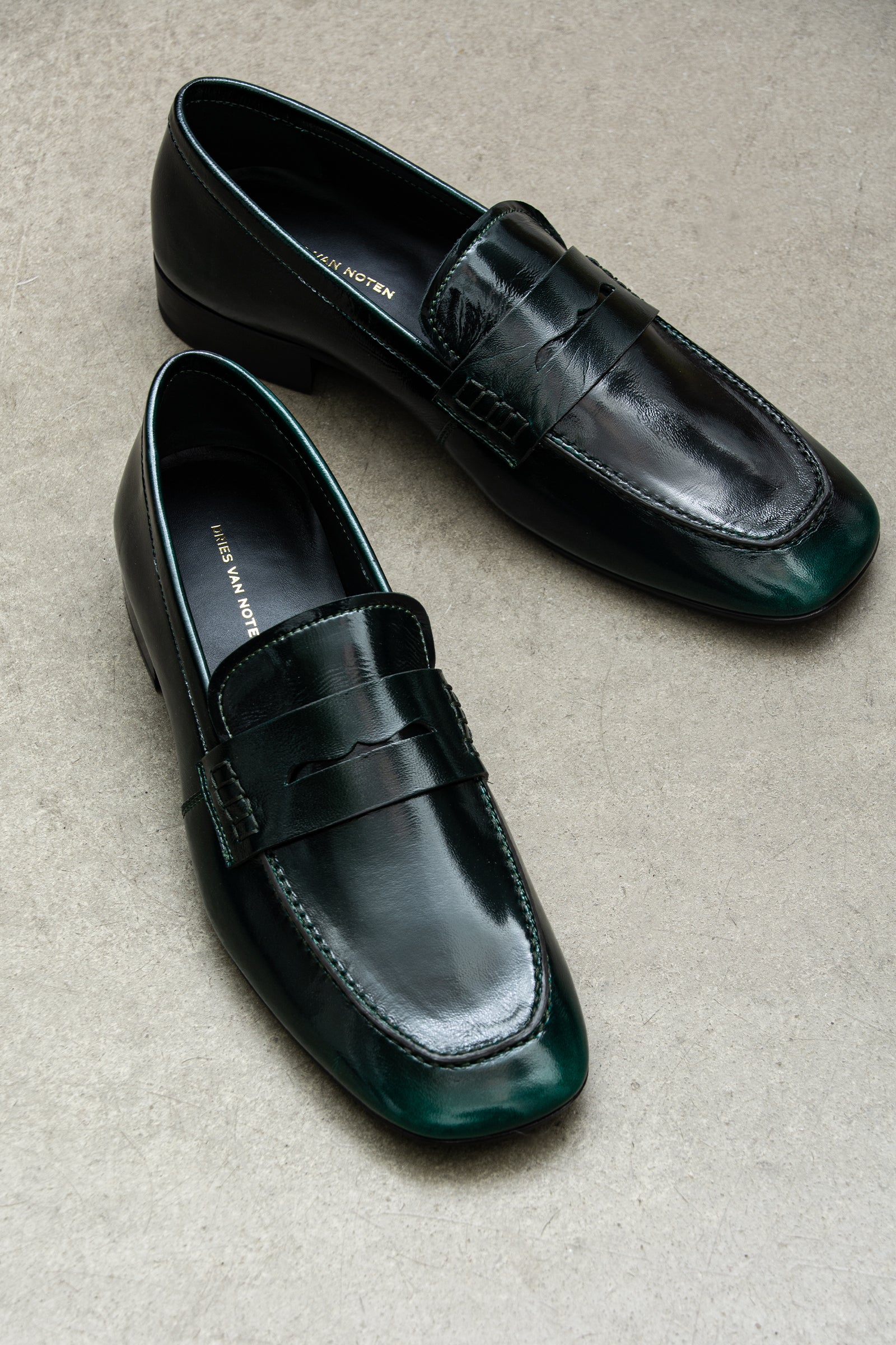 Patent Penny loafer fra Dries Van Noten. Loafers med firkantet tå i to farget nyanser.