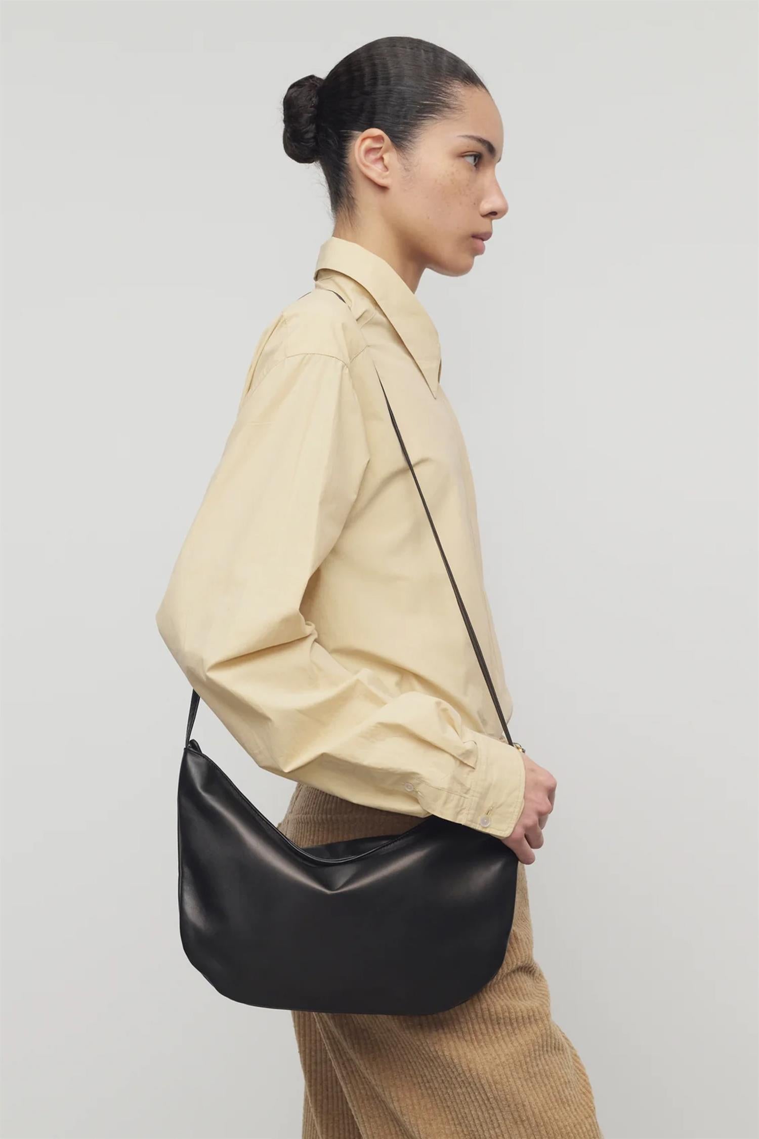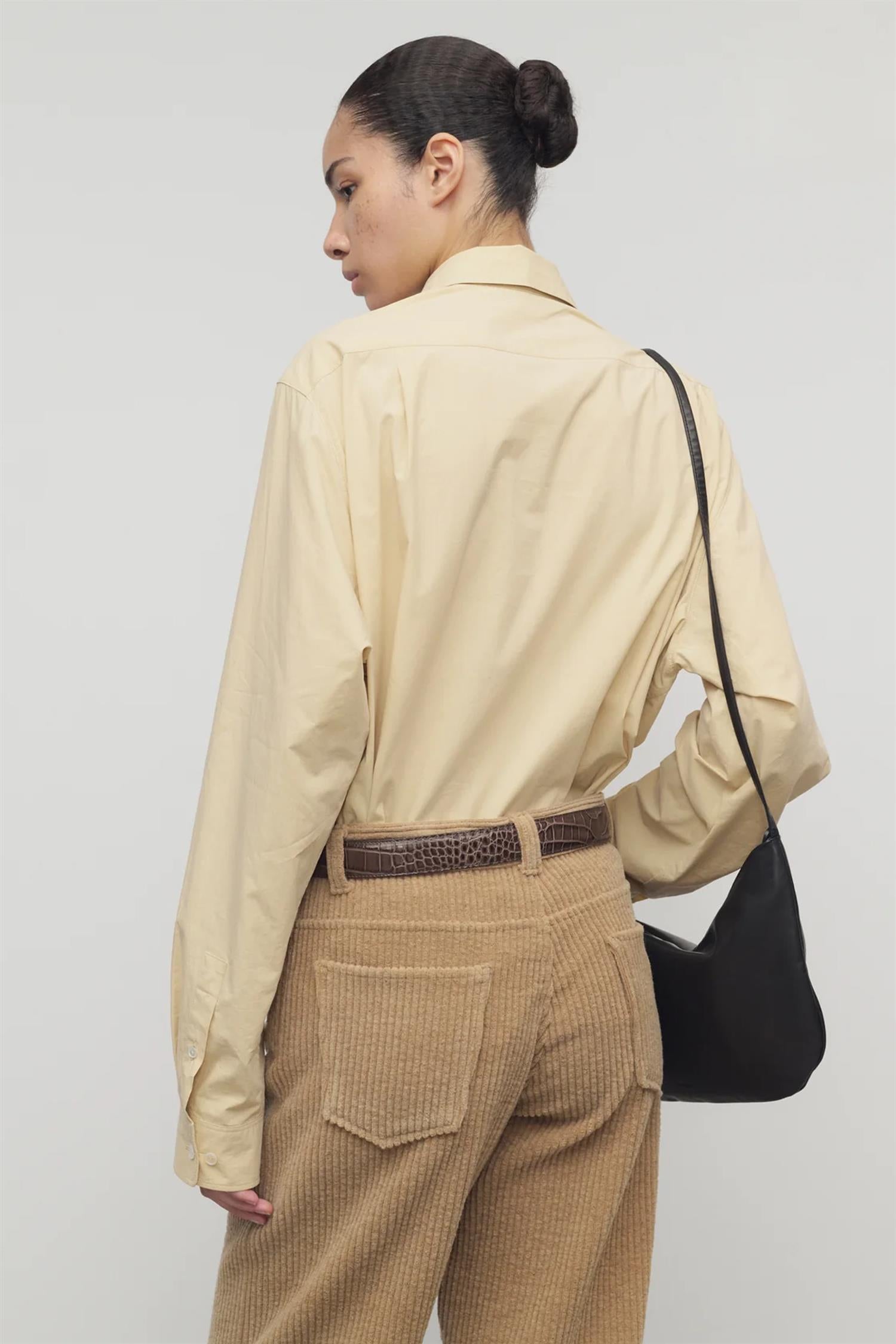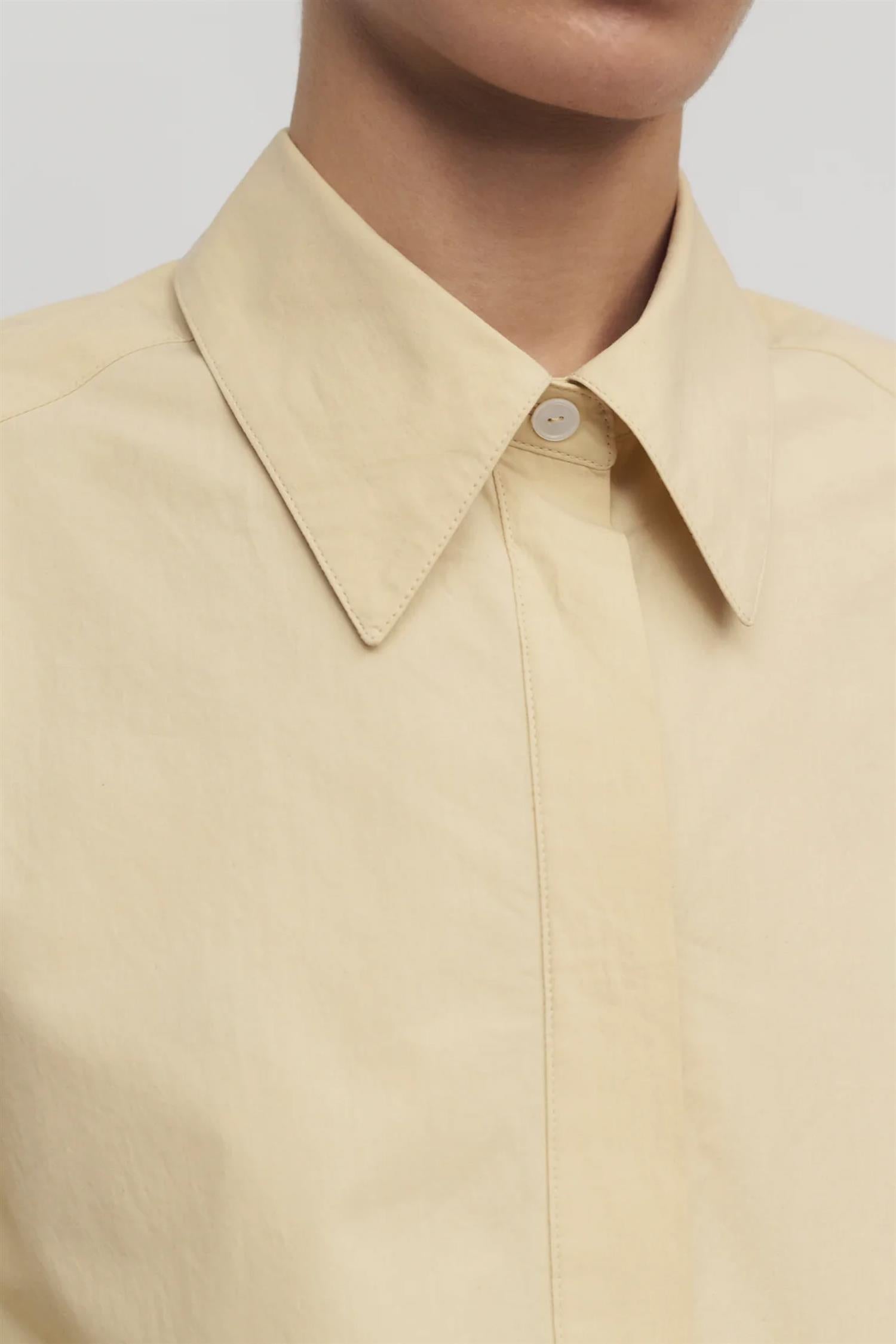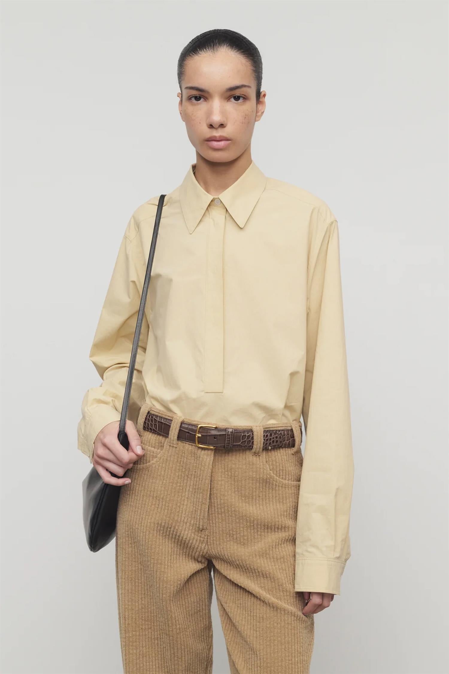 Margan-skjorten fra The Row er en oversized langermet modell med polokrage og skjulte perlemorsknapper, som gir en minimalistisk silhuett med avslappet volum og skreddersydde detaljer.
