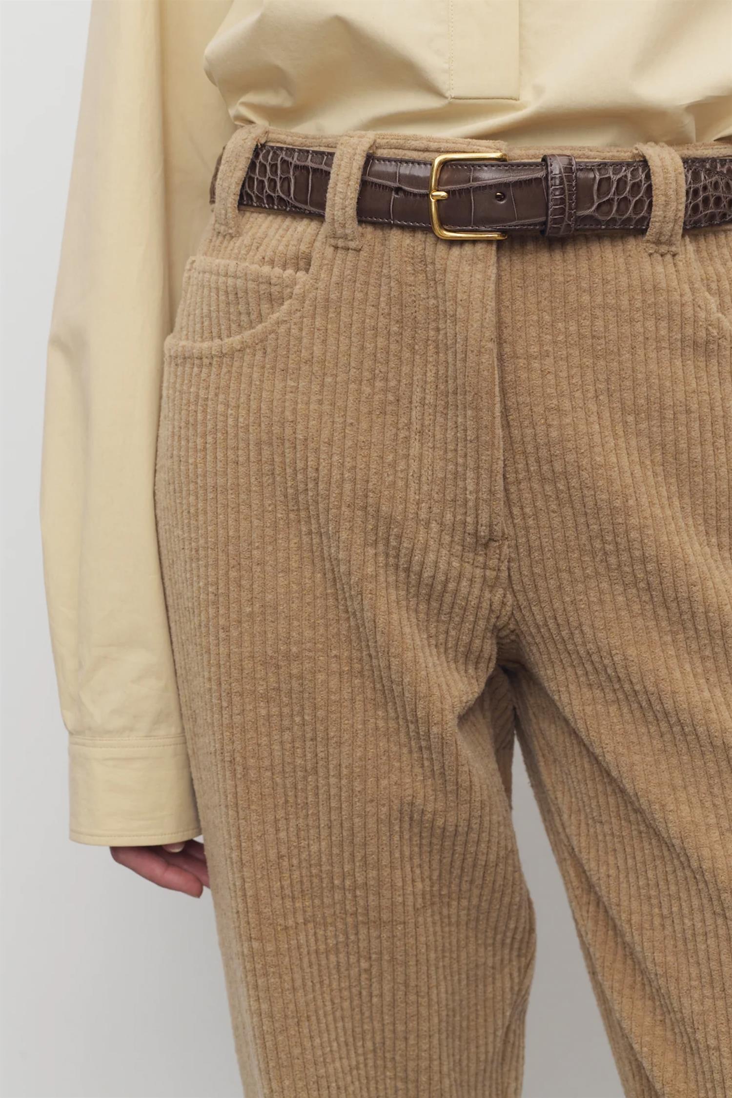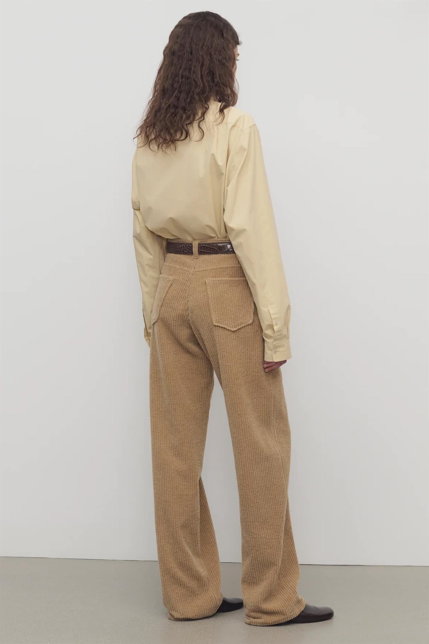 Elegant bukse fra The Row designet i en lukseriøs blanding av ull og bomull, med en myk og delikat tekstur. Buksen har høyt liv og rette ben, og er inspirert av den klassiske 5-lommers konstruksjonen. Et kvalitetsplagg som kombinerer italiensk håndverk med moderne eleganse. Ideell for både hverdag og finere anledninger.