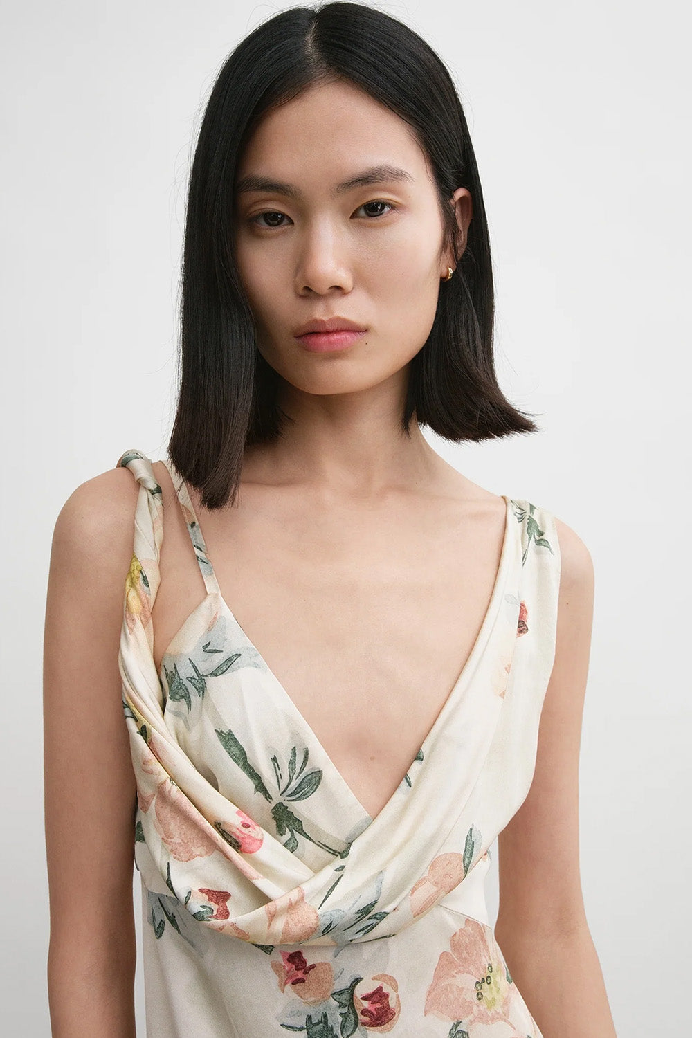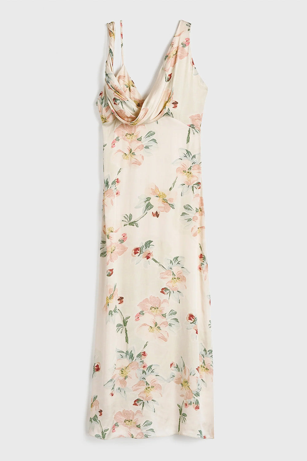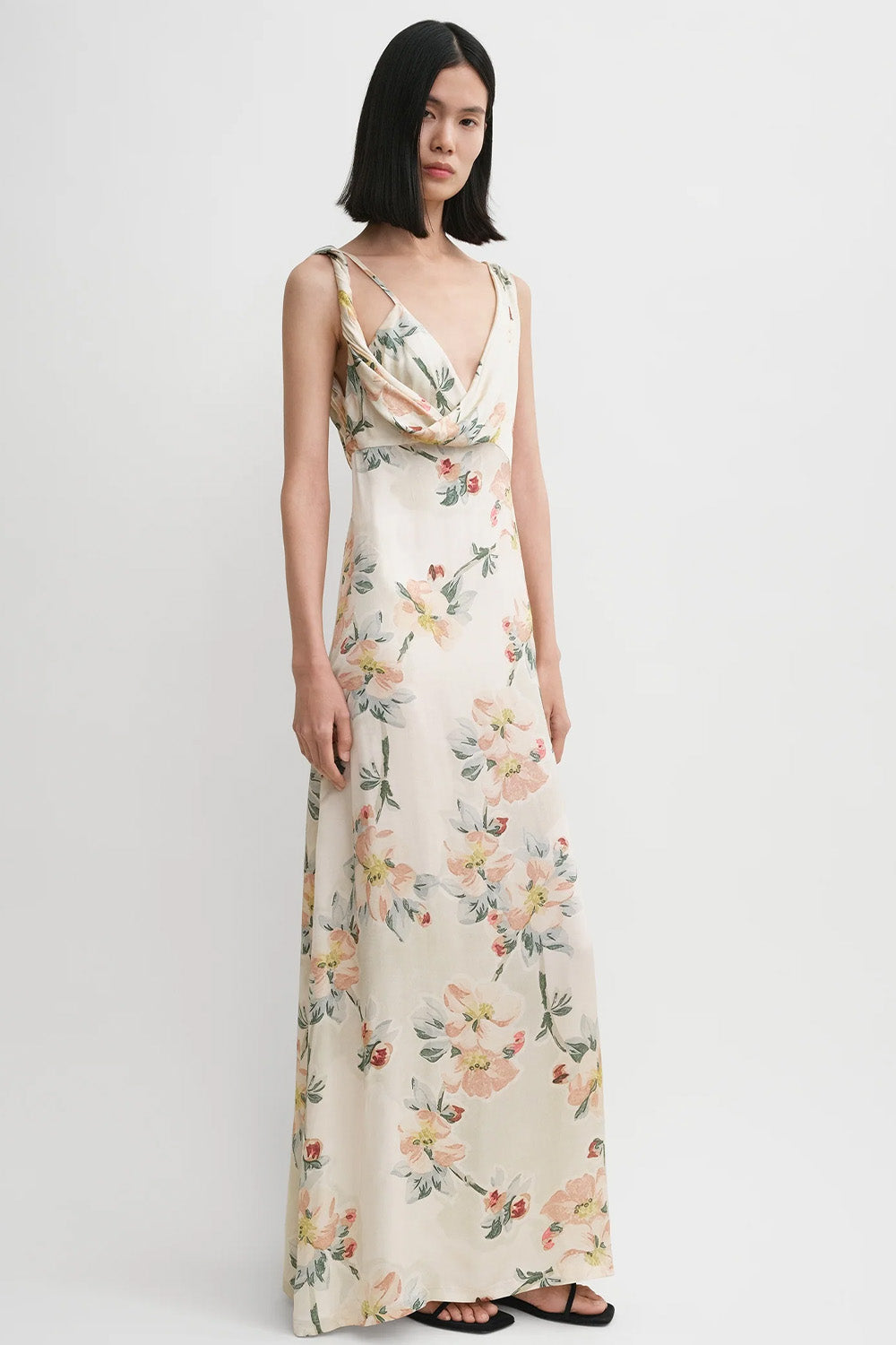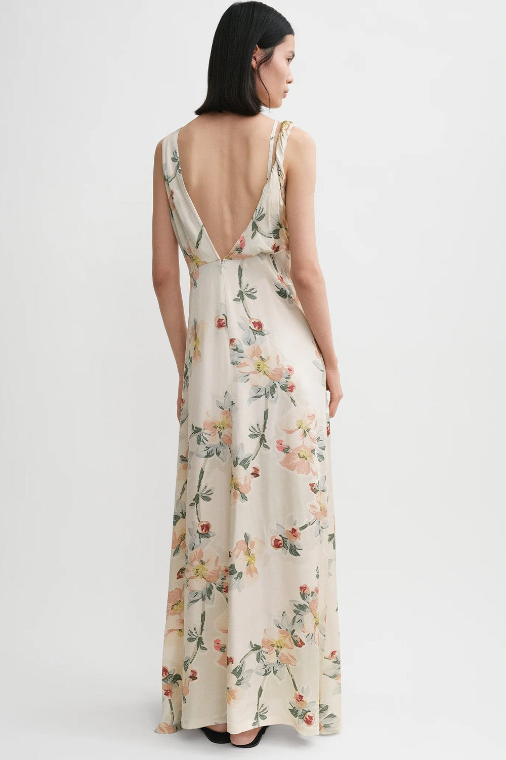 Twist Drape Dress fra Toteme er en lang, sofistikert kjole med draperte detaljer over brystet og skuldrene. Den glatte satengen legger seg pent langs kroppen og har elegant bevegelse. Den har en dyp rygg og lukkes med skjult glidelås. Style med høye pumps til fest og sandaler til sene sommerkvelder.