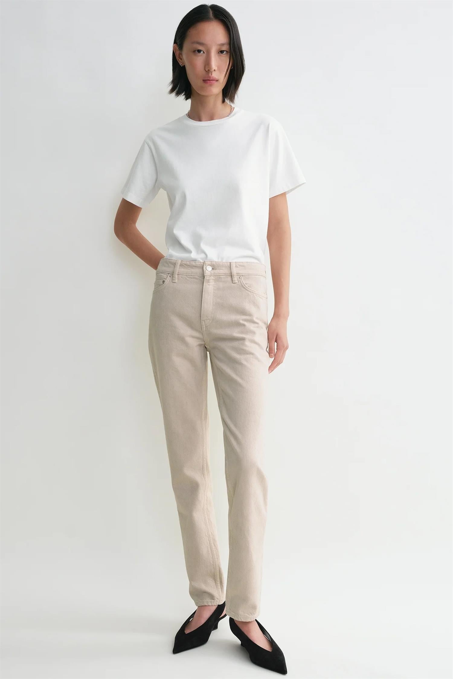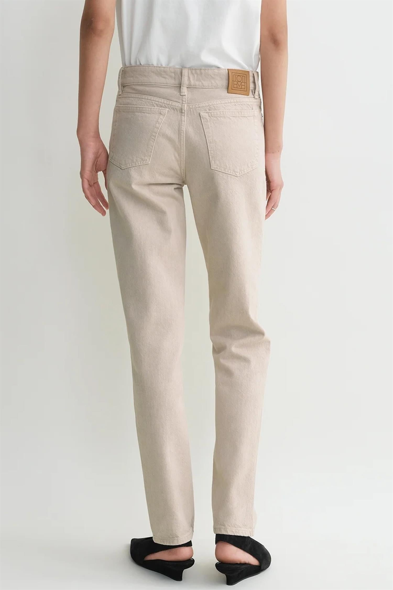 TOTEME jeans designet med rette ben som smalner inn mot anklene for en avslappet og uformell stil. Laget av rå, økologisk bomullsdenim som er vasket for en lett og myk finish. De har en lav midje og en lav skrittlinje. Jeansene er utstyrt med beltehemper, glidelåsgylf og fem praktiske lommer, noe som gjør dem til et allsidig valg for både hverdager og helger.