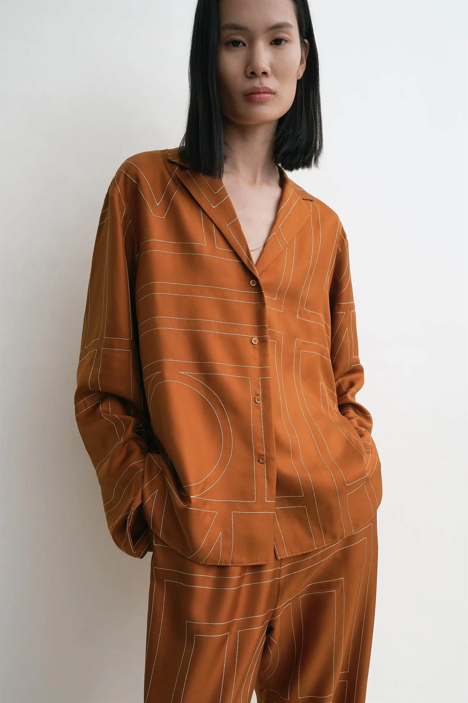TOTEME-skjorte laget av mellomtykk, flytende silketwill, brodert med et delikat monogrammønster i kontrastfarget sort tråd. Skjorten har en avslappet passform med klassisk krage, knappelukking foran og en avrundet fald. Bruk den med Monogram silk pj bottoms for et komplett sett.
