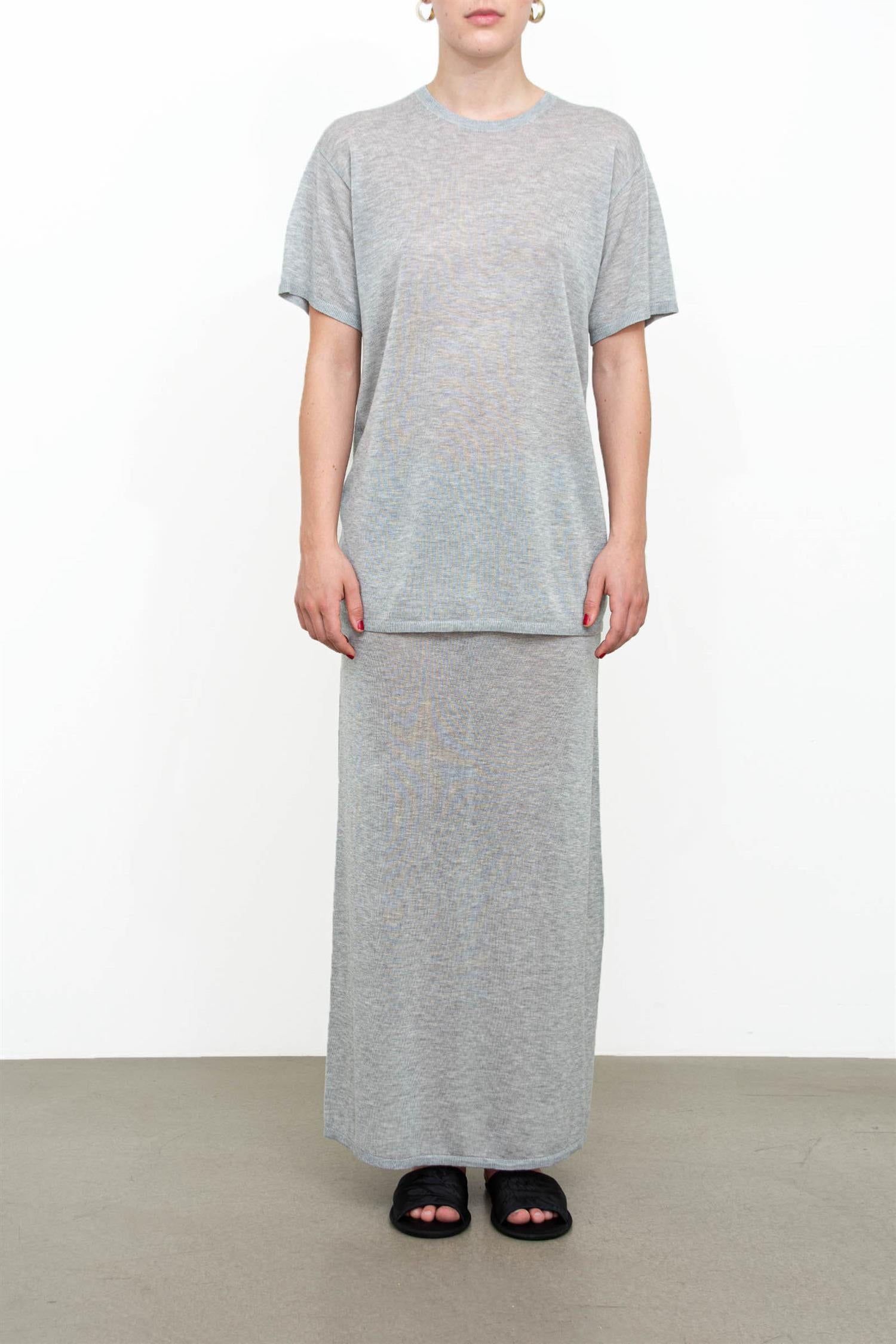 TOTEME-skjørtet er finstrikket som en referanse til kolleksjonens lek med transparens. Det har en lang, rett silhuett som henger fra en bred elastisk linning som kan justeres ved hoftene. Kombiner det med en enkel tanktop og sandaler for en uformell lunsjlook.