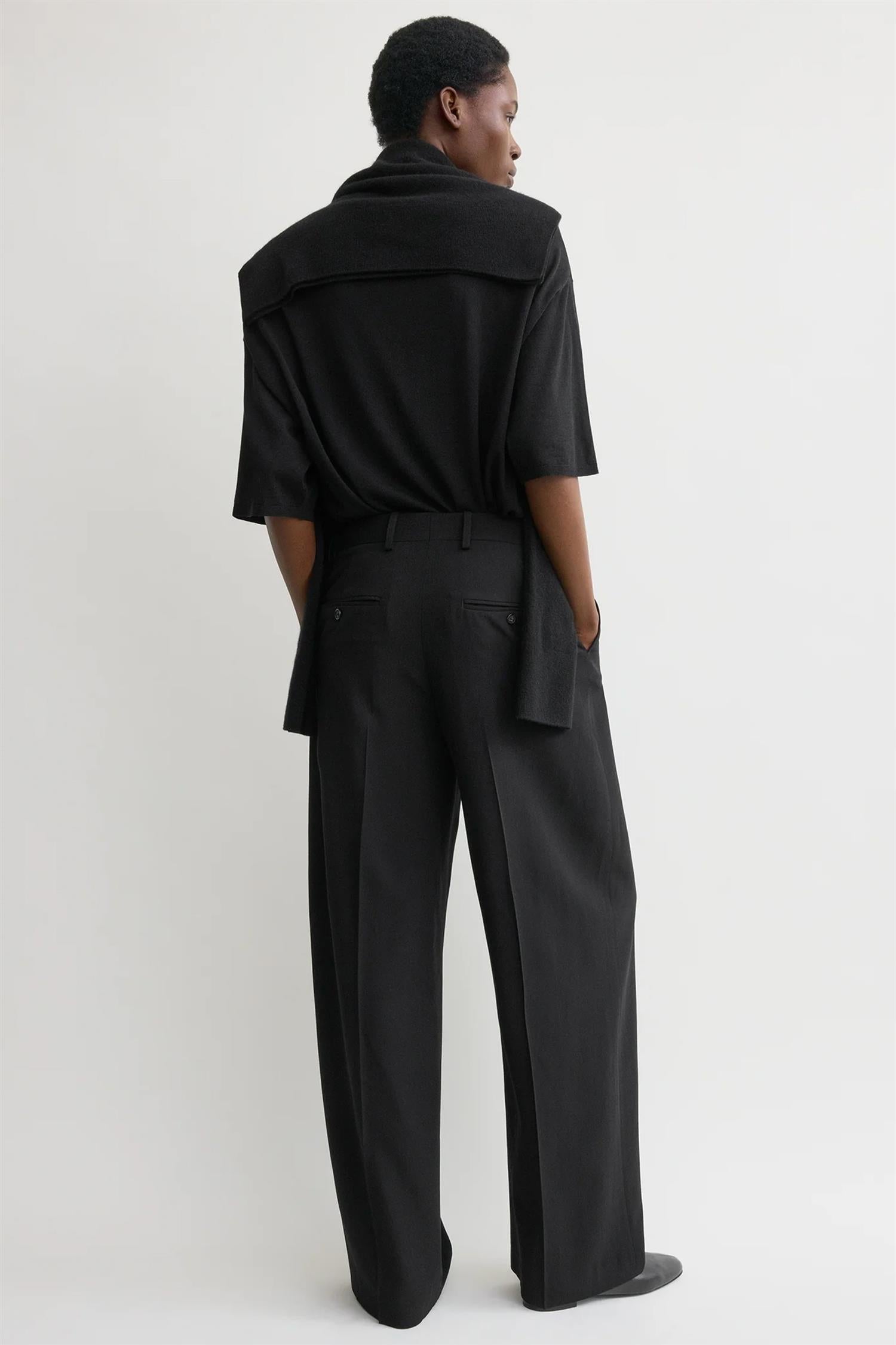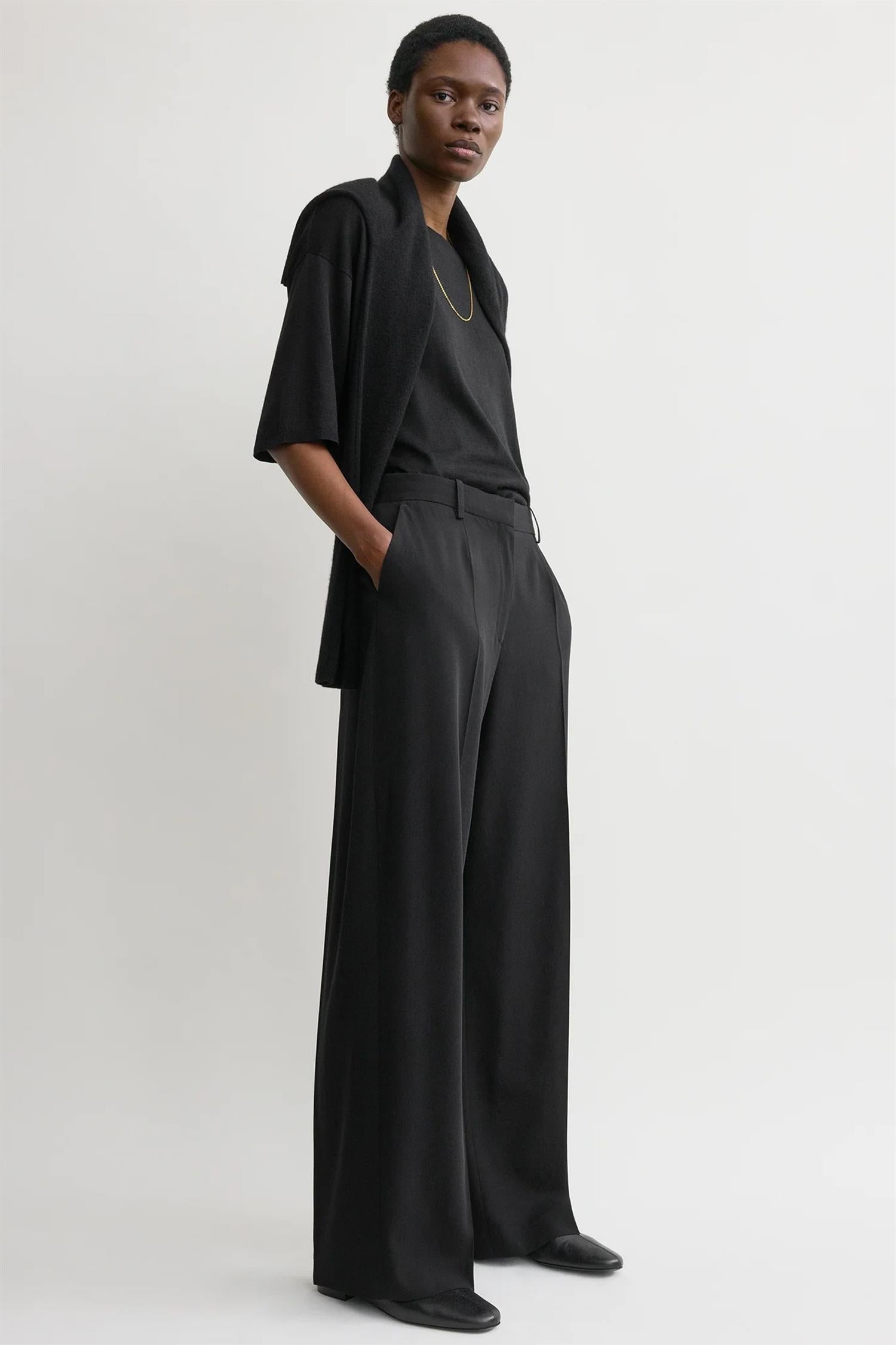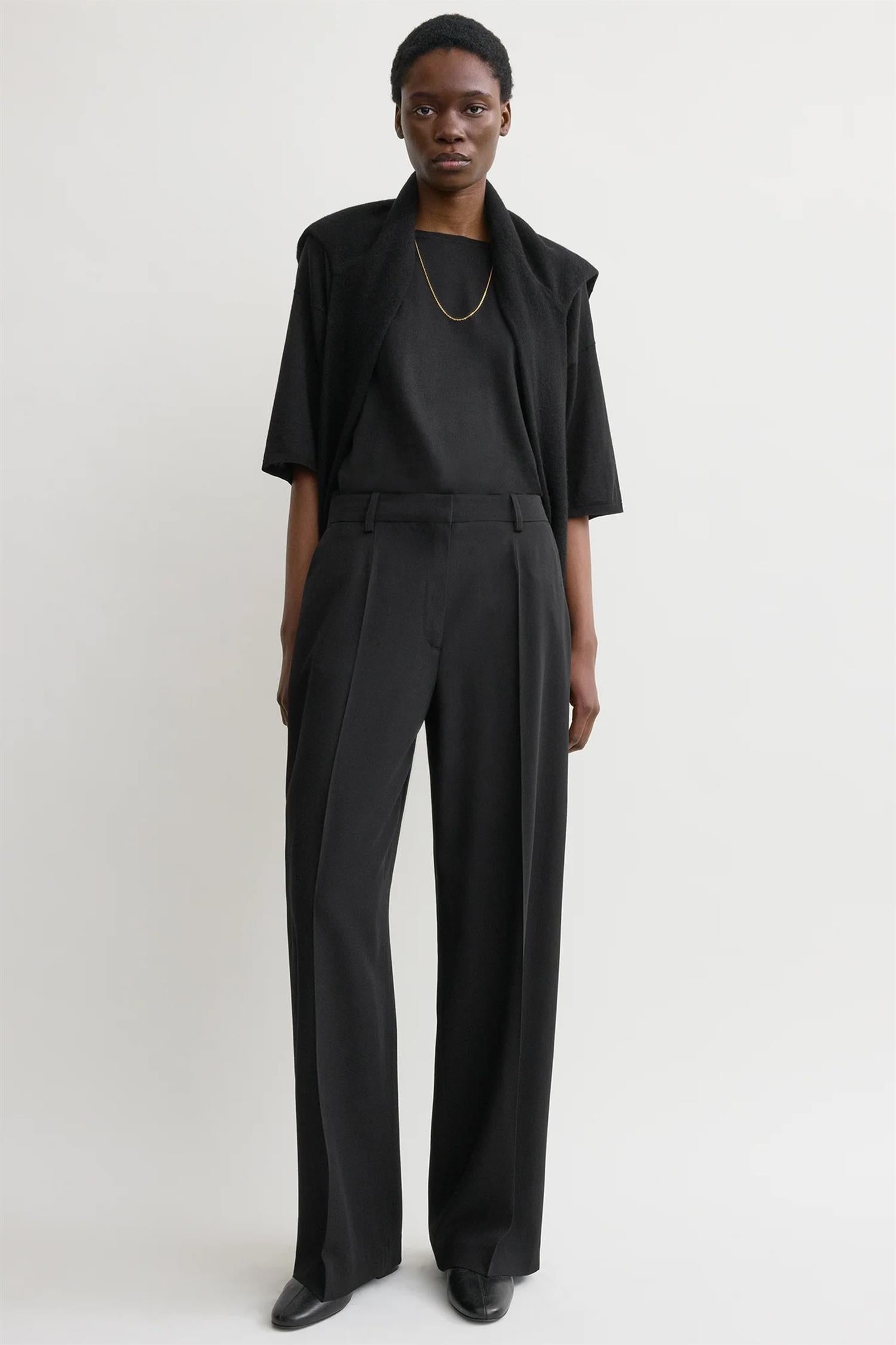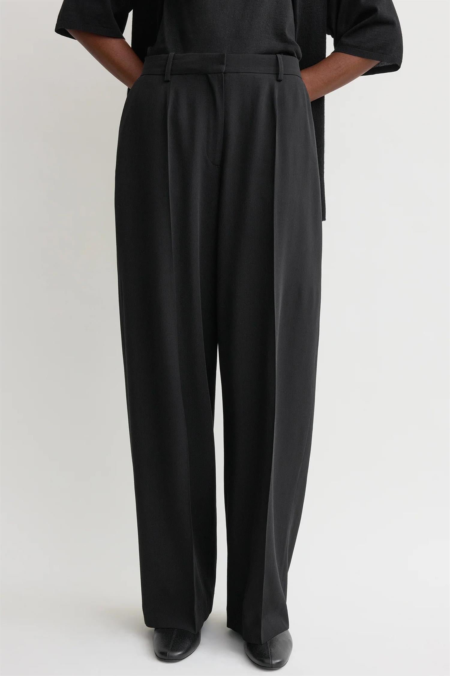 Wide fluid trousers fra Toteme er en elegant og klassisk dressbukse. Buksene er skreddersydd i en deilig viskose og ull blanding med en vid passform, lav midje og rene linjer.