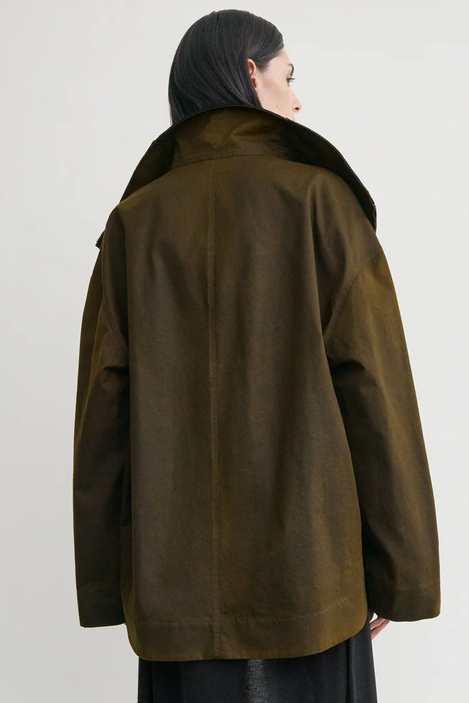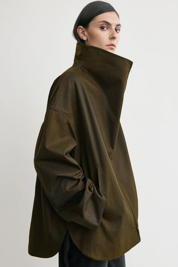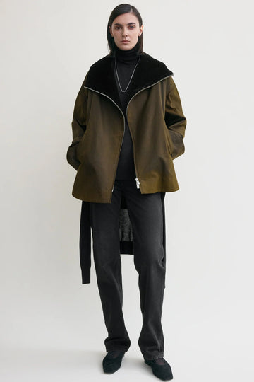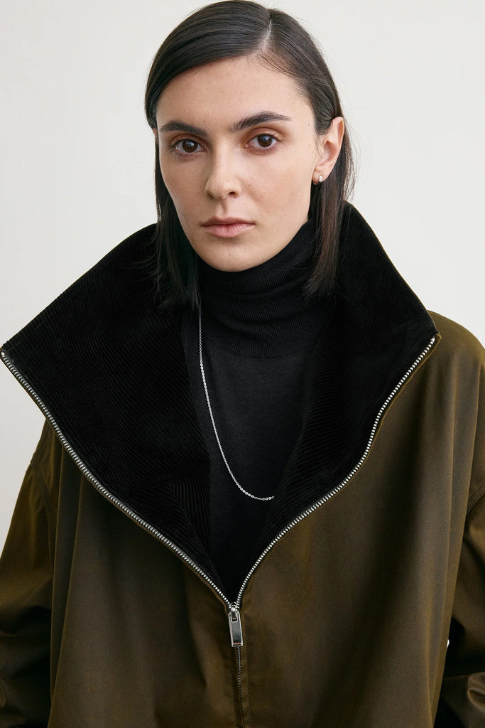 Zipped country jacket fra Toteme er en romslig jakke i en mørk skoggrønn farge, med brun kordfløyelskrage.