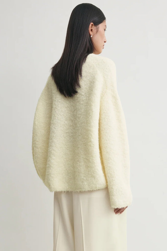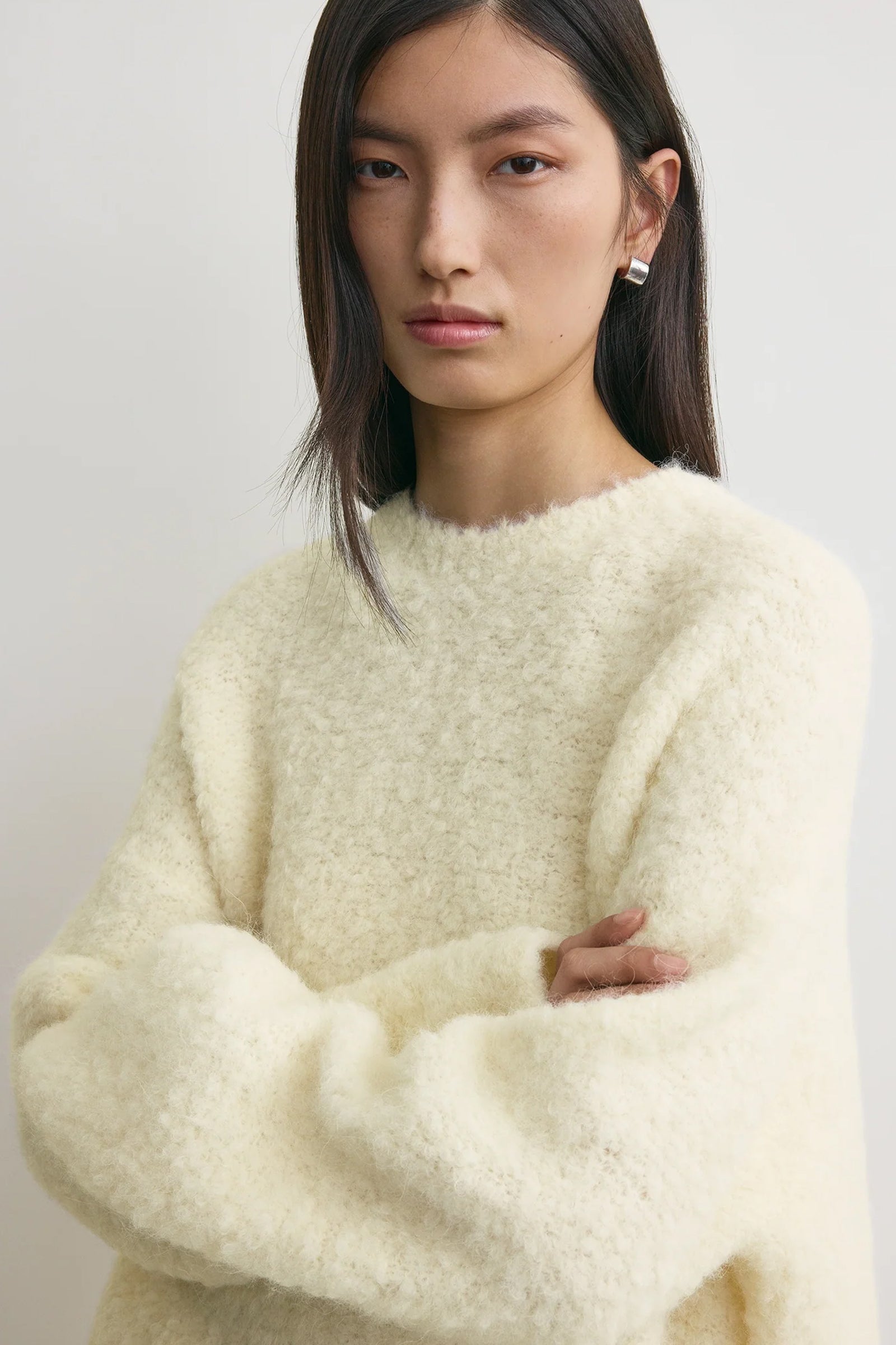 Boxy Bouclé Knit fra TOTEME er en signatur-genser strikket i en luftig blanding med alpaca-bouclé som gir en myk, tørr og plysj‐lignende tekstur. Silhuetten er dramatisk boxy med oversized proporsjoner og ekstra lange armer som gjør at plagget sklir sømløst mellom komfort og uttrykk.