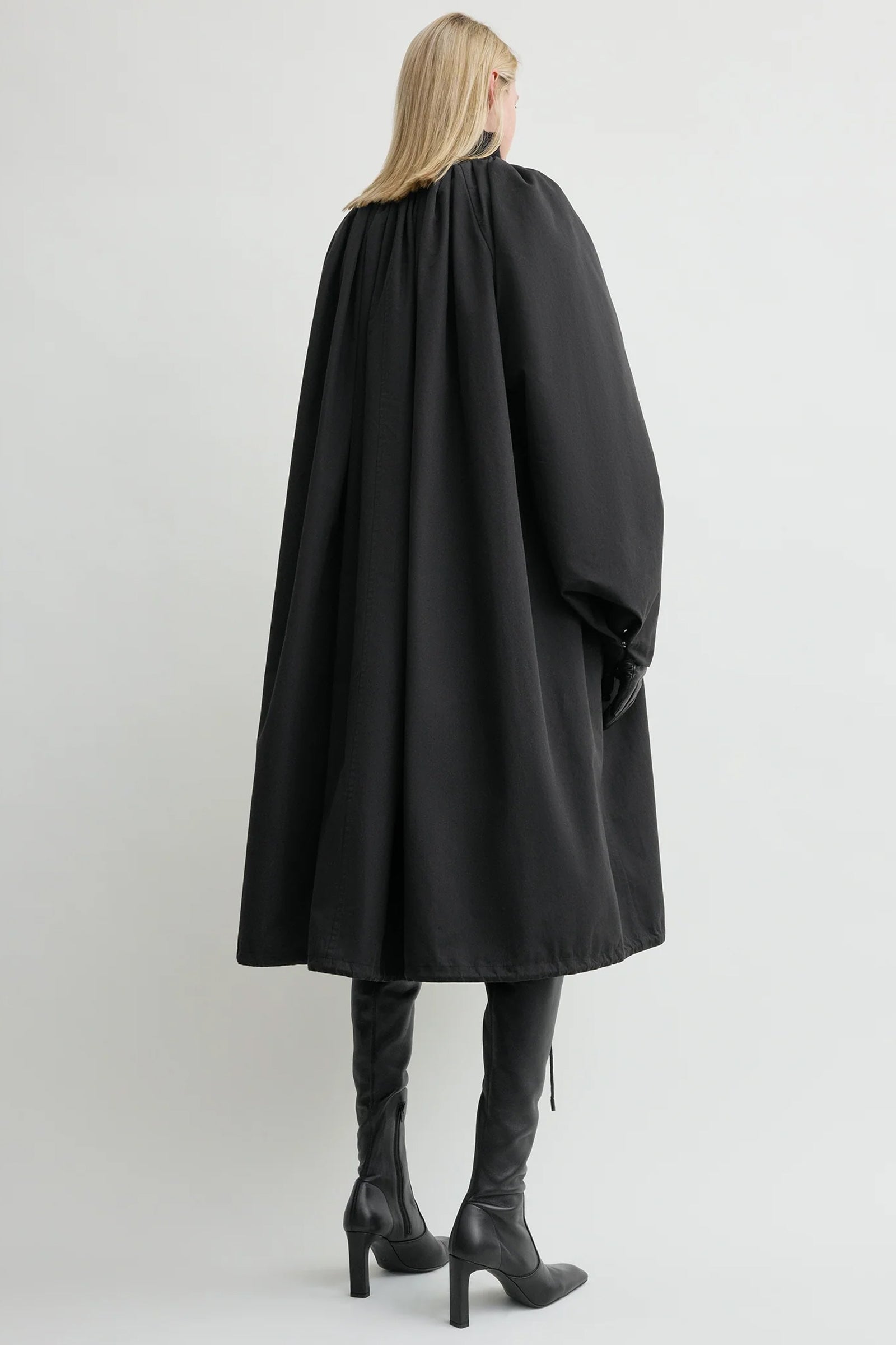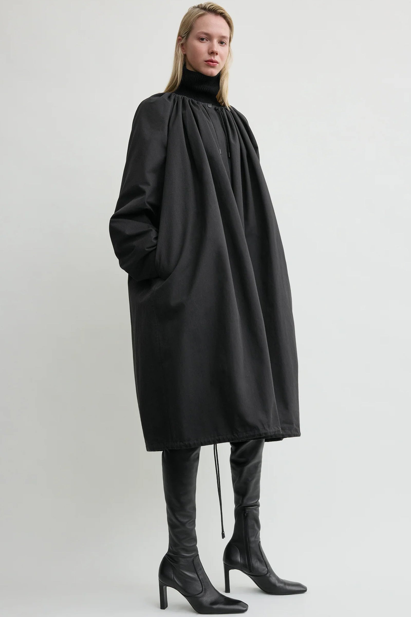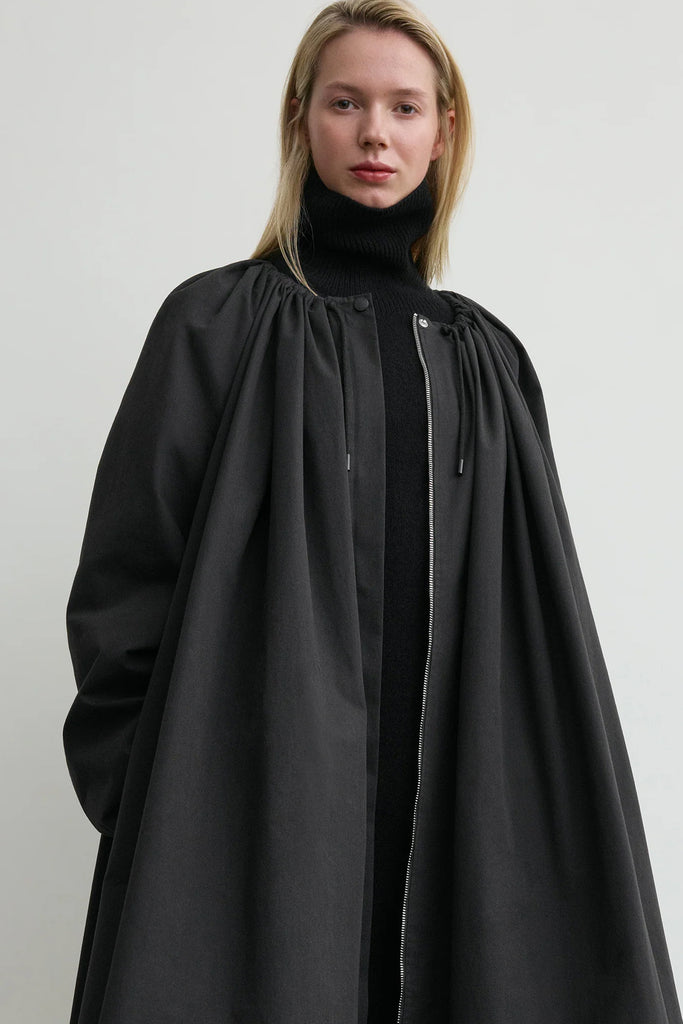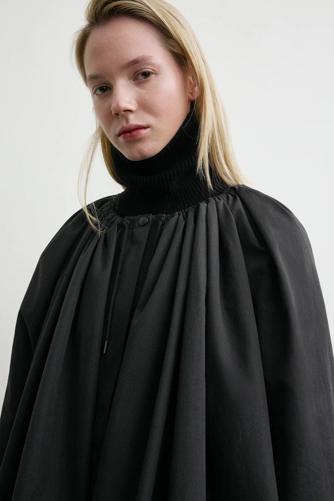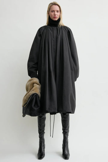 Gathered Parachute Coat fra TOTEME er hentet fra merkets Fall Winter 25 runway-kolleksjon og kombinerer elementer fra kokongfrakker og teknisk regntøy. Den har en romslig, parachute-inspirert silhuett som samles med snorer i hals og nederkant for å skape en dramatisk, voluminøs form.