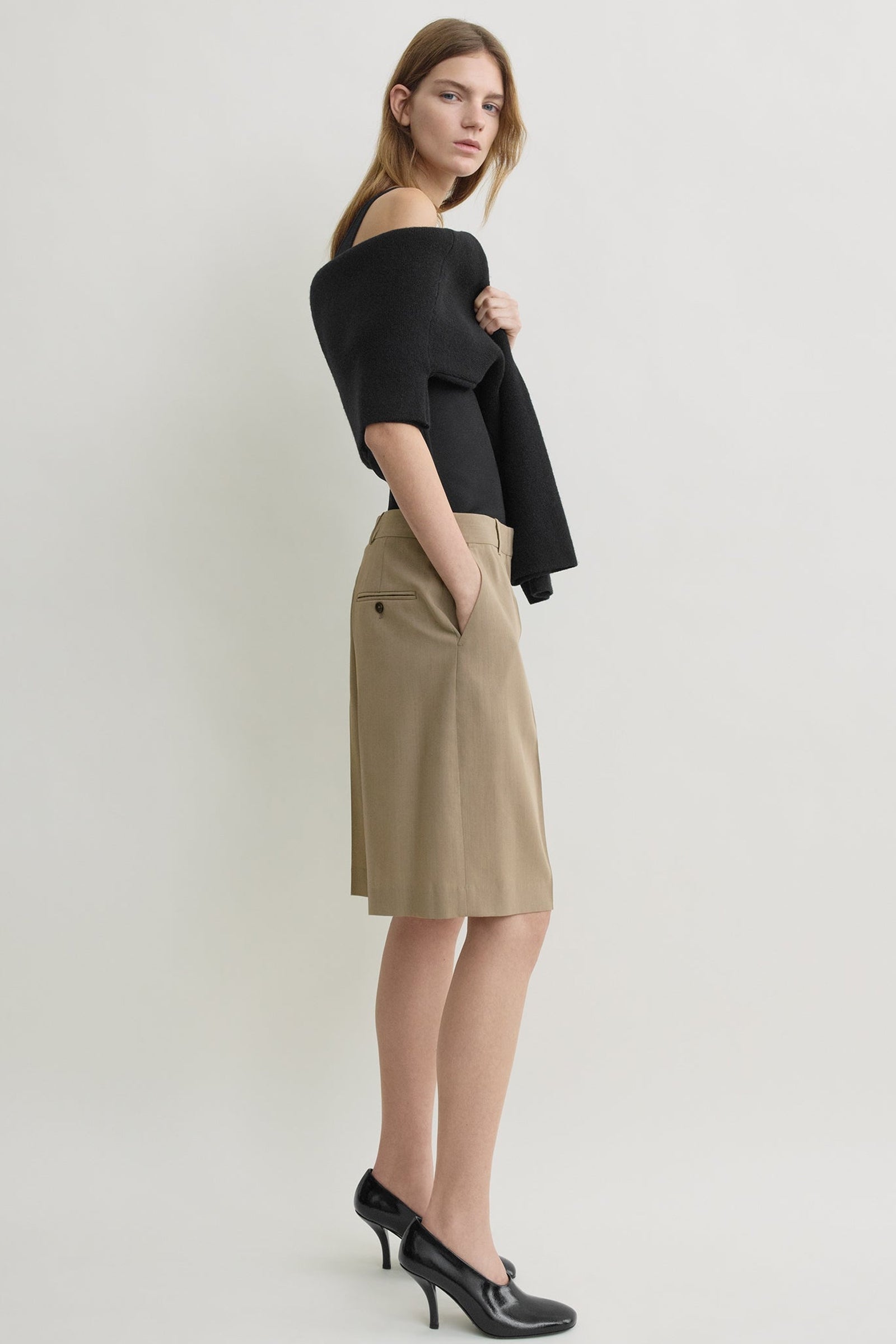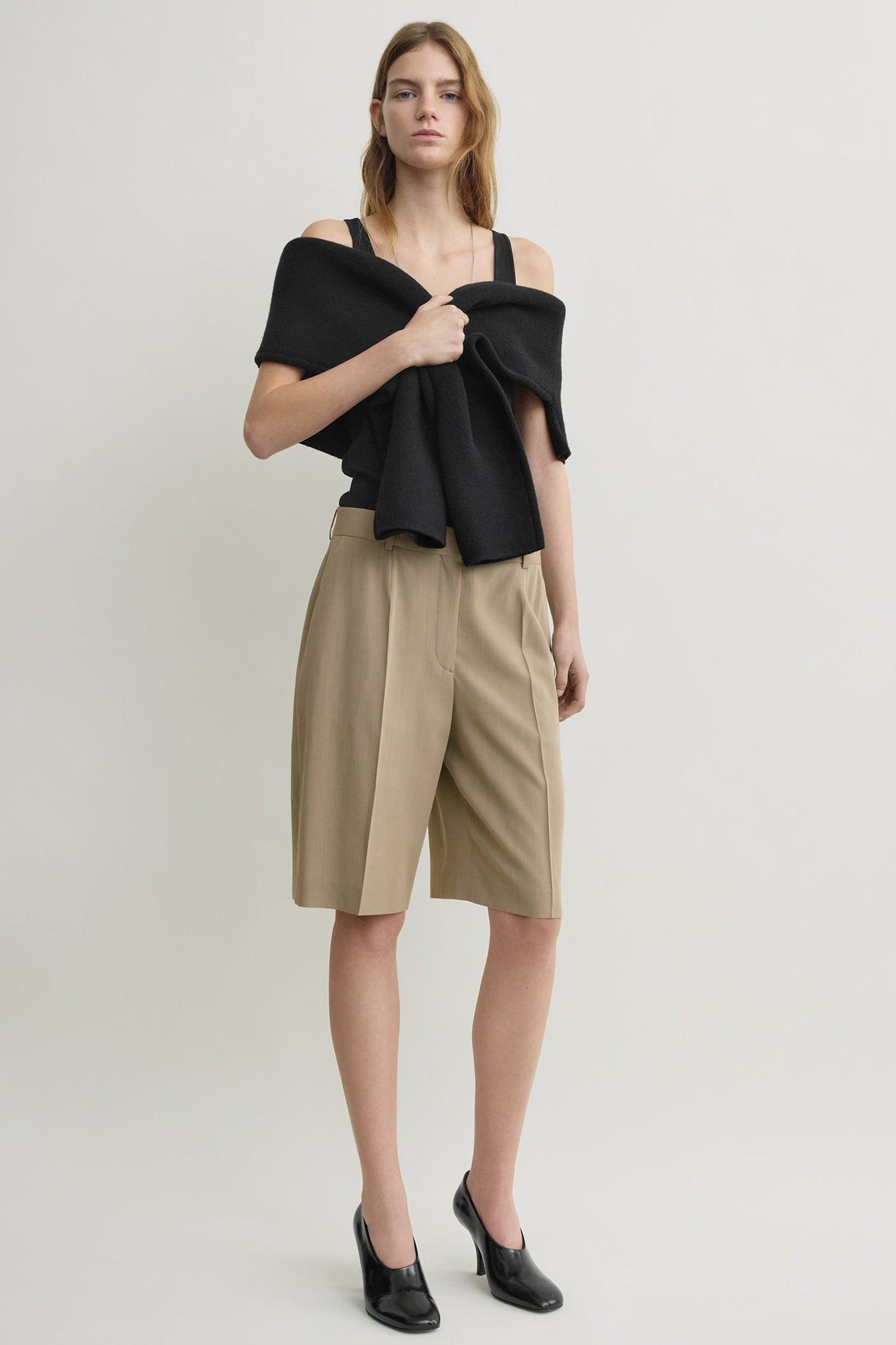Wide fluid shorts fra Toteme. Shortsen er en knelang variant av deres Wide, fluid bukser, kuttet til en skarp kant, avsluttet med tradisjonelle skreddersømdetaljer. To innfelte lommer bak, samt skrå lommer på sidene.