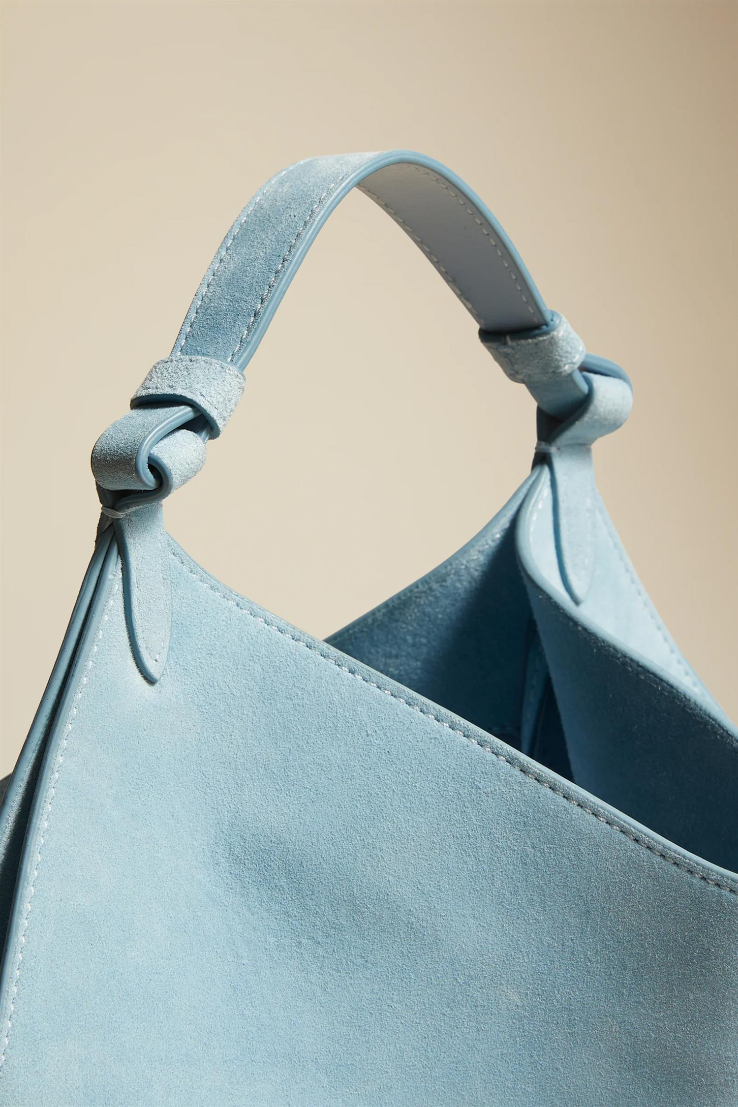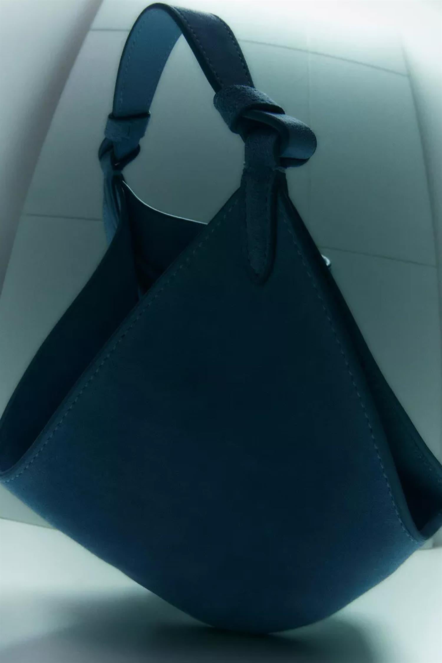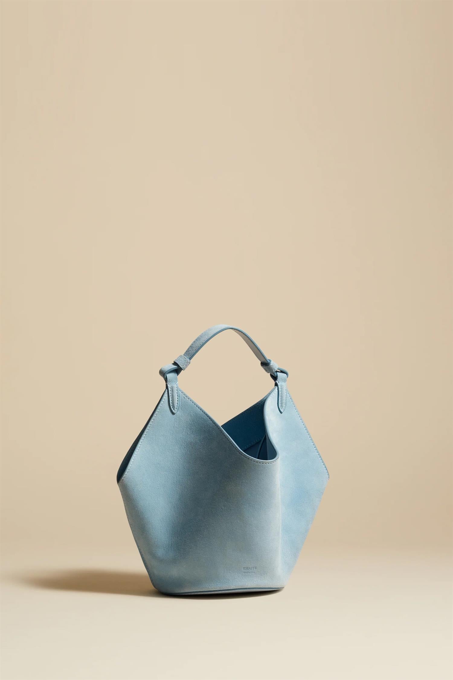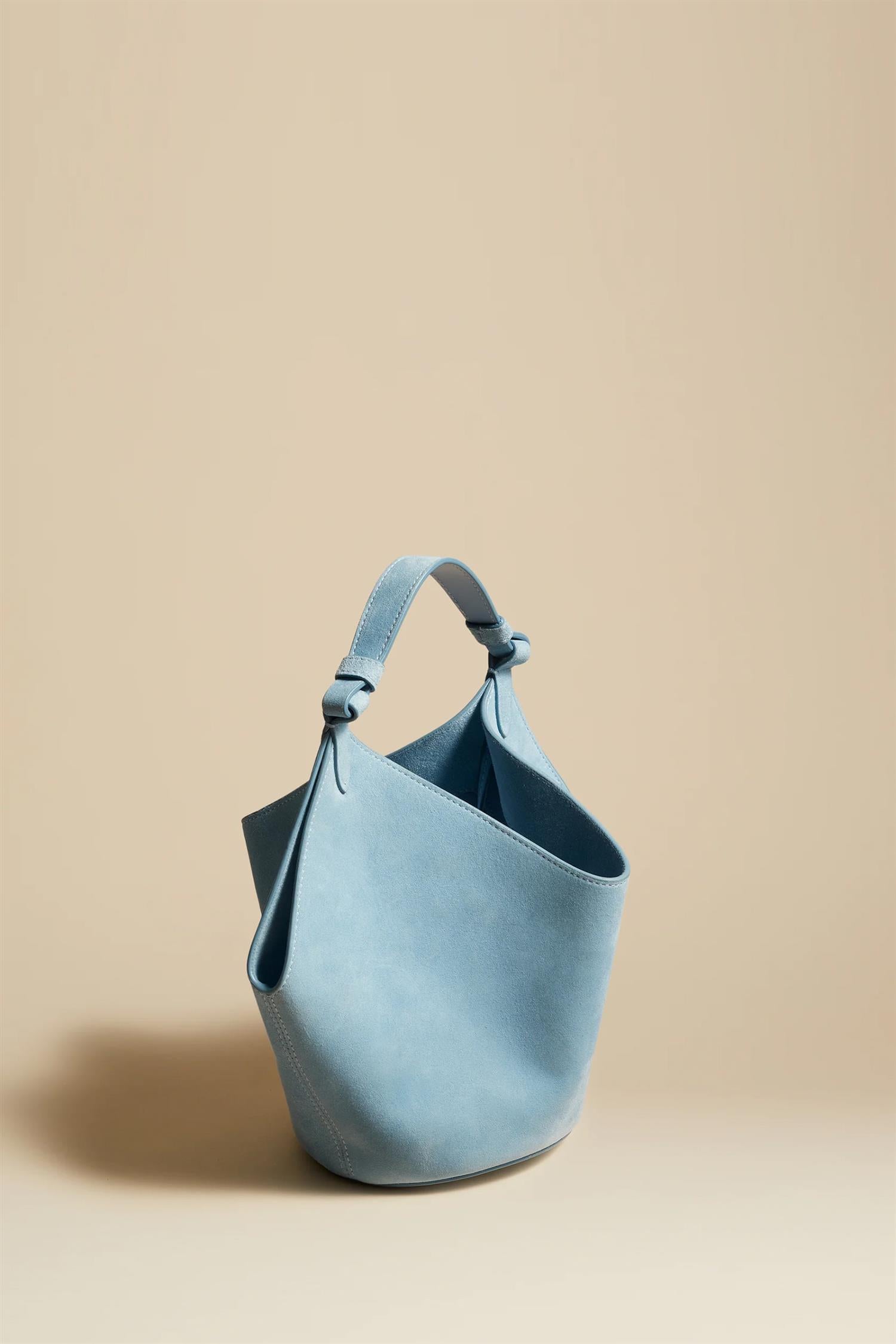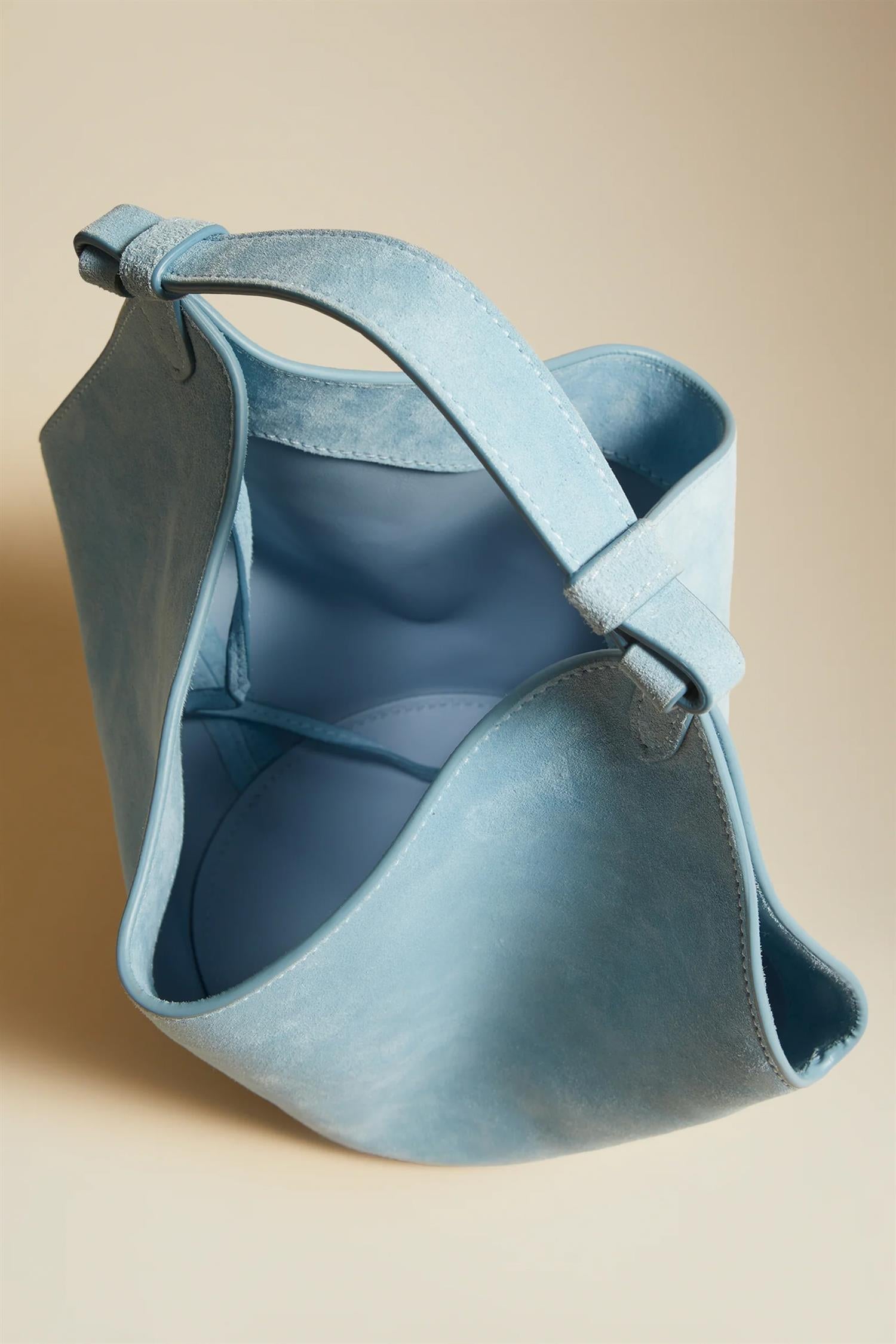 Myk og lett veske i semsket kalveskinn. Den har skulpturelle folder og myke kanter med lette sting. Den runde formen gjør at den står stabilt og den får plass til dine essensielle ting i hverdagen.