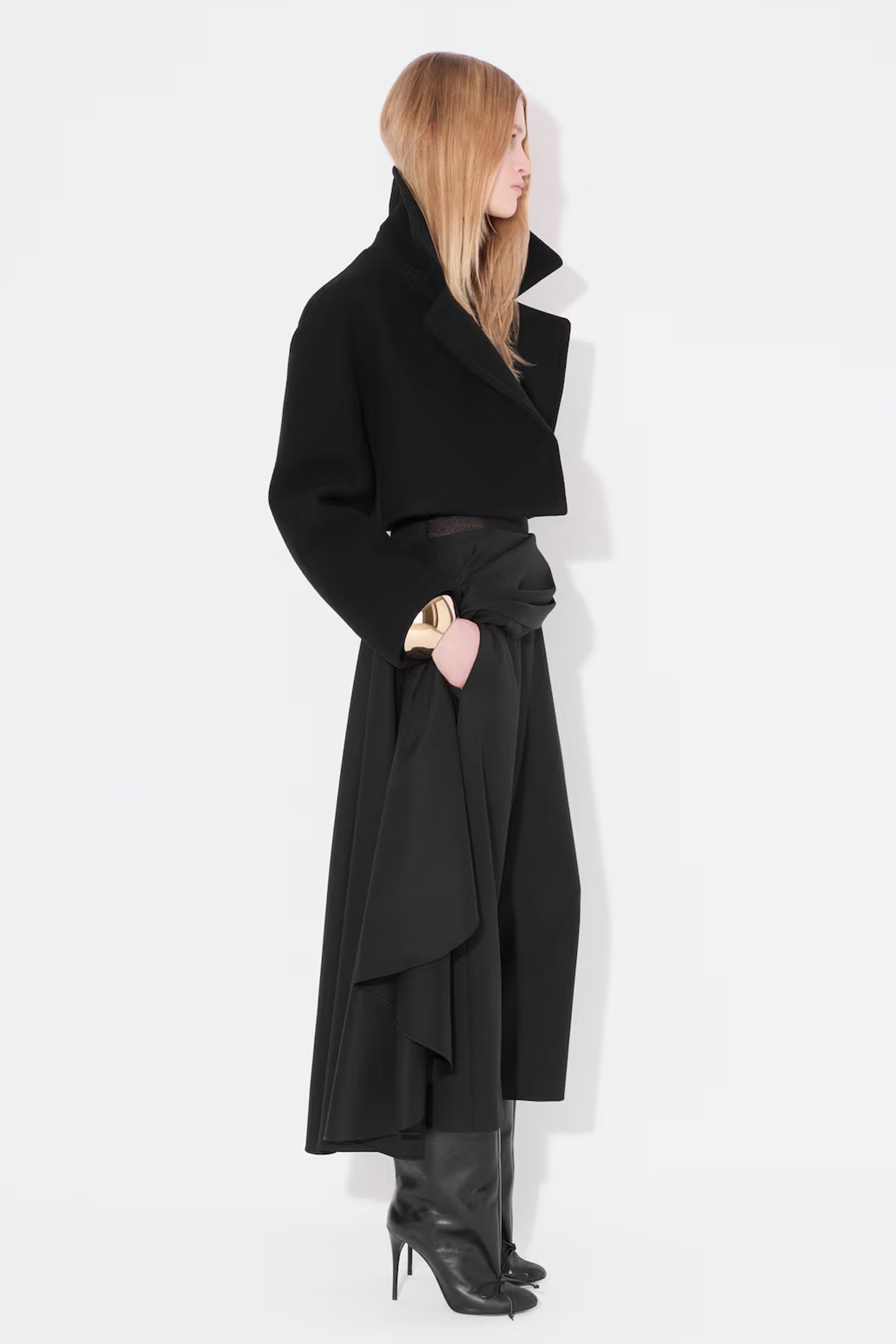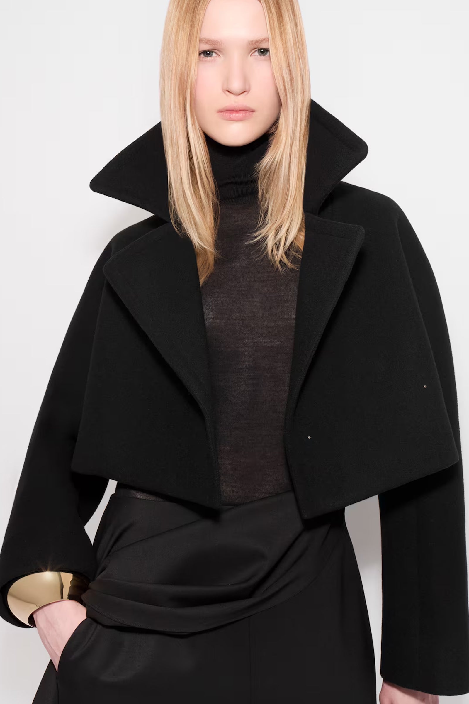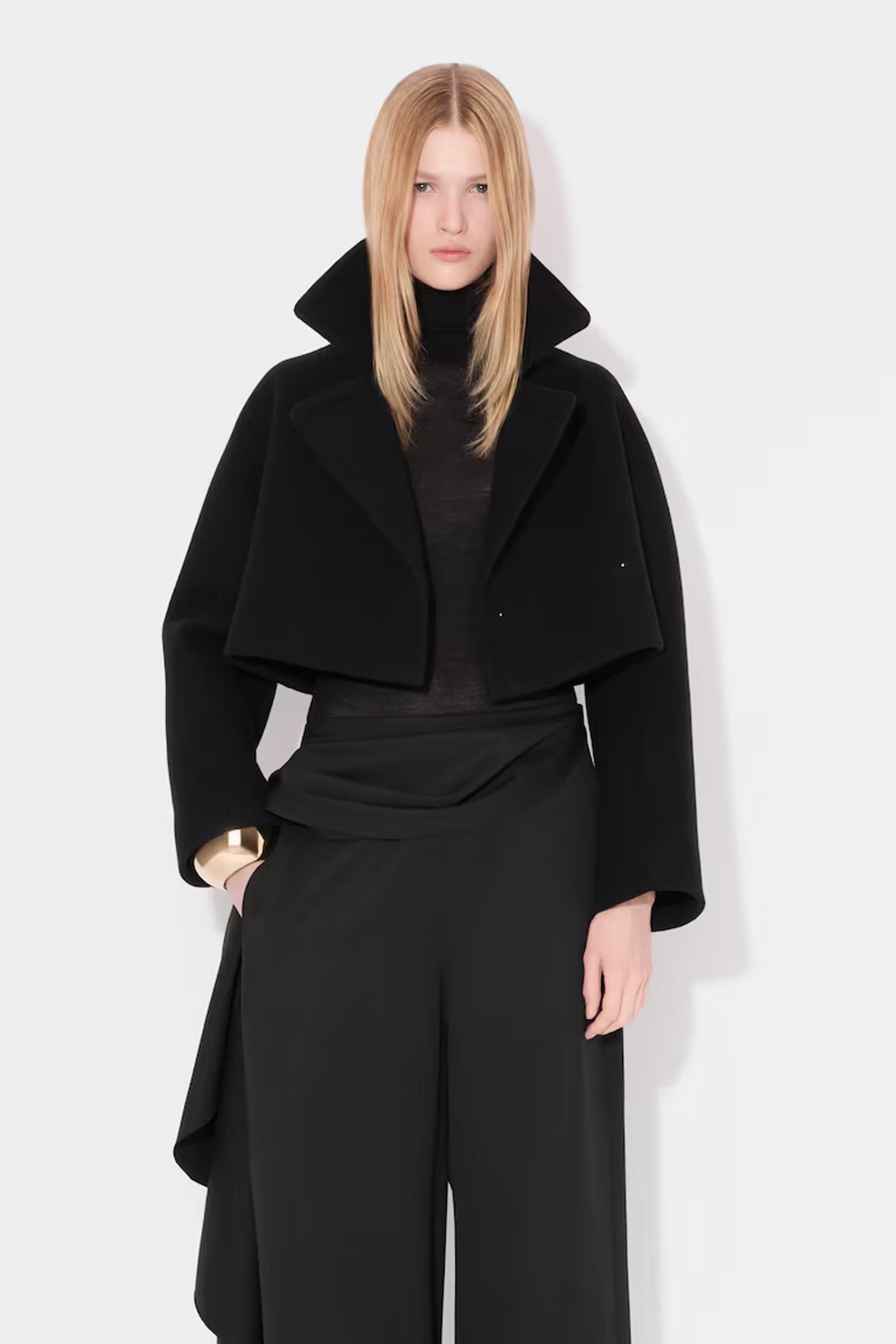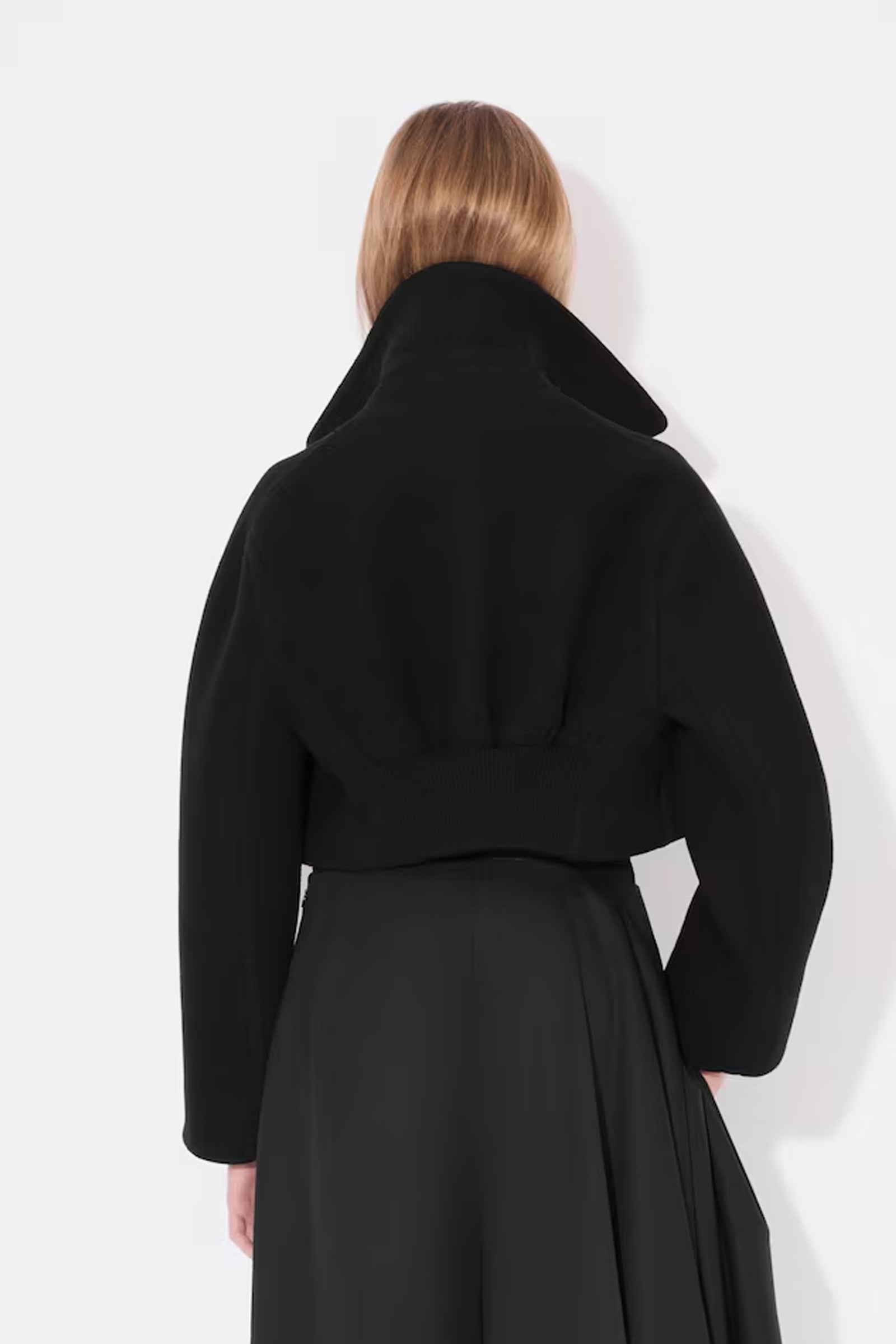 Denne eksklusive cropped caban-jakken fra Alaïa er et mesterverk innen design og håndverk. Med sin arkitektoniske doble krage gir jakken et sofistikert og moderne uttrykk som umiddelbart fanger oppmerksomheten. Laget av dobbeltsidig ull, tilbyr den både komfort og varme, samtidig som den opprettholder en elegant silhuett.