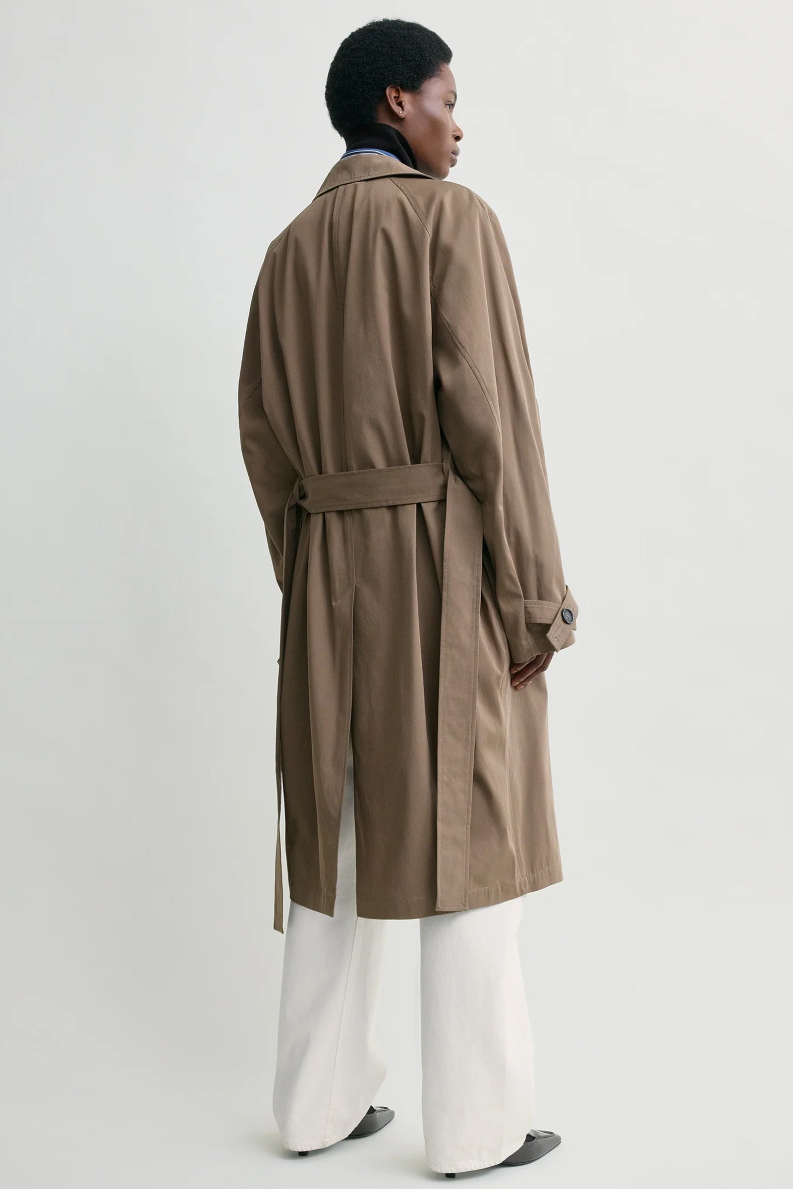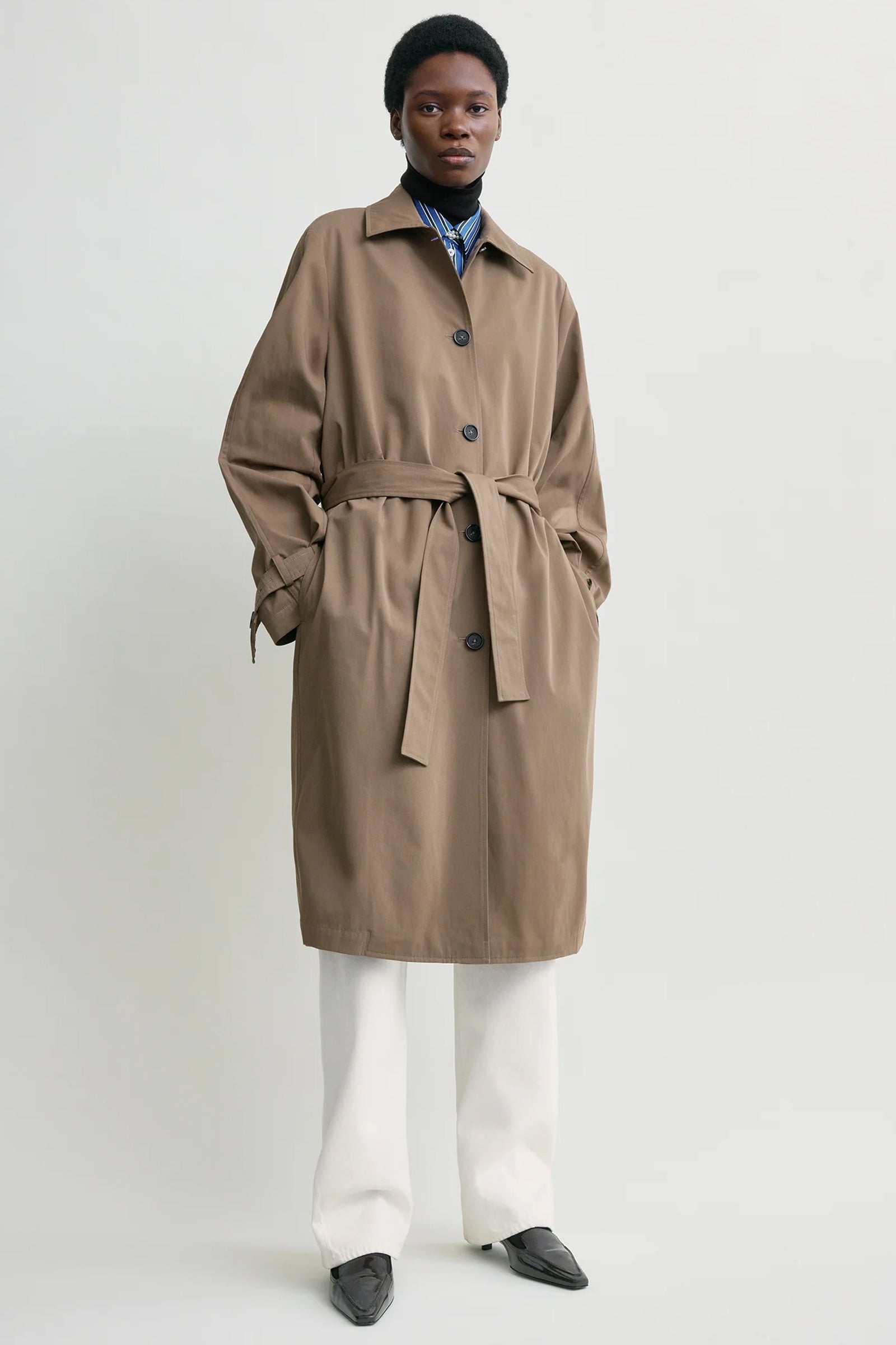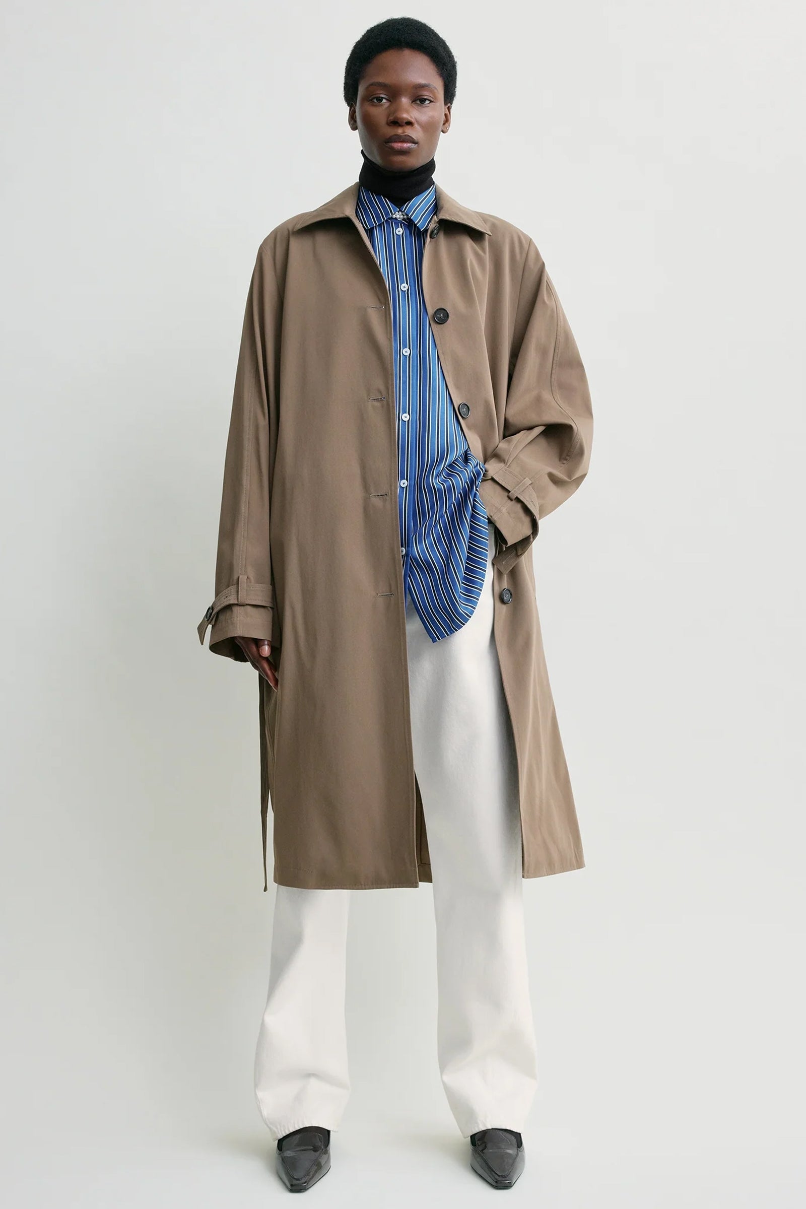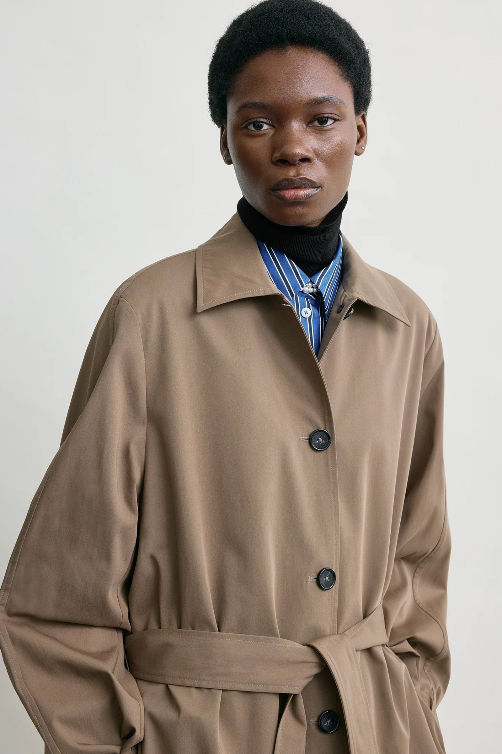 En lett trenchcoat fra Toteme i sesongens hazel farge for et tidløst utseende. Jakken er i en lett bomull, med knapper foran og kan strammes i midjen med et matchende belte. Den har en oversized og rett silhuett som er avslappet. Style i overgangssesongene med kasjmirgenser og jeans og over skjørt og kjoler på varmere dager.