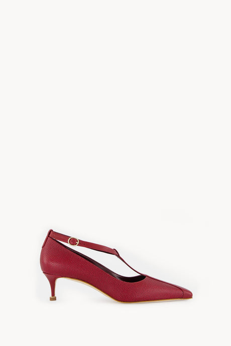 Rosellon fra Manolo Blahnik balanserer glatt og teksturert skinn i elegante rødtoner. Designet med en justerbar T-stropp, mandelformet tå og en 50mm hæl.