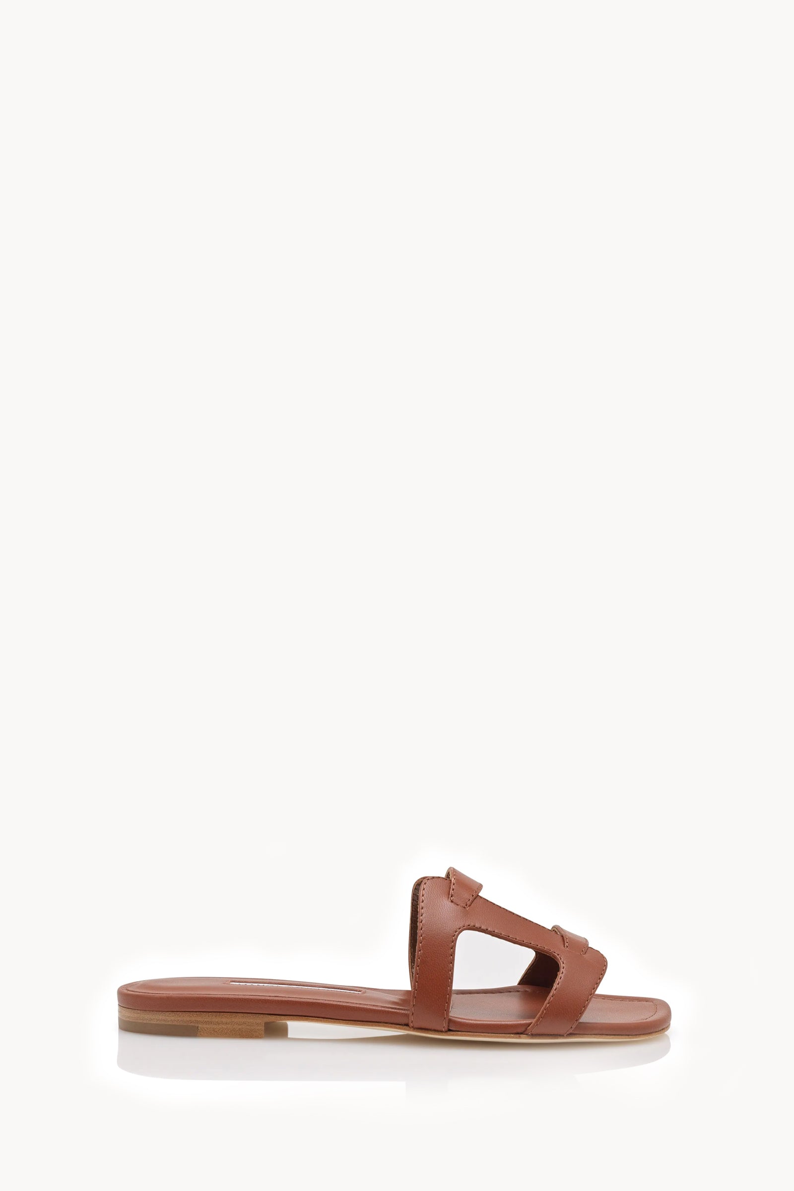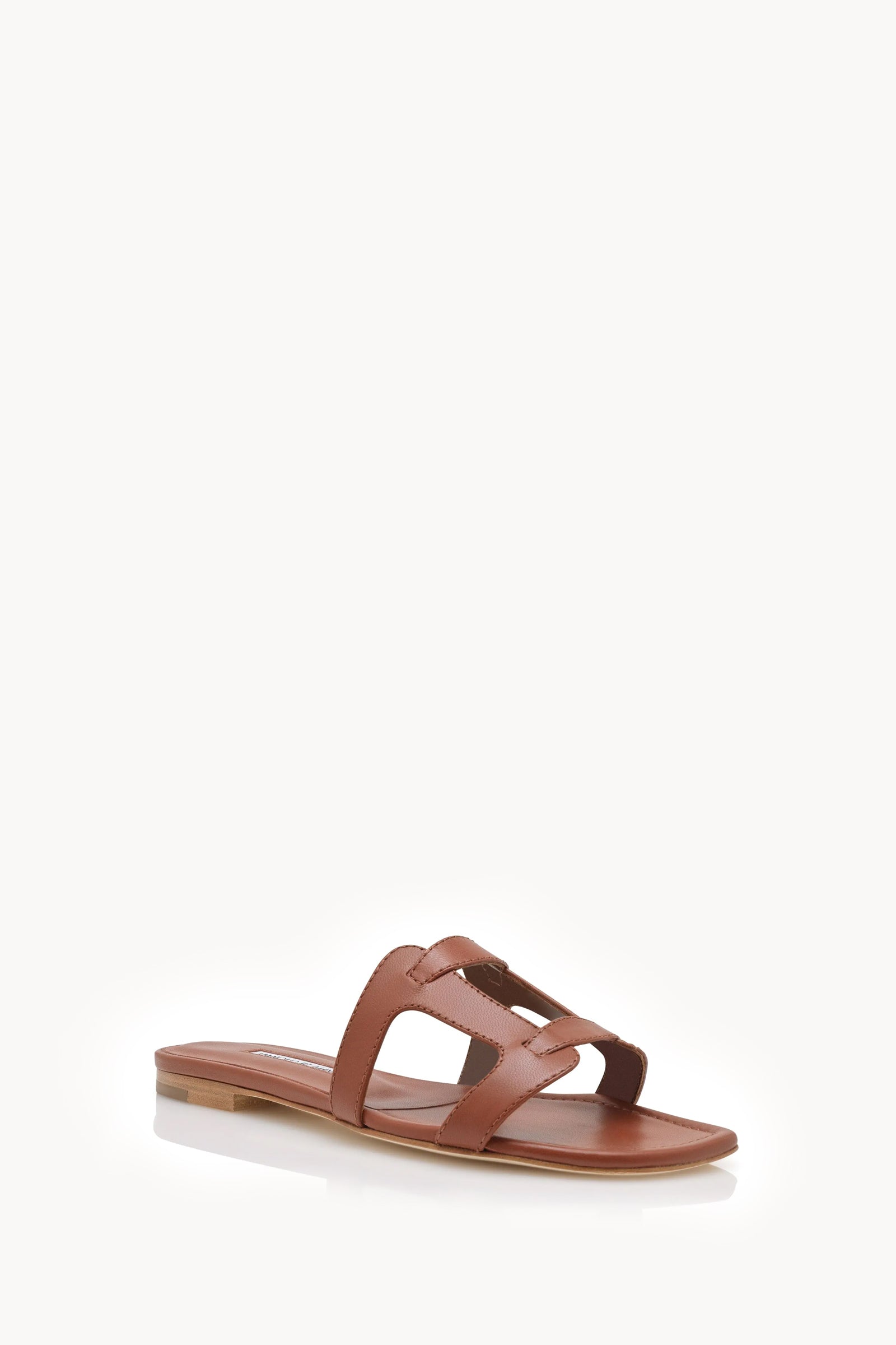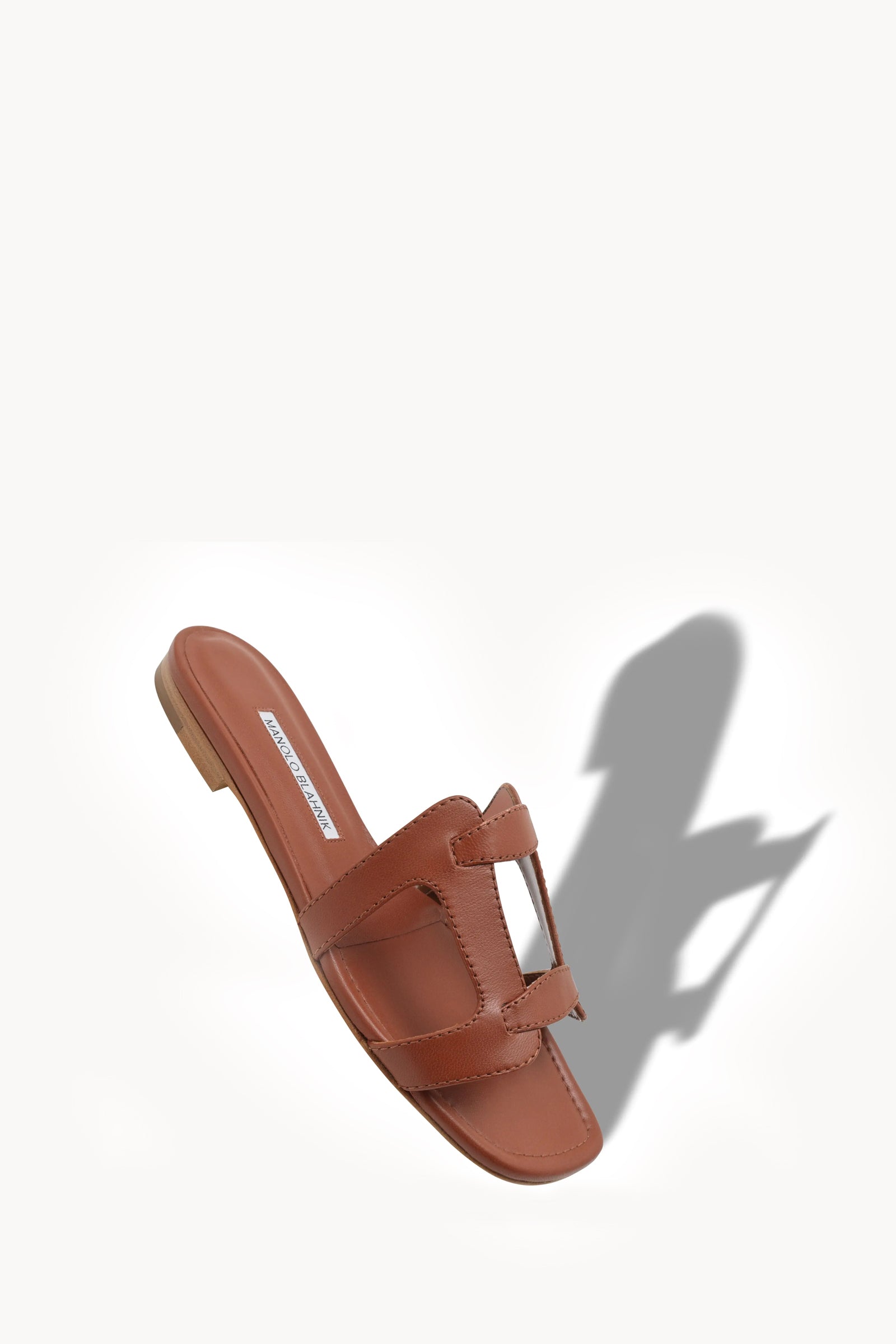 Brune, flate sandaler i nappaskinn med åpen tå, vristrem med utskåret design og sømdetaljer.