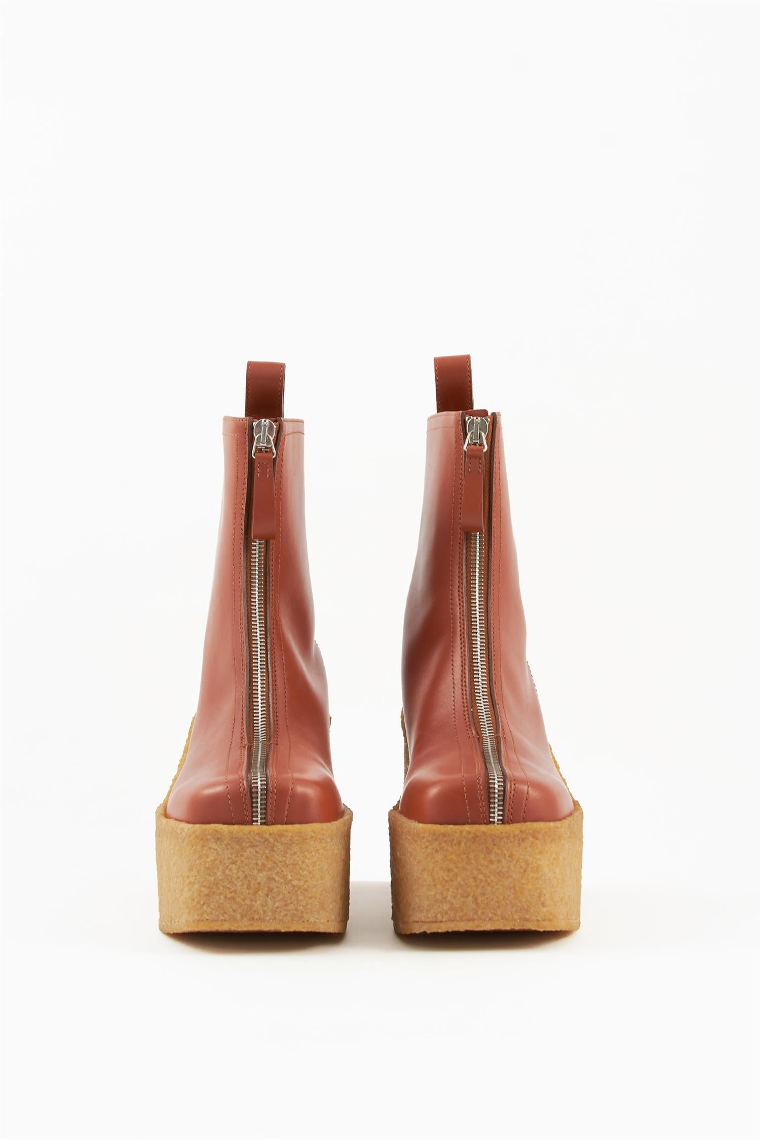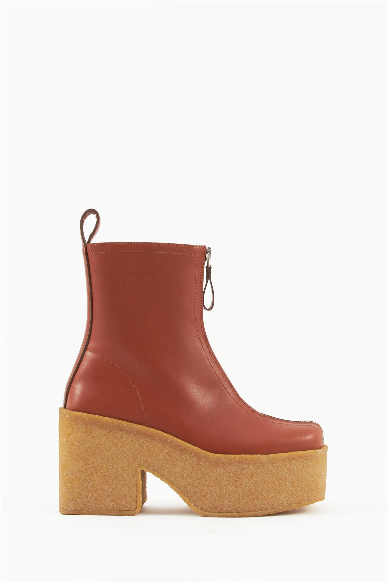 Kraftige ankelstøvletter i gummi og skinn. Disse bootsene er et blikkfang, inspirert av 70-tallets lekne stil. De lukkes med en dekorativ glidelås i front, har firkantet tå og en kraftig plattform-såle i robust gummi.