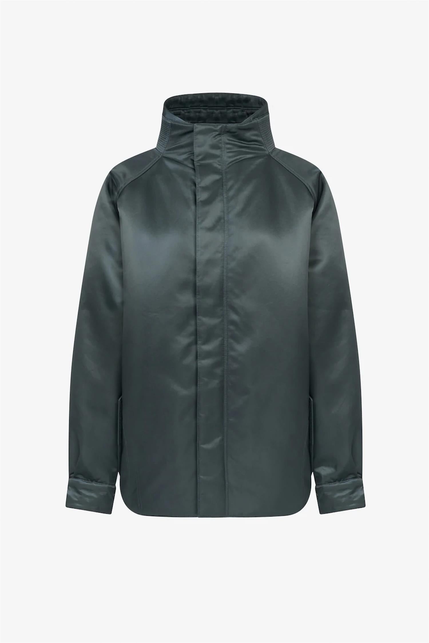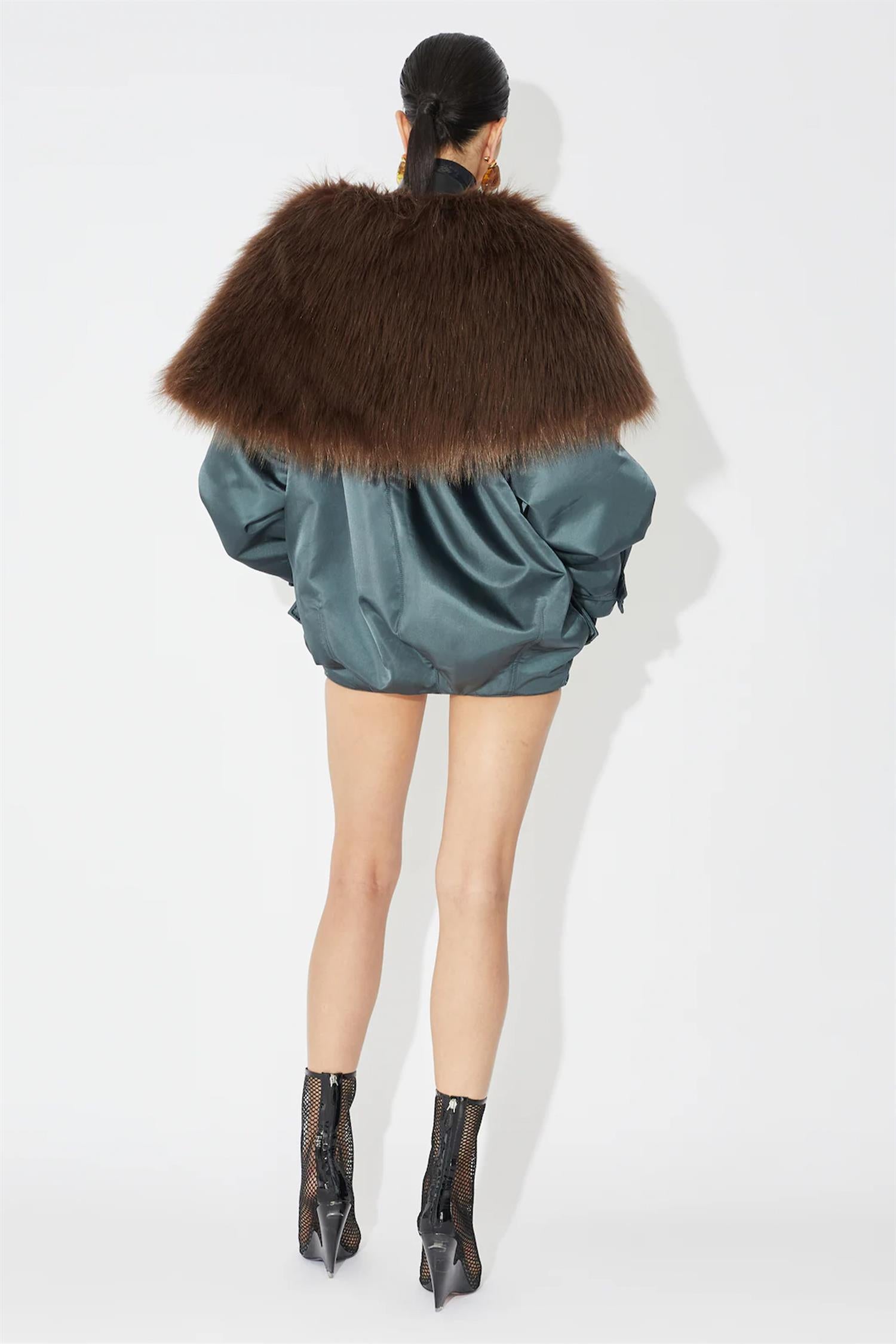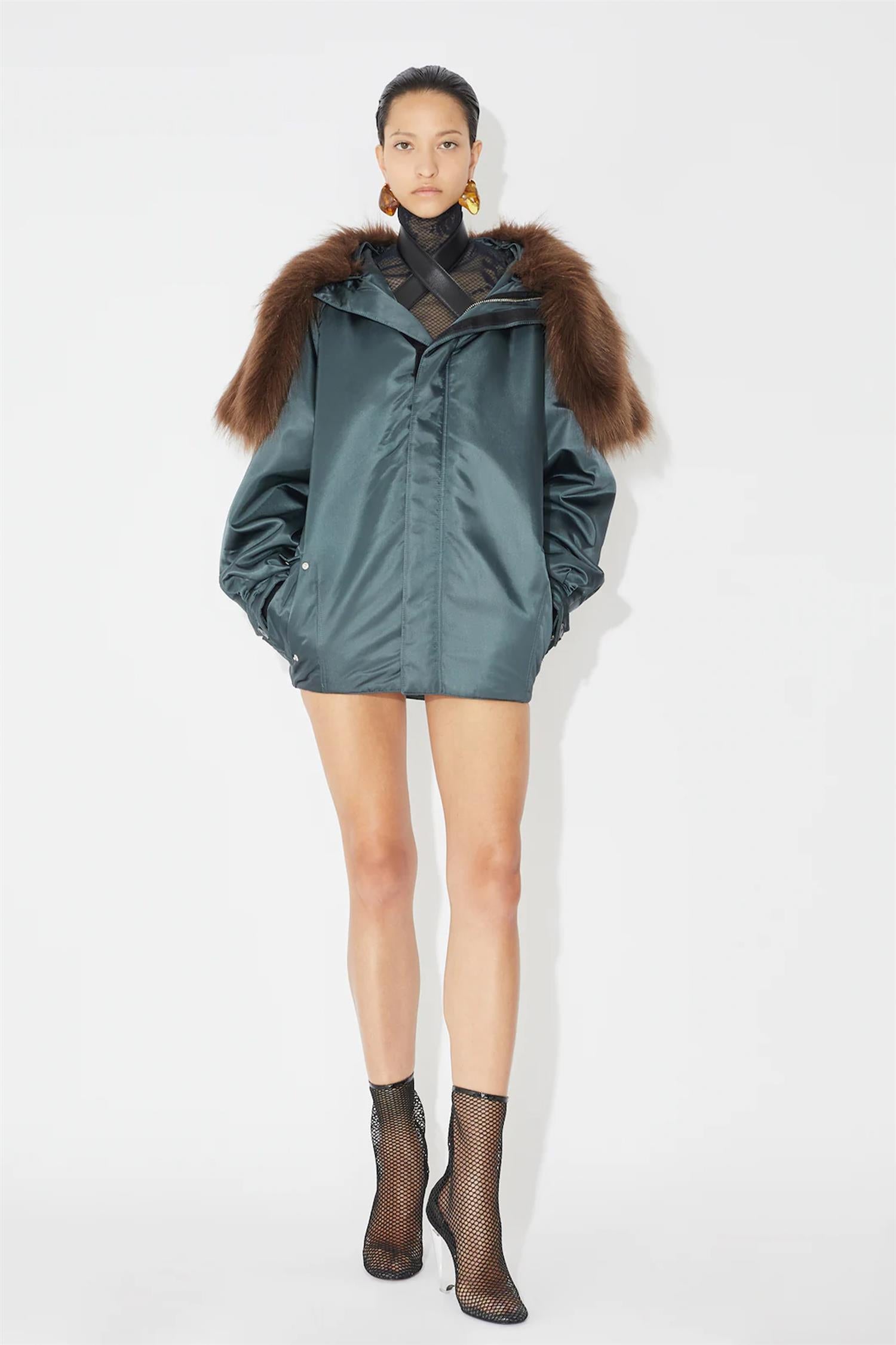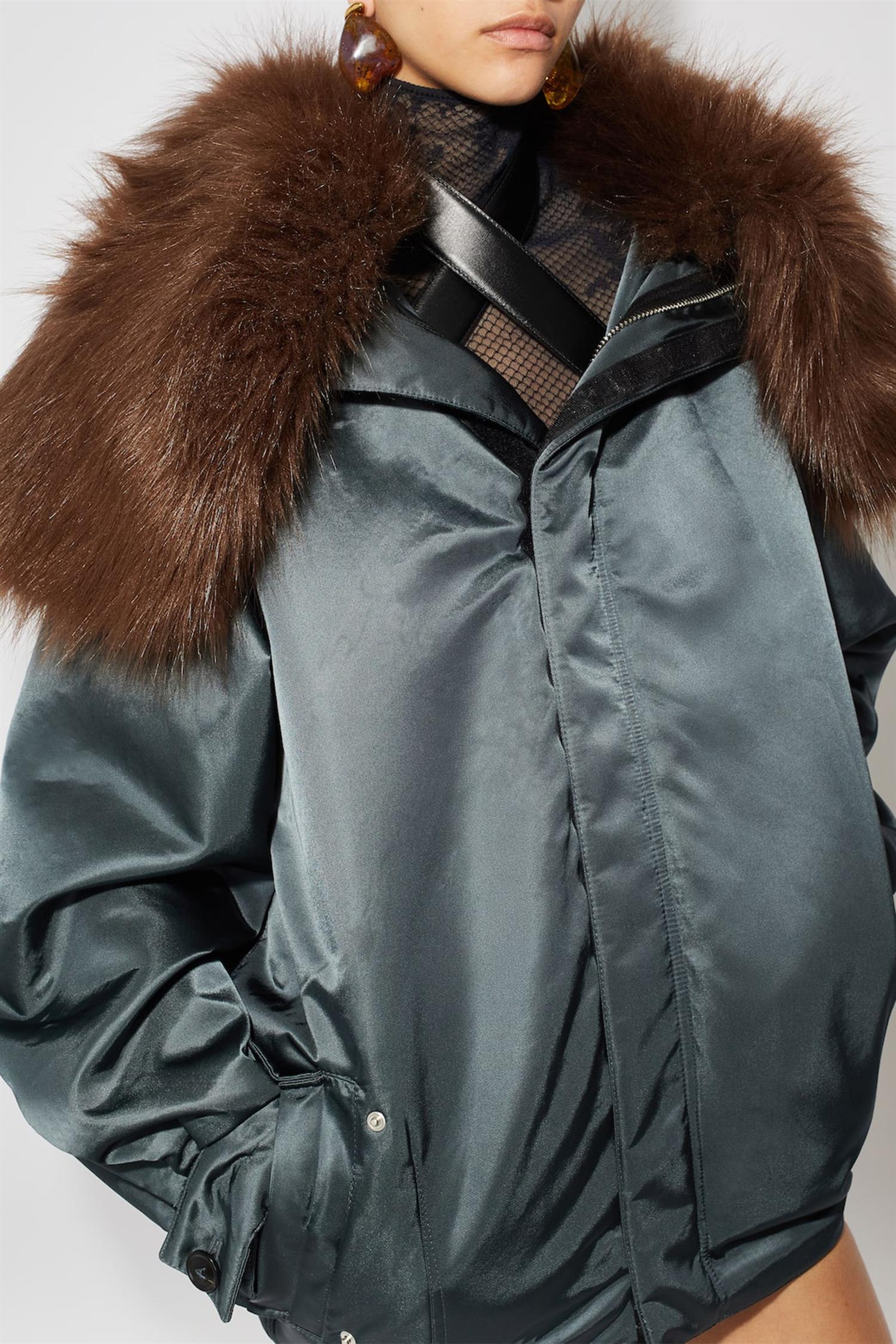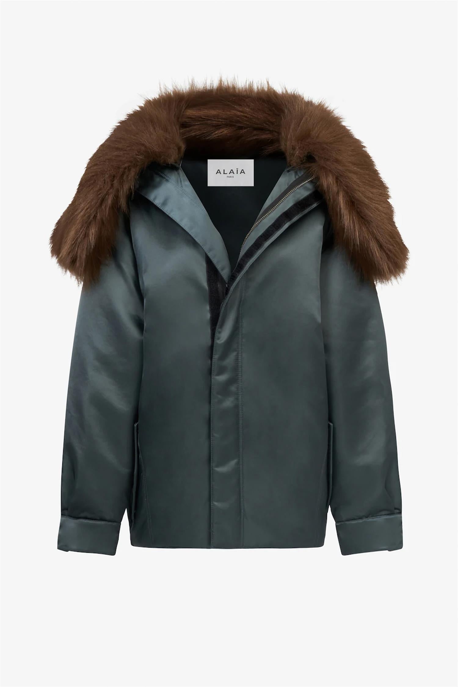 Oversized jakke med klassiske bomber-detaljer. Den har et elegant silhuett i klassisk Alaïa-stil med en shiny overfalte i en nydelig, grønn farge. Kraven i faux fur gir ekstra volum til jakken, samtidig som den er en spennende og iøyenfallende detalj mot det blanke stoffet. Kraven kan også tas av.